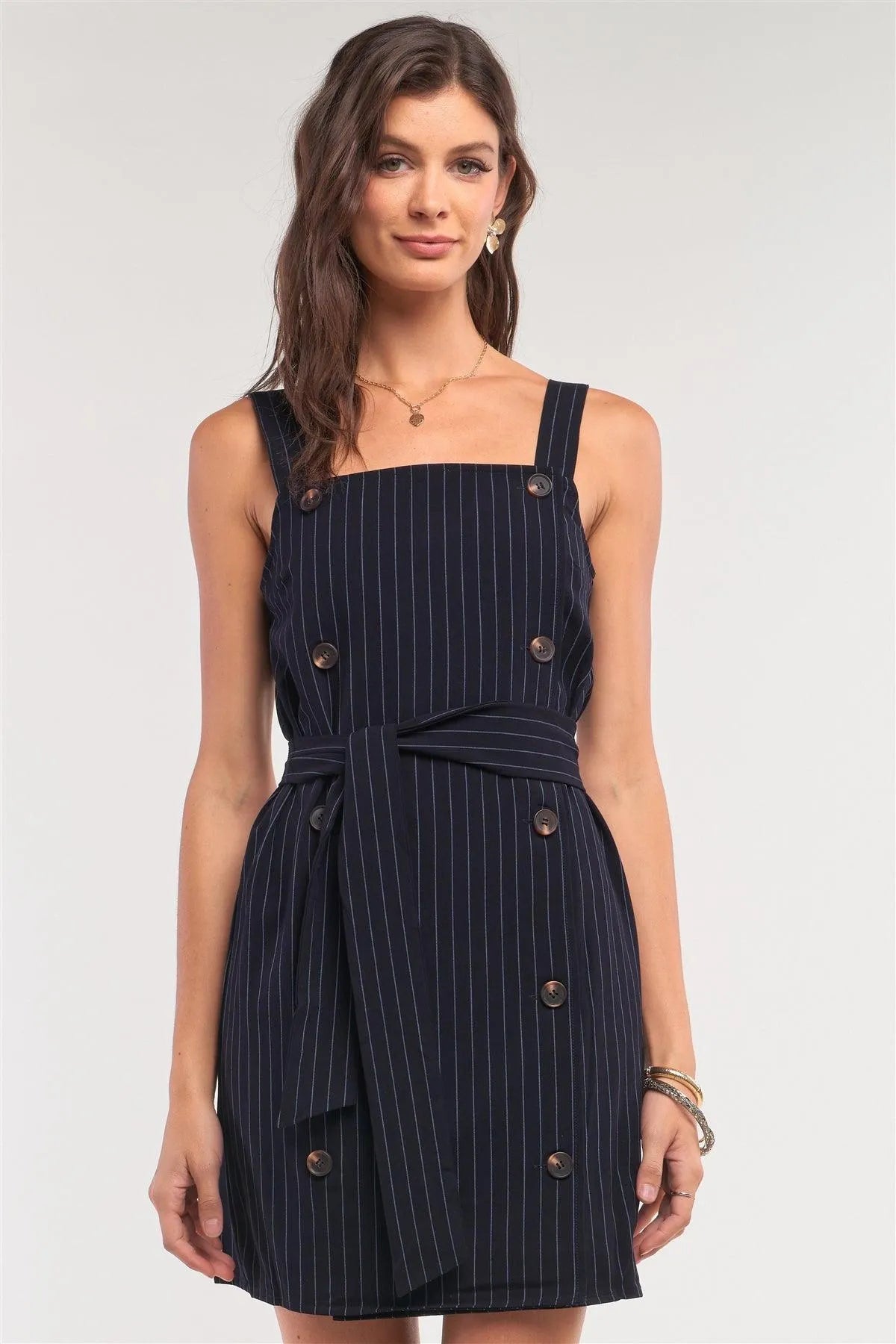 Navy Pinstriped Sleeveless Square Neck Double Breasted Self-Tie Belt Detail Fitted Mini Dress