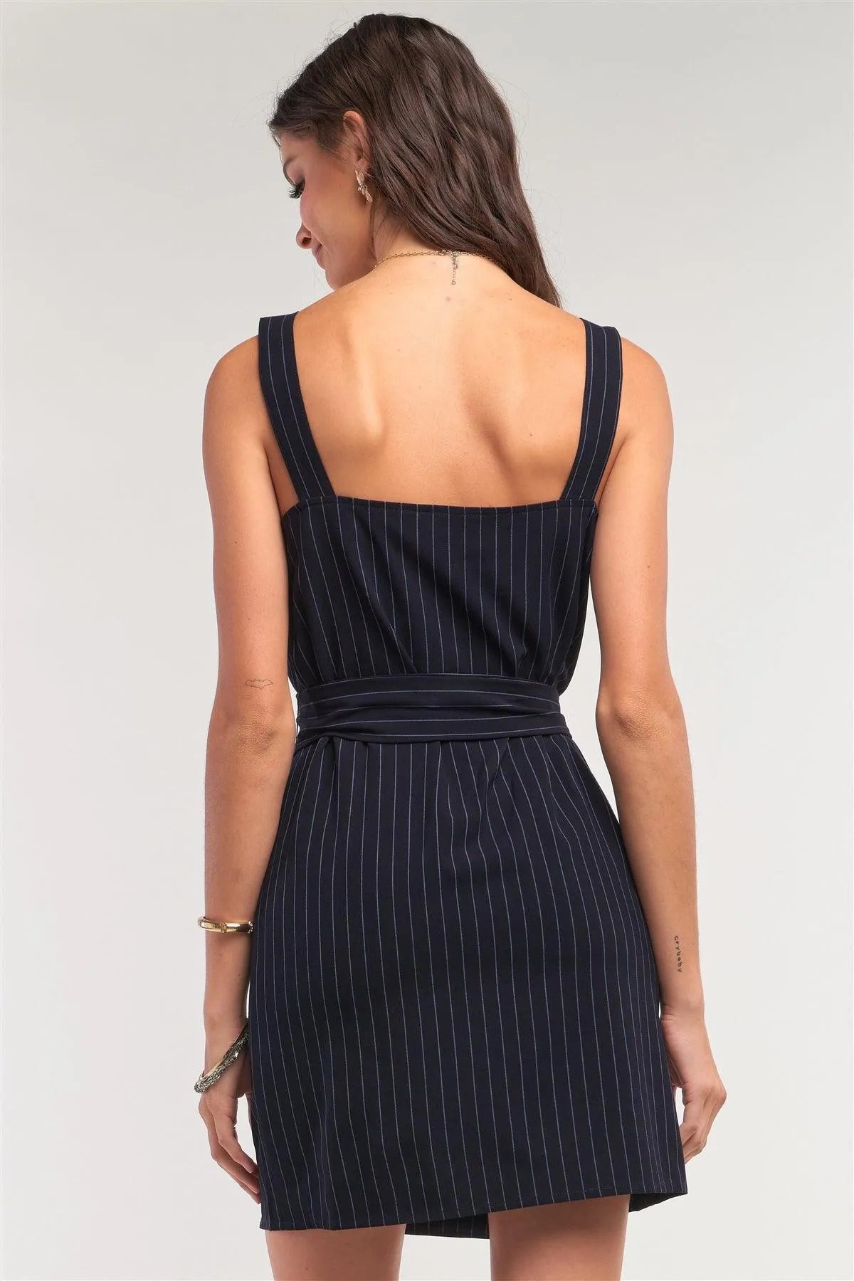 Navy Pinstriped Sleeveless Square Neck Double Breasted Self-Tie Belt Detail Fitted Mini Dress /3-3