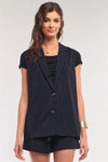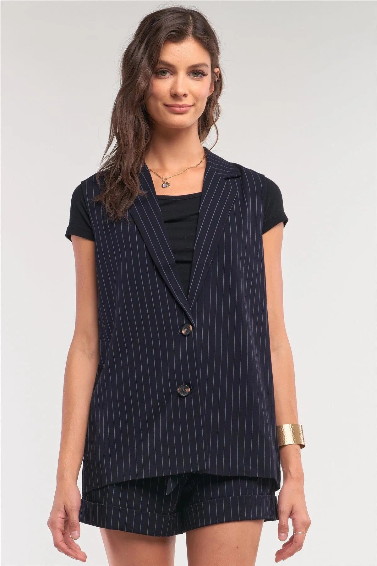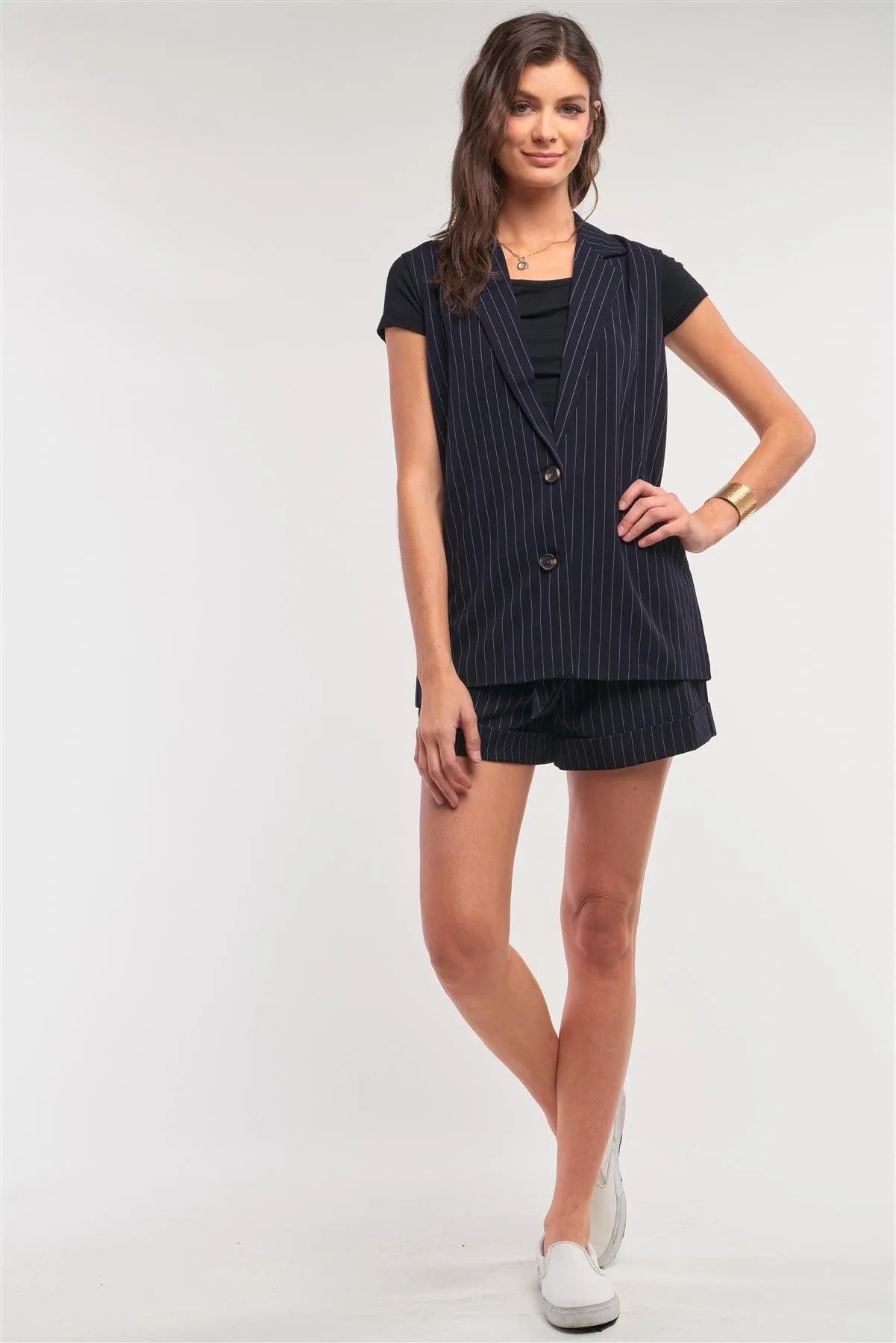 Navy Pinstriped Blazer Vest Top And High Waisted Mini Shorts Two-Piece Set