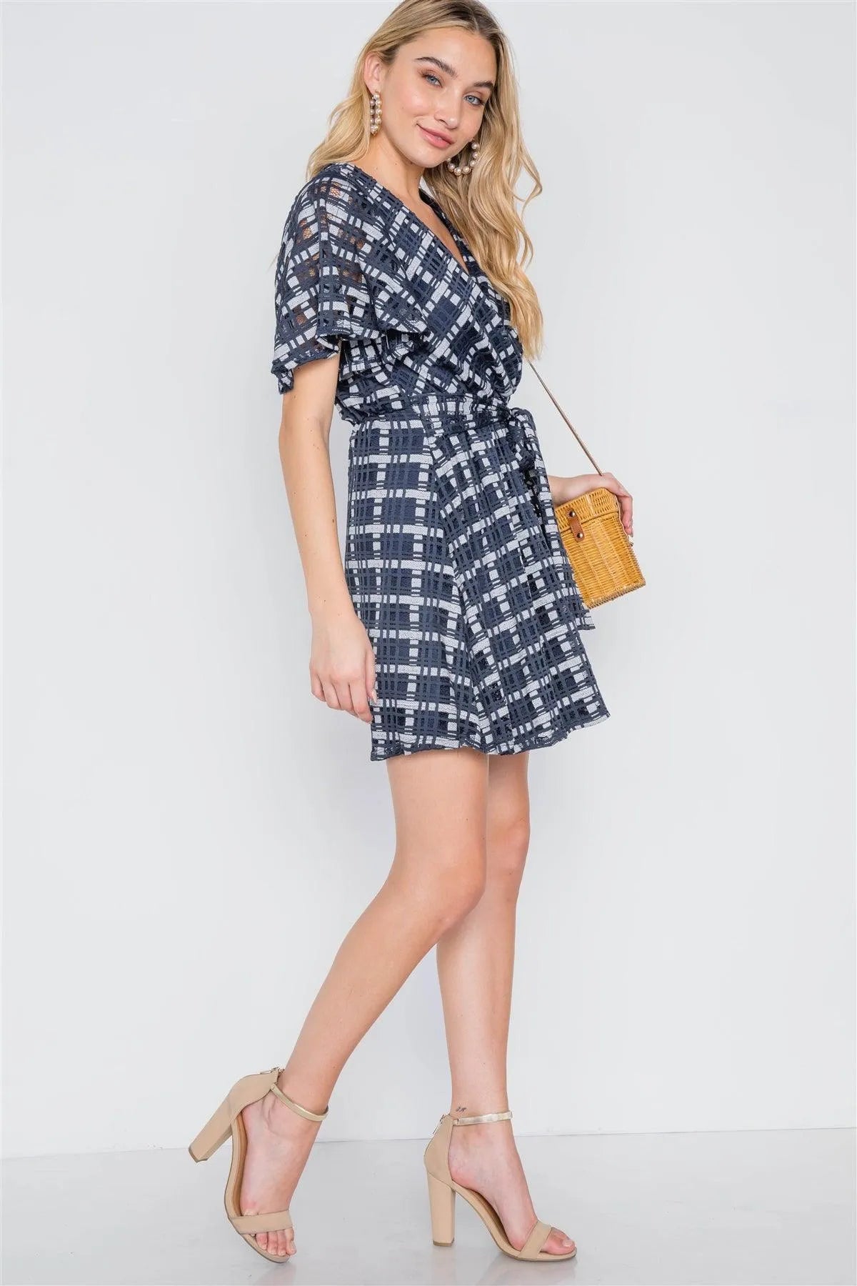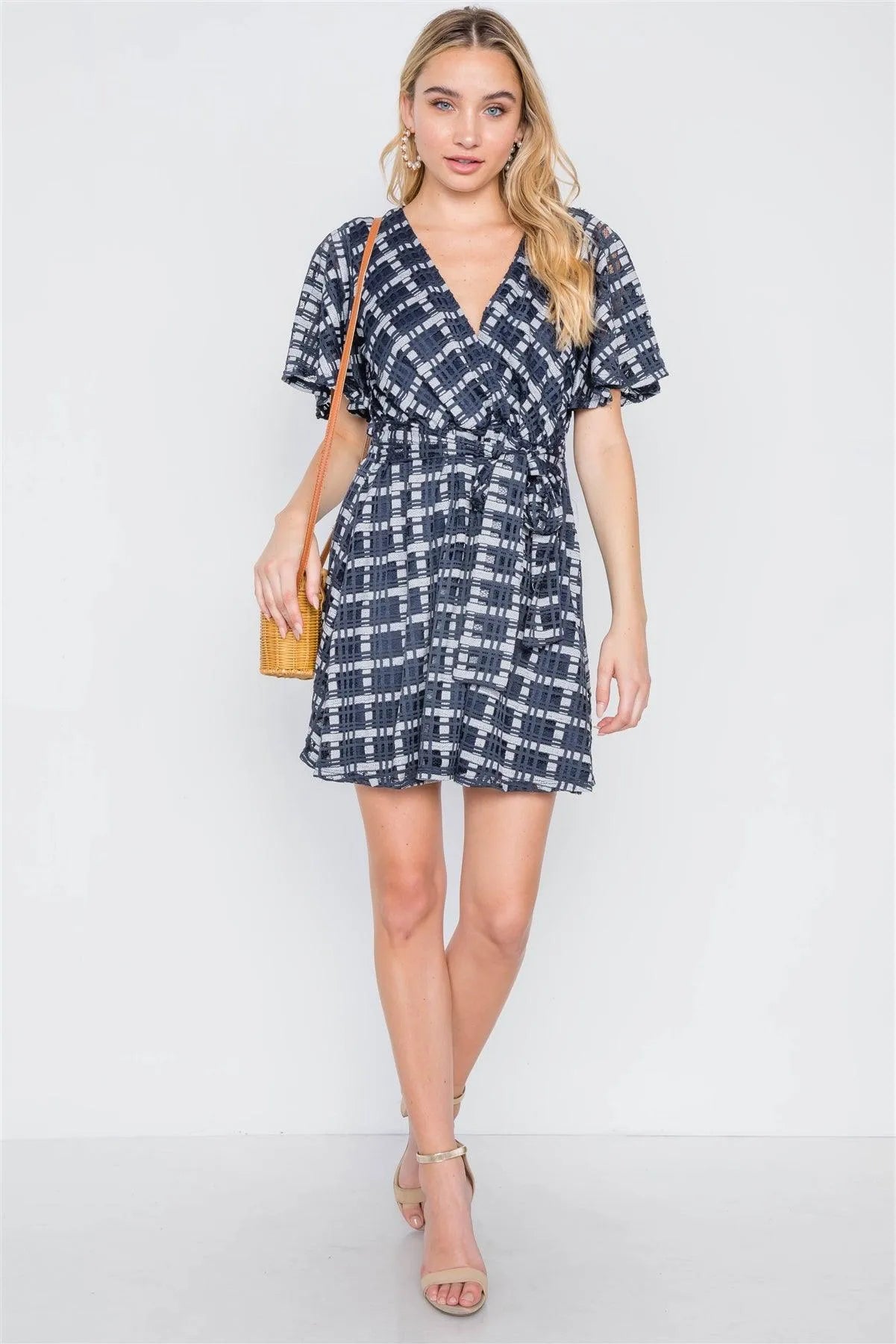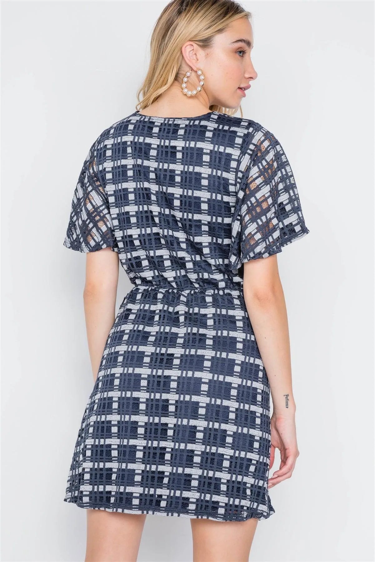 Navy Plaid Pattern Knit Short Sleeve Mini Dress /2-2-2