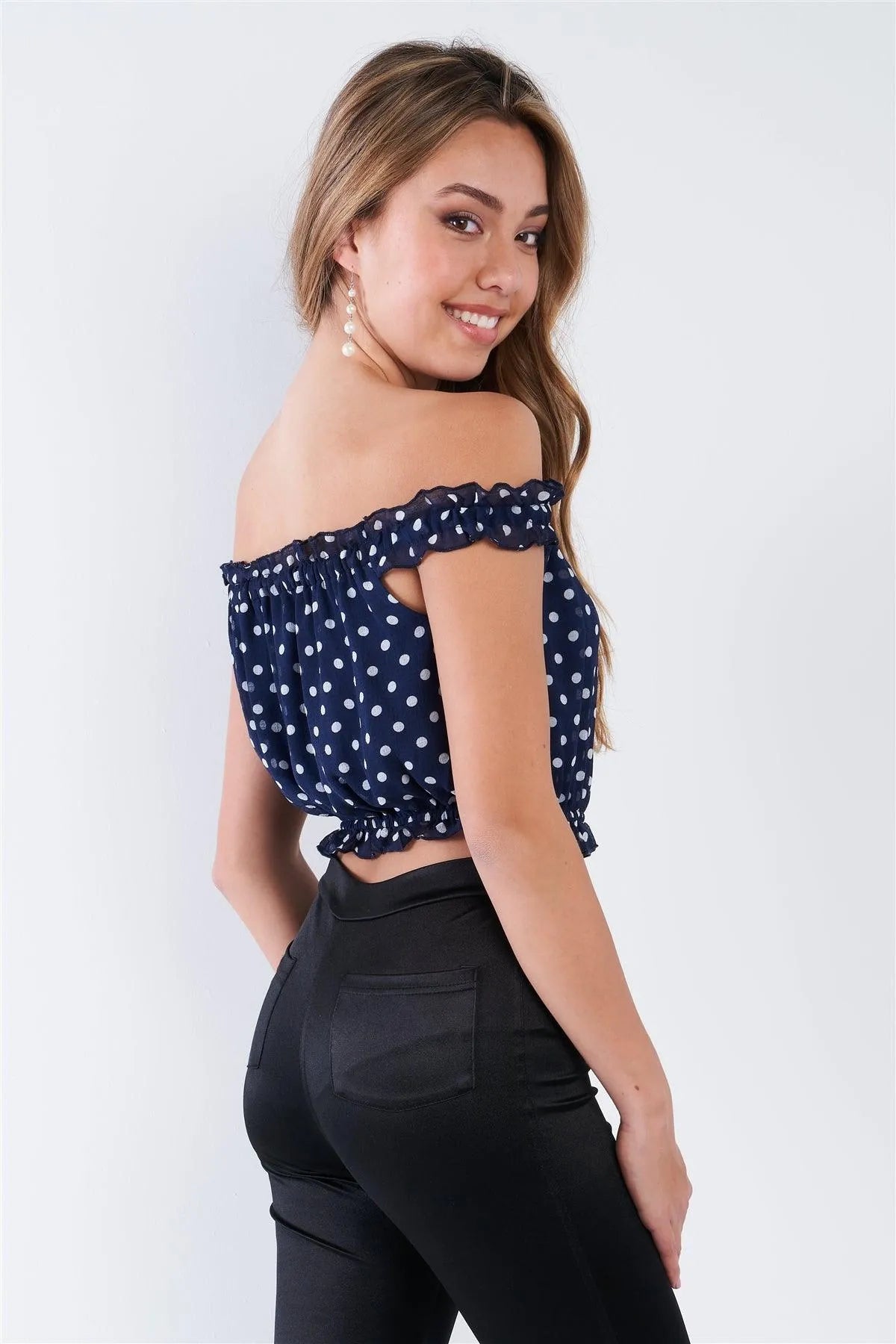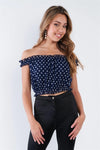 Navy Polka Dot Print Off The Shoulder Crop Top /2-2-2
