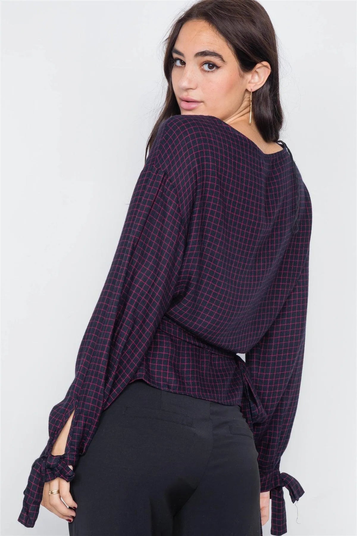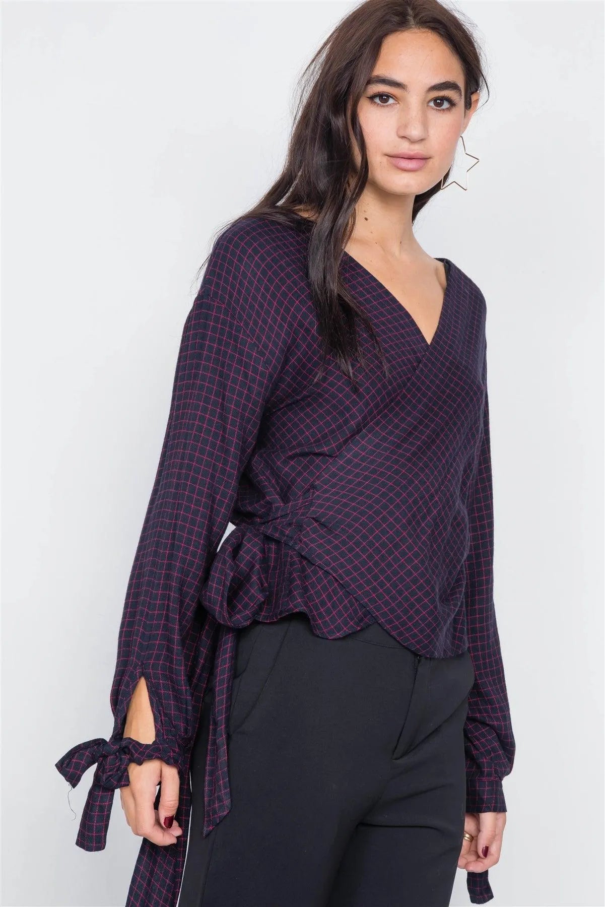 Top features: front tie, wrap, long sleeve, tie cuff, plaid, stripes, crop length, drop shoulder, unlined, stretchy, surplus v-neck.Model is 5'7" and wearing a Small (Waist 25", Bust 32D", Hips 36")Item measurements: Length: 24.5'', Bust: 44", Sleeve: 19"True to size Also available in Black