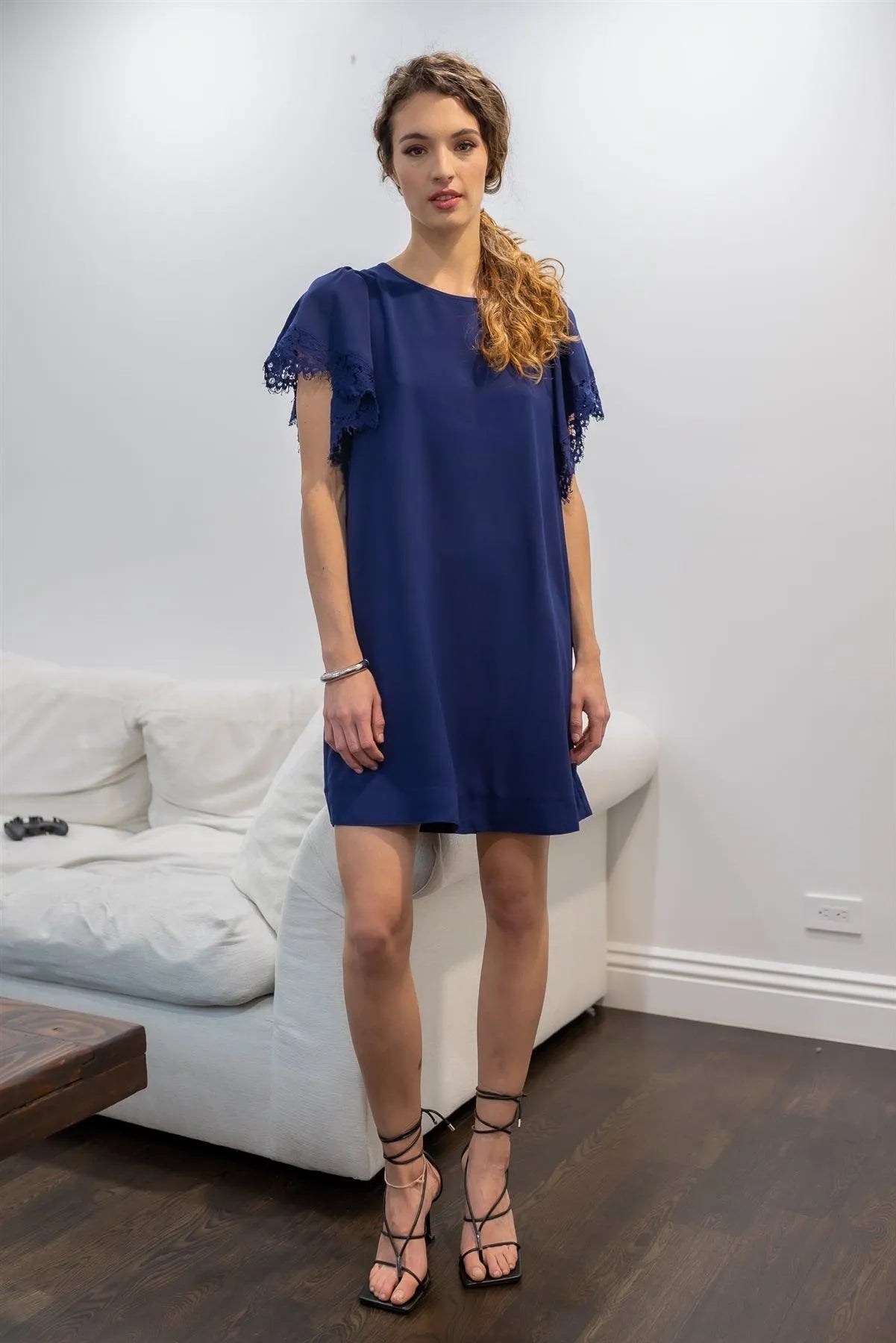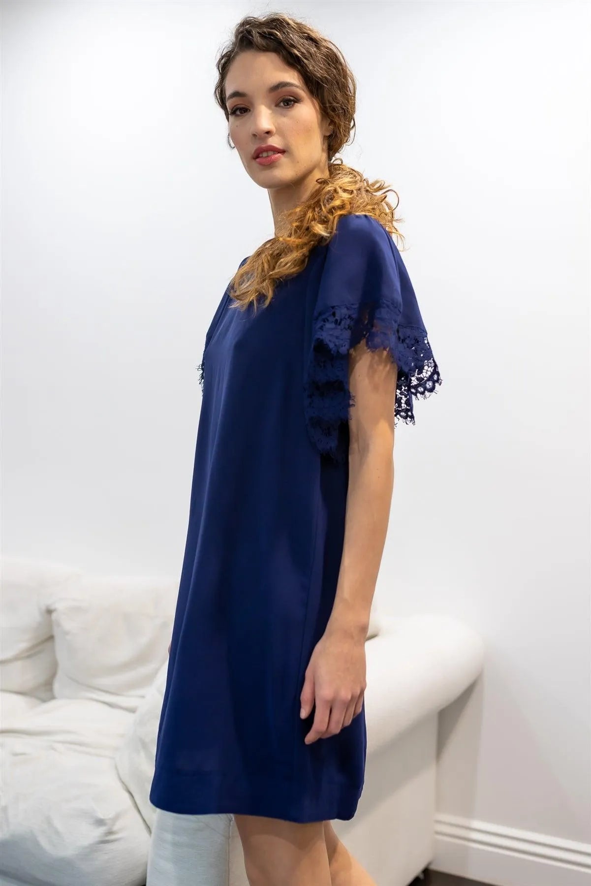 Navy Relax Fit Lace Hem Wing Sleeve Round Neck Mini Dress /1-2-3