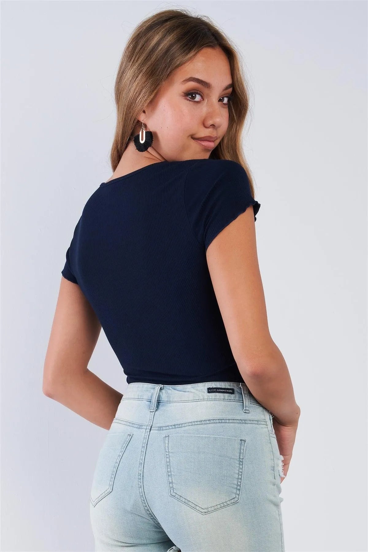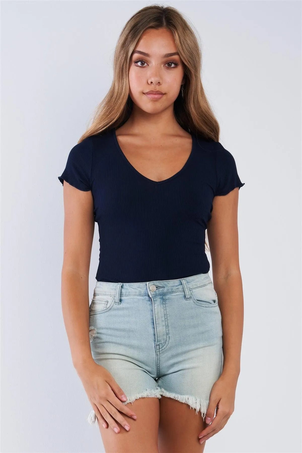 🖤 Item features: Navy, ribbed, stretchy, v-neck, ruffled sleeve, short sleeve, snap crotch closure, unlined, comfy, basic.