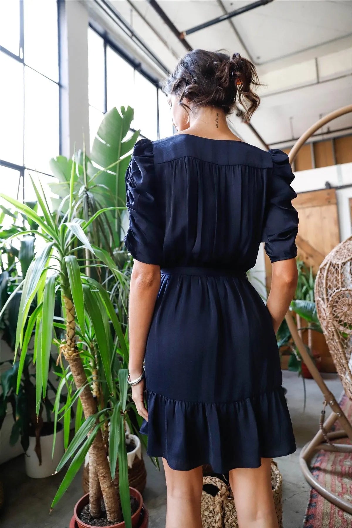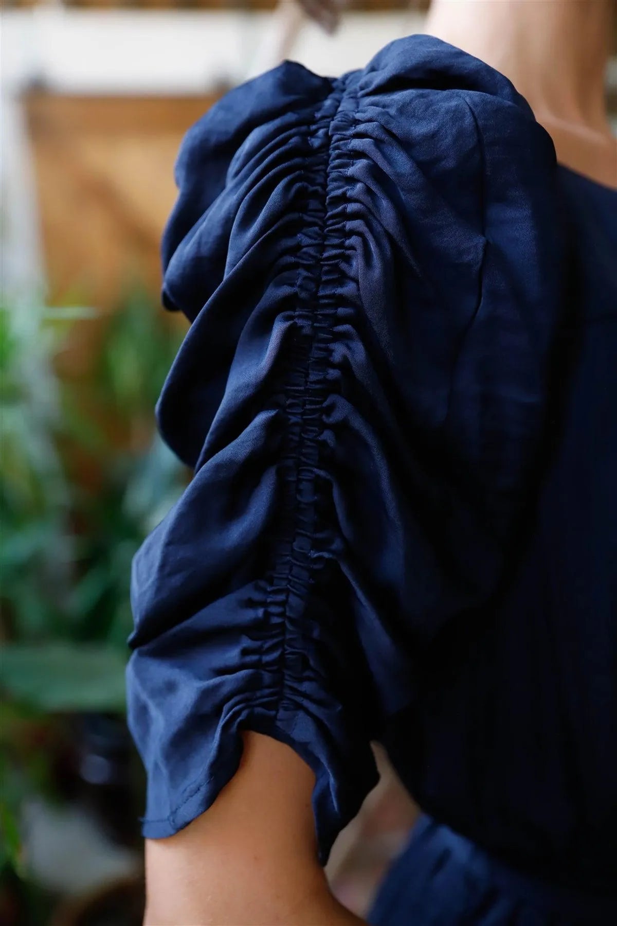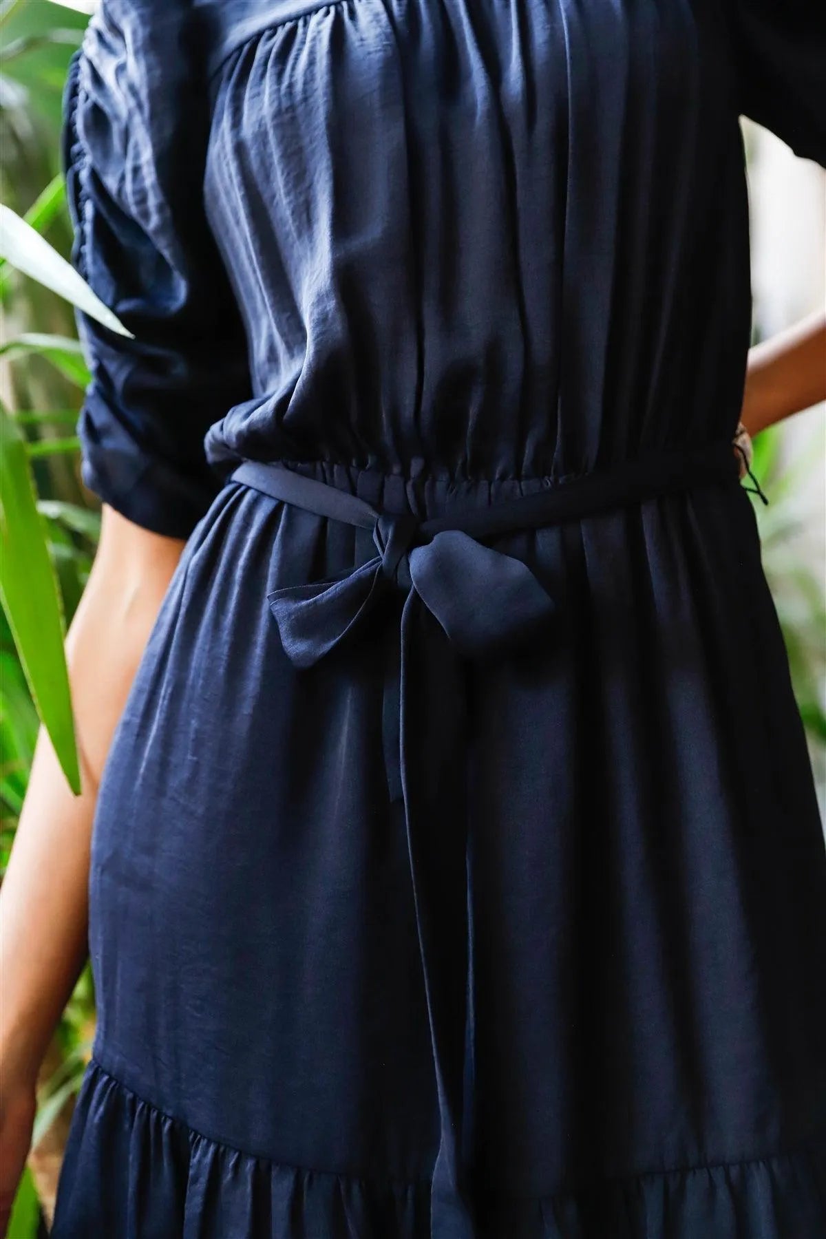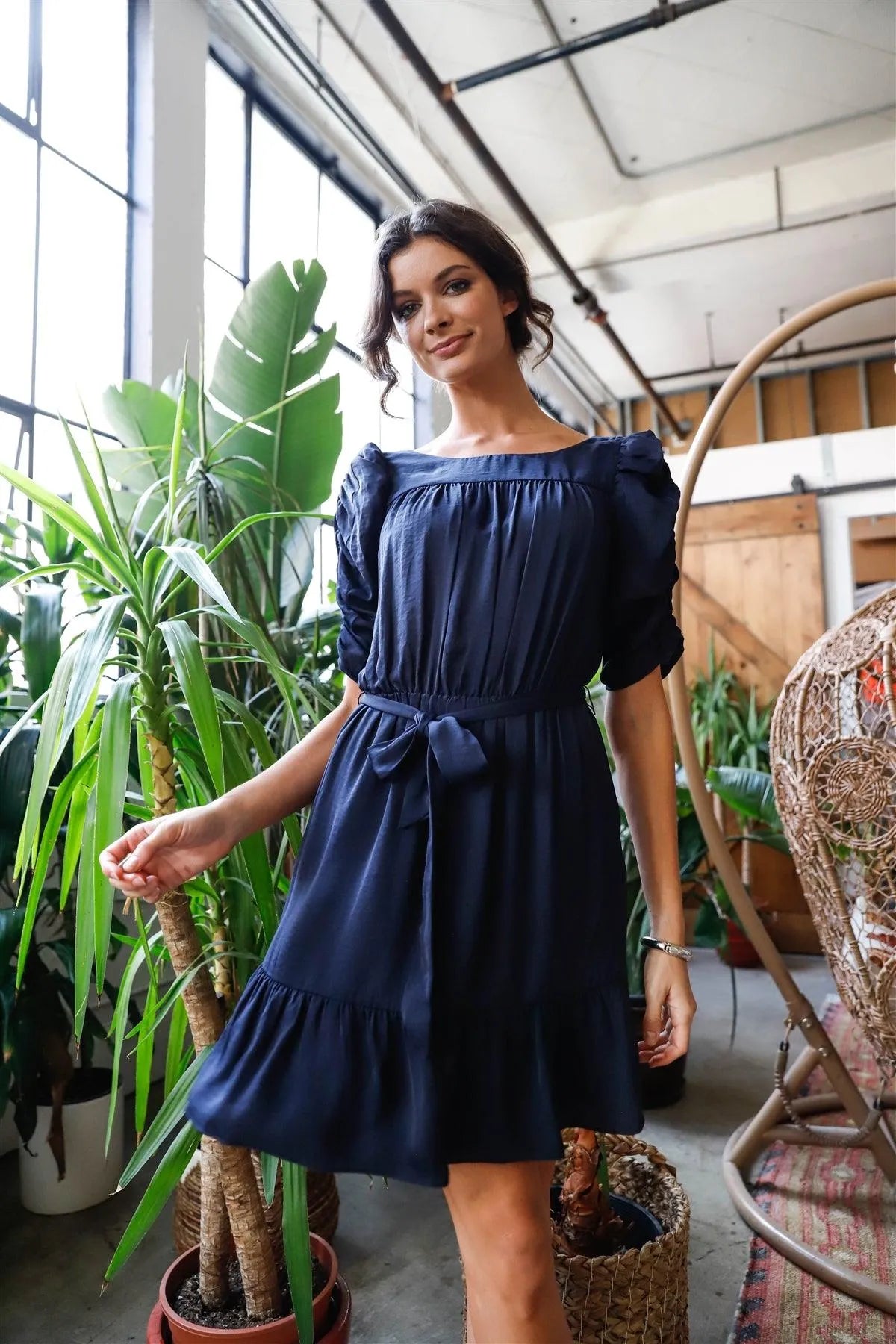 Navy Satin Effect Ruffle Hem Self-Tie Gathered Puff Sleeve Mini Dress /1-2-1-2