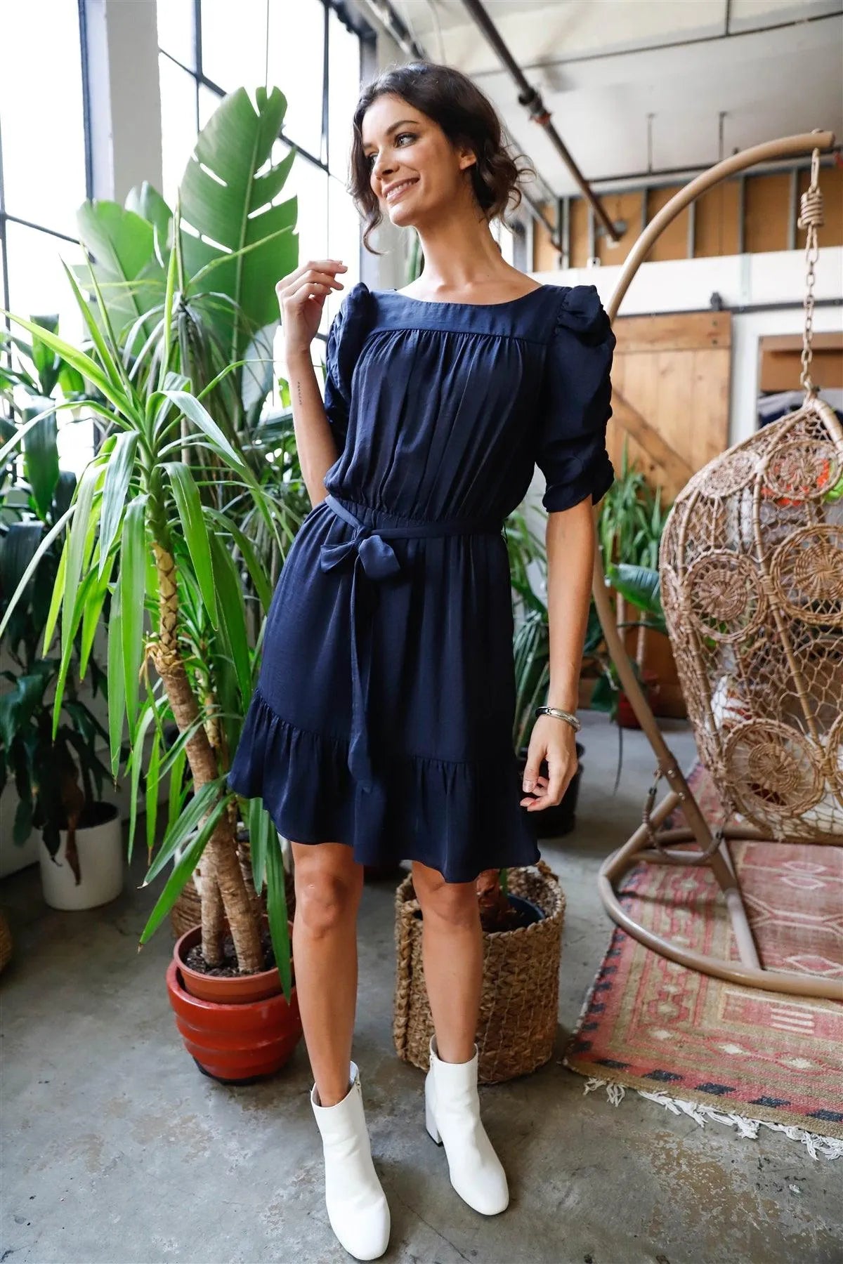 🖤 Item features: Navy, solid color, satin effect material, ruffle hem, self-tie belt with loops, gathered puff short sleeve, elasticized waistline & sleeve sides, relaxed fit, semi-sheer, lined, mini length, cute, girlish, elegant, chic, trendy