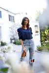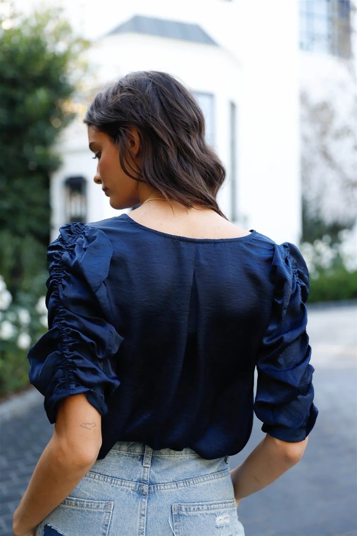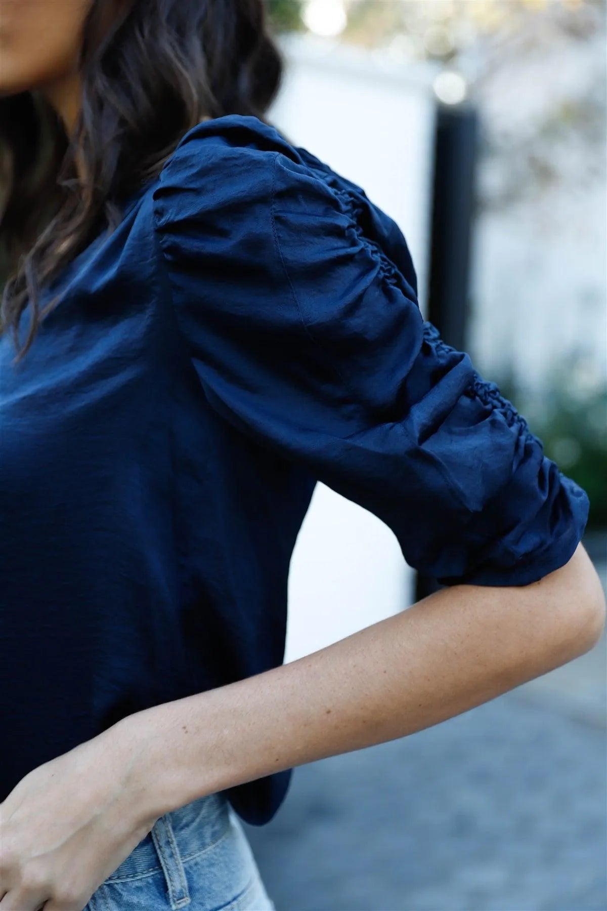 Navy Satin Effect V-Neck Ruched Puff Short Sleeve Top /1-2-2-1