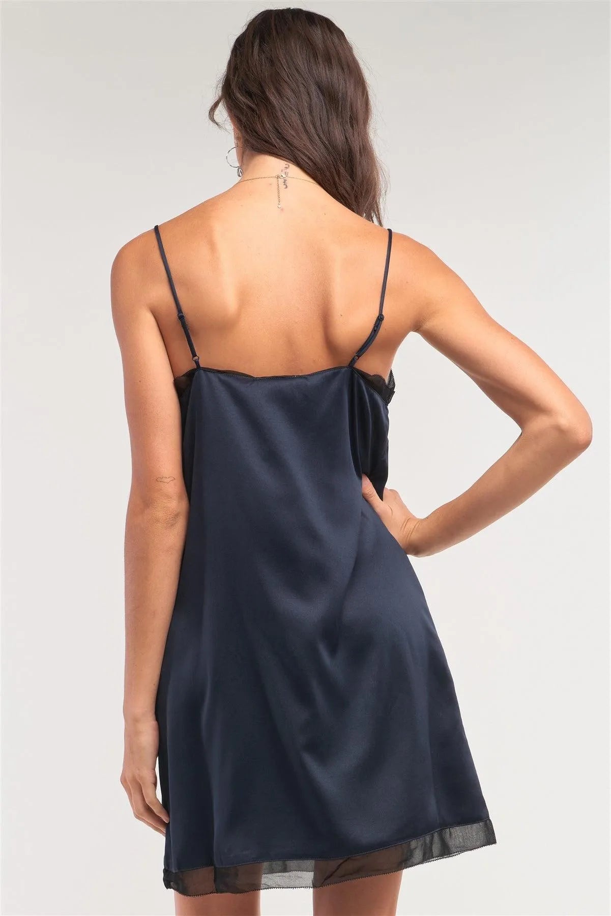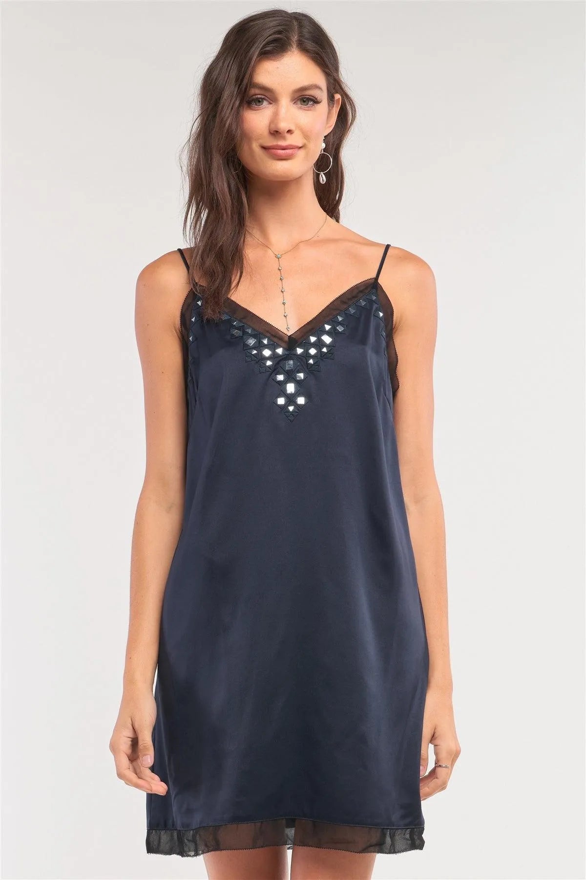 Navy Satin Sleeveless Relaxed Mesh Hem Glass Mosaic Embroidery Detail V-Neck Slip Mini Dress /1-2-2-1