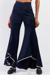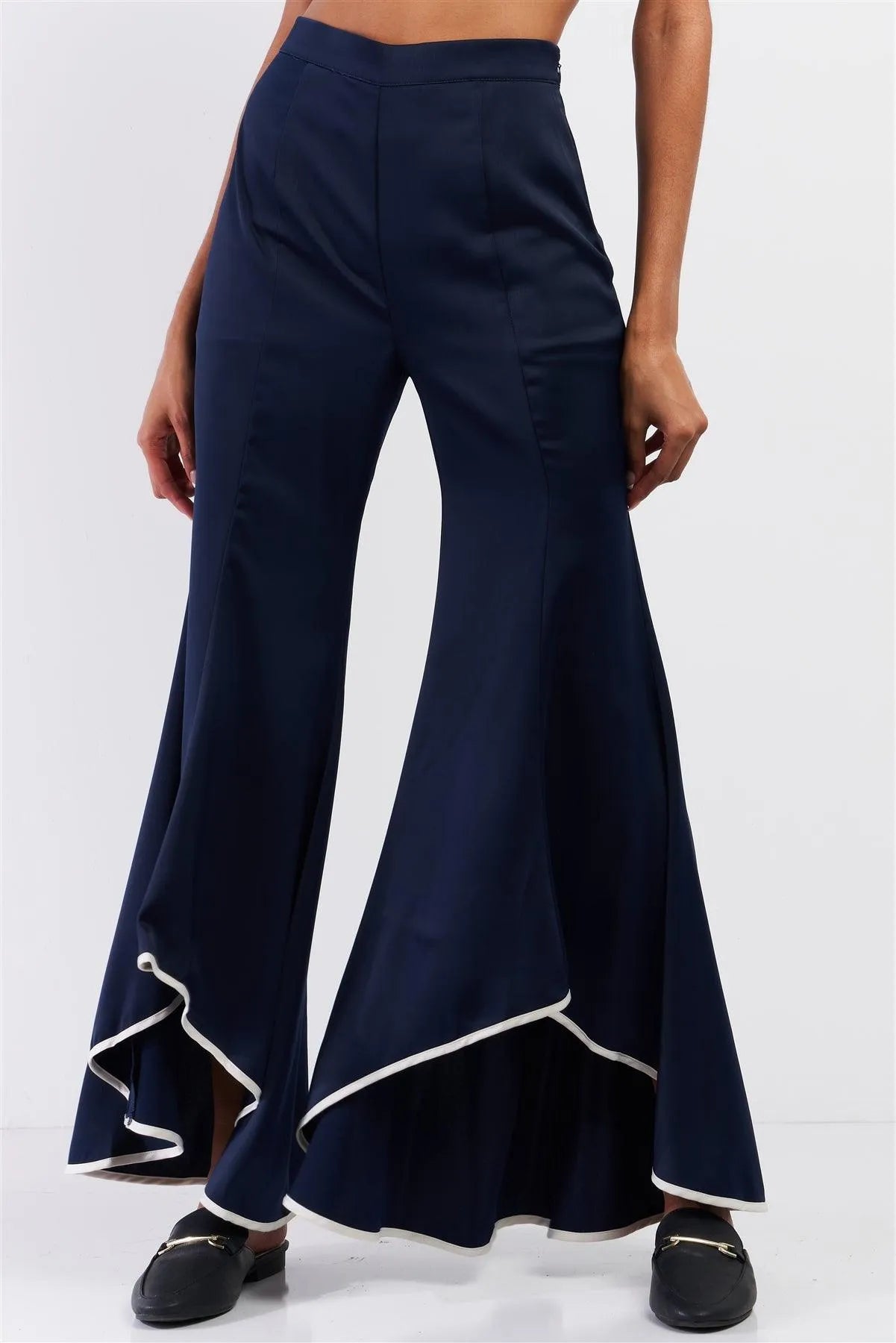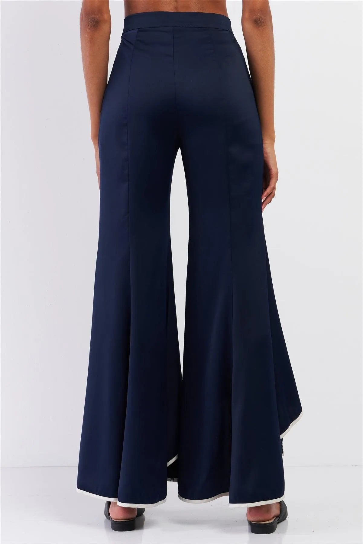 Navy Satin High Waisted Retro Flare Asymmetrical White Detail Hem Pants /3-3