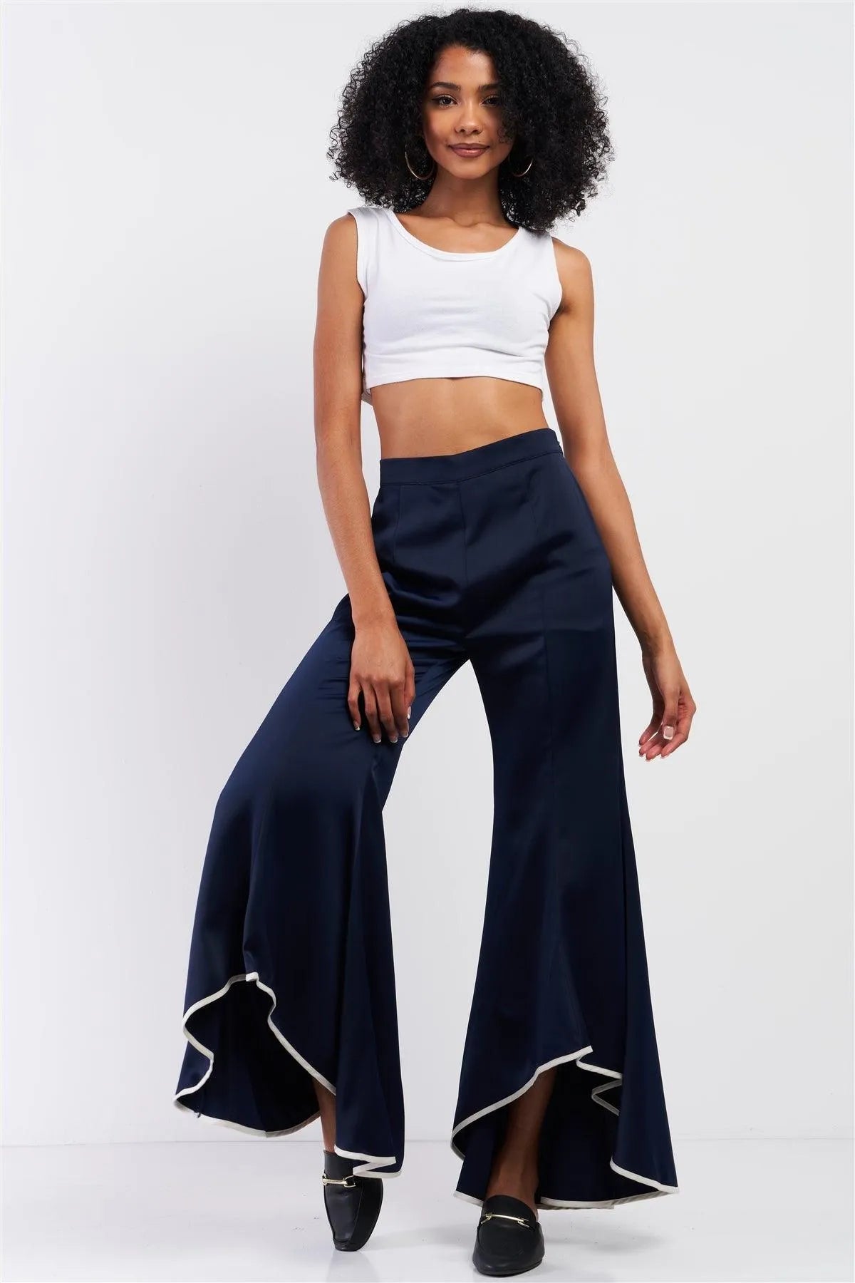 Navy Satin High Waisted Retro Flare Asymmetrical White Detail Hem Pants /1-2-2-1