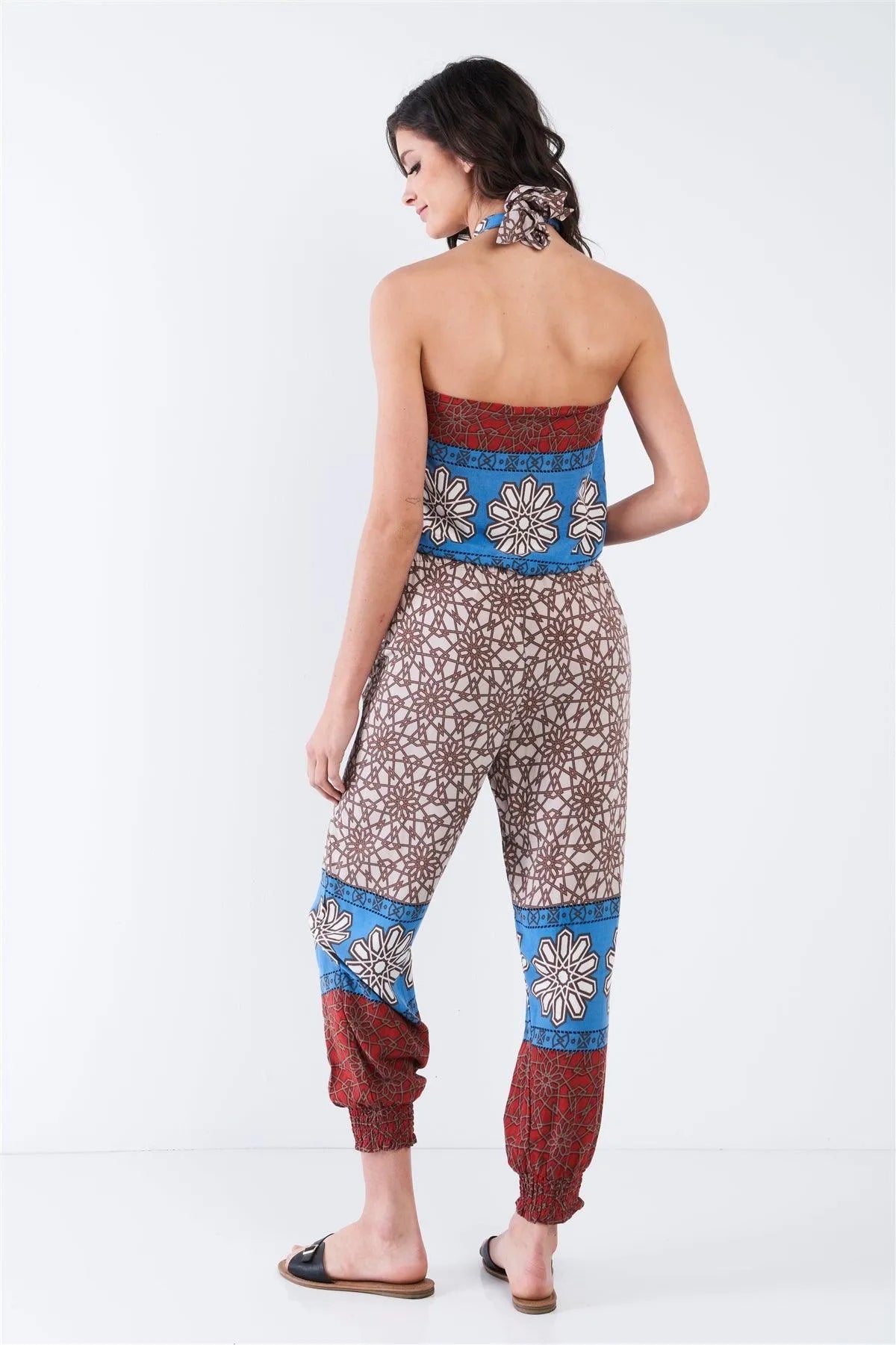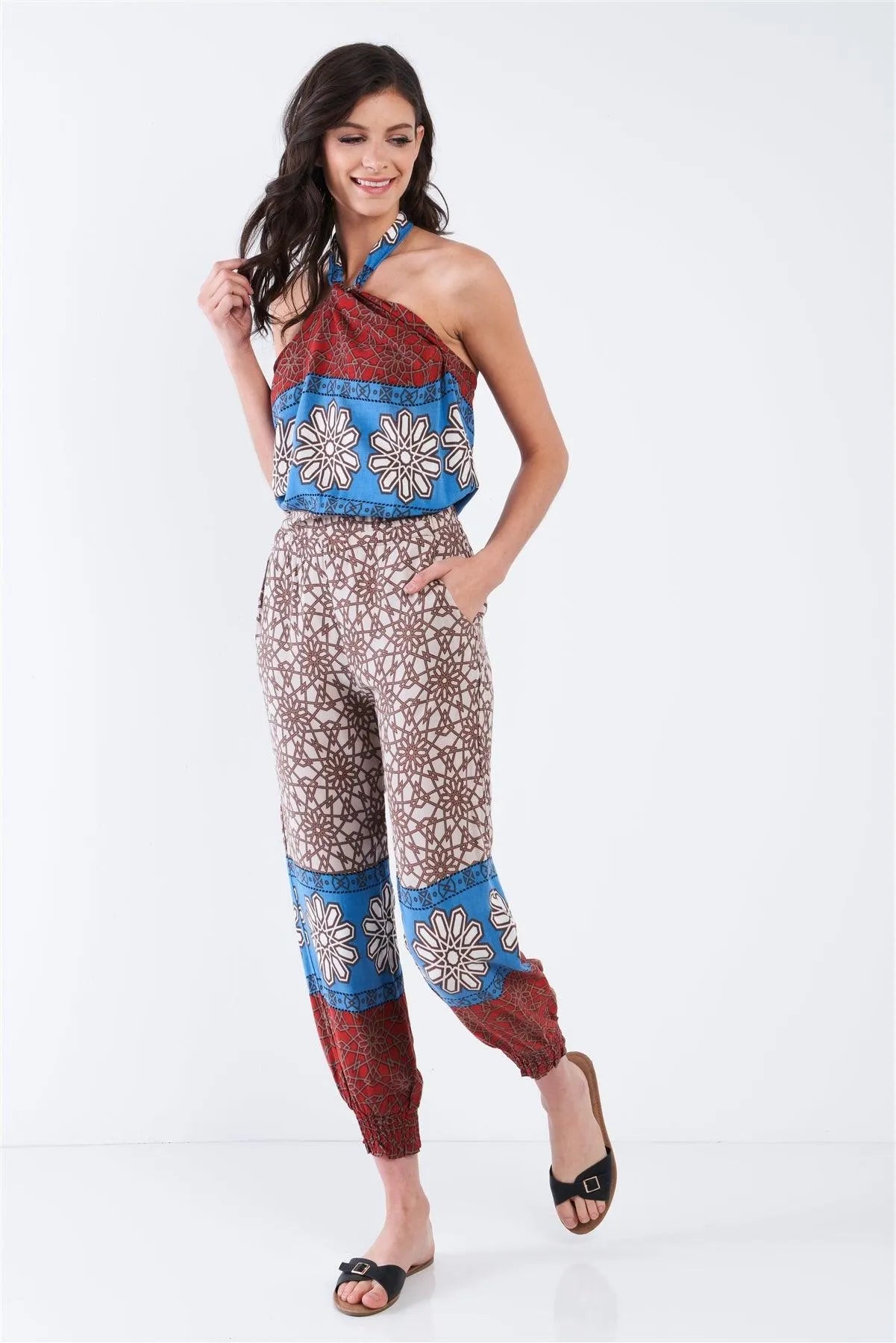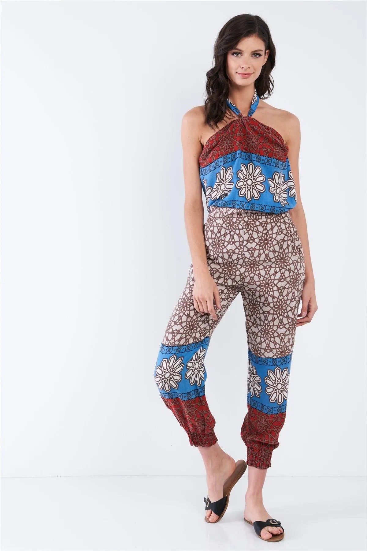 Jumpsuit Features: Navy multi print, self-tie, halter neckline, sleeveless, elastic waistline, smock ankle detail, unlined, stretchy, boho, beachwear, casualModel is 5'9" and wearing size Small (Waist: 23.5", Bust: 32B, Hips: 36")Item Measurements: Length: 51" , Bust 36"True to size