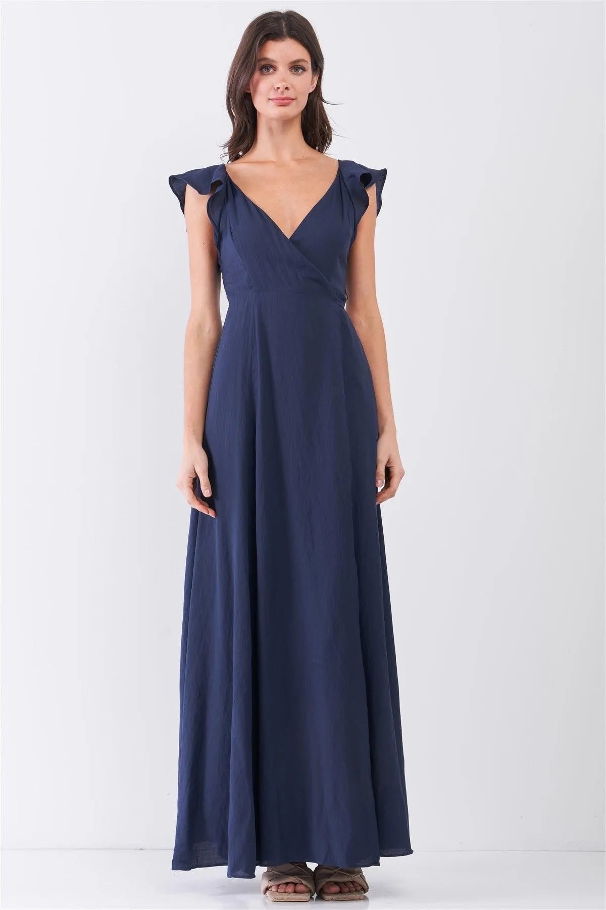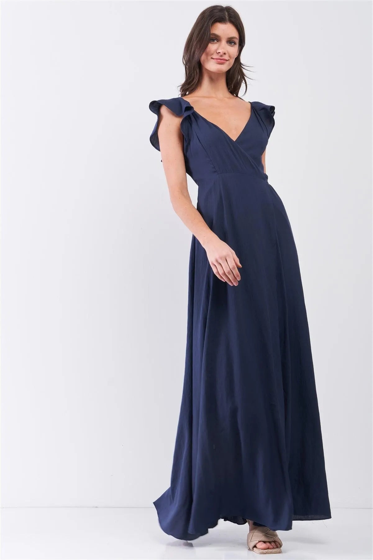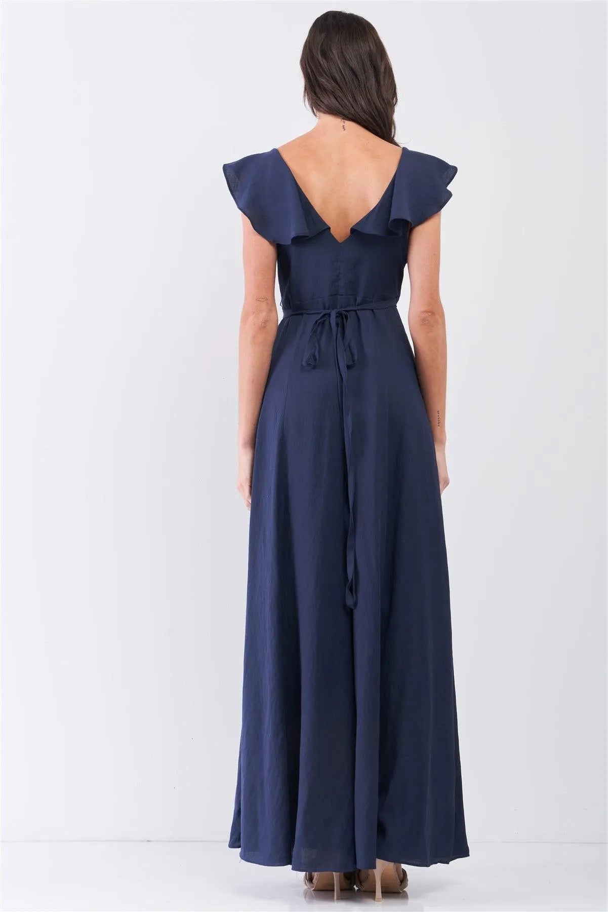 Navy Sleeveless Frill Trim On The Shoulder V-Neck And Back Fitted Wrap Maxi Dress /3-2-1
