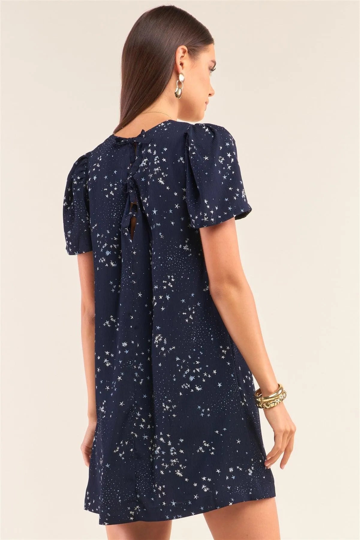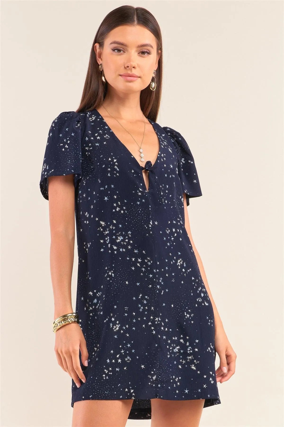 🖤 Introducing our navy blue mini dress, perfect for date night in spring/summer. The loose fit provides comfort, while the deep plunge V-neckline adds a touch of allure. The self-tie front and back and multicolor star print make this dress a stand-out piece for any casual occasion.