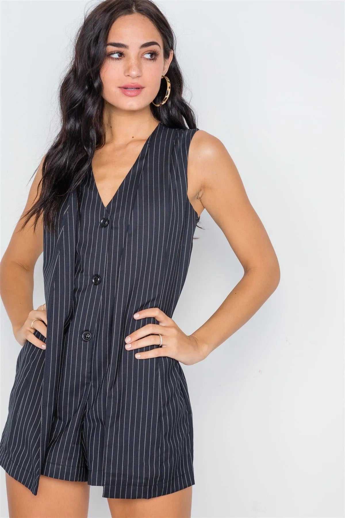 Romper features: sleeveless, button down closure, layered vest over romper design, stripe pattern allover, unlinedModel is 5'9 wearing a size Small ( Waist: 26", Bust: 34C, Hips: 36")Small Size Item Measurements: Length: 31" Bust: 32"True to sizeAvailable in Grey