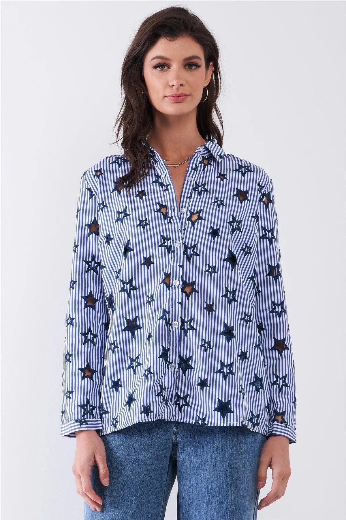 Navy Striped Cut-Out Star Embroidery Long Sleeve Button Down Shirt /2-2-2