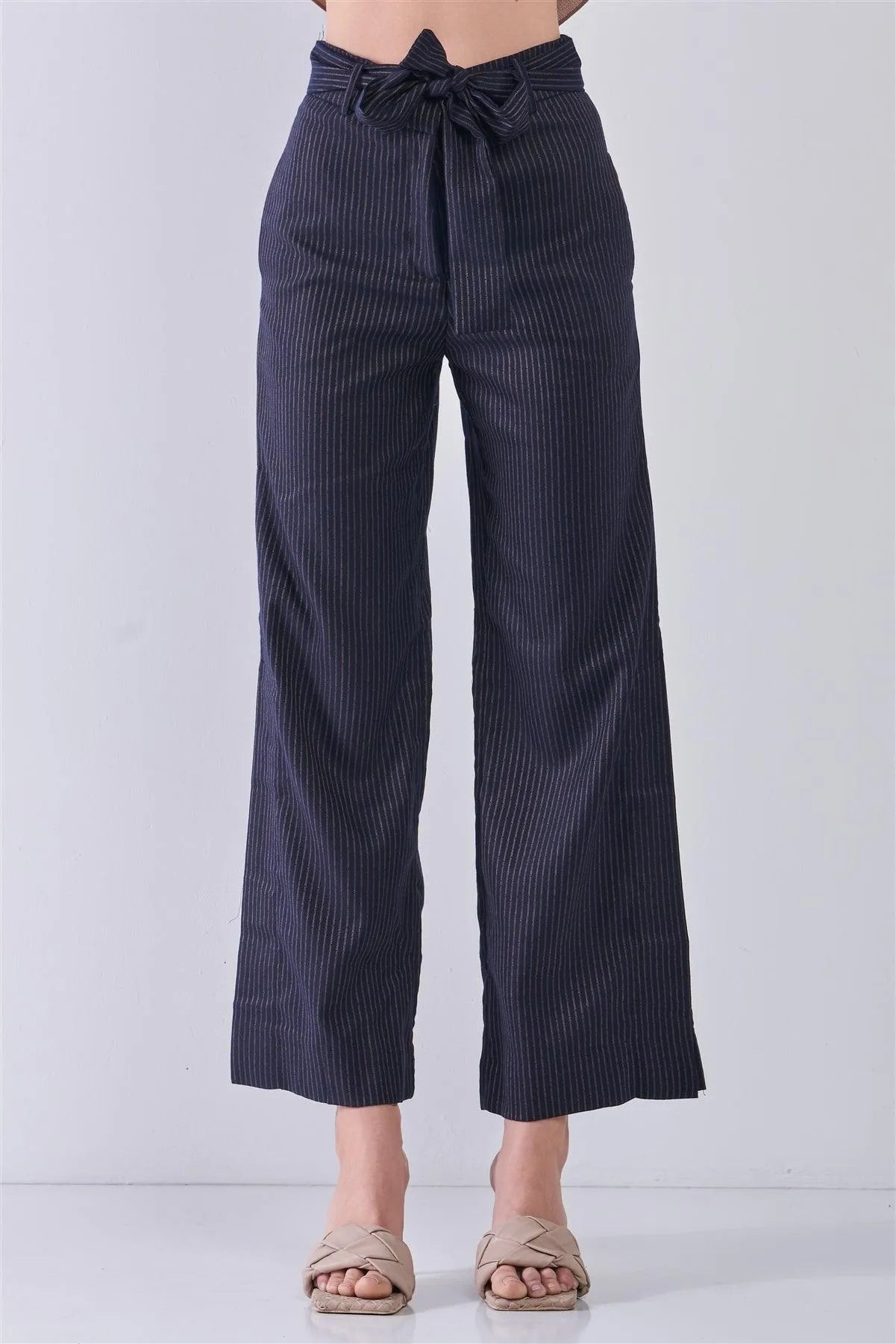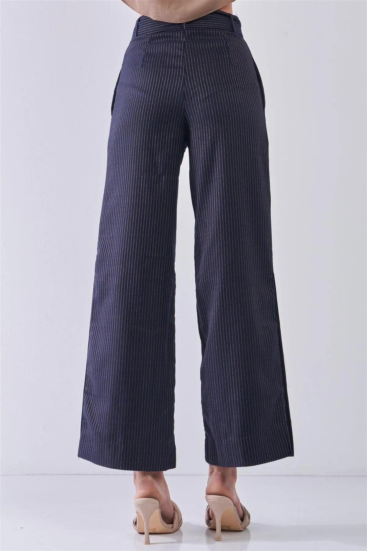 Navy & Gold Striped High Waist Detachable Self-Tie Belt Slit Sides Detail Wide Leg Pants /3-2-1