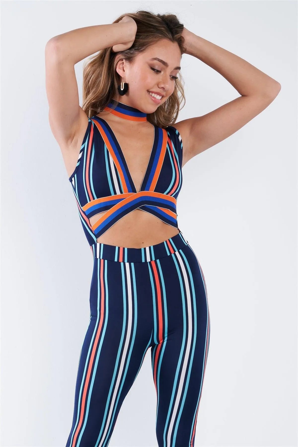 Retro Multi Striped Strappy Sexy Spandex Jumpsuit