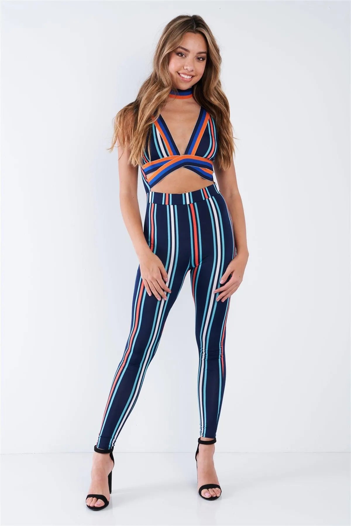 Navy Striped Strappy Sexy Spandex Jumpsuit /1-1-1-1-1
