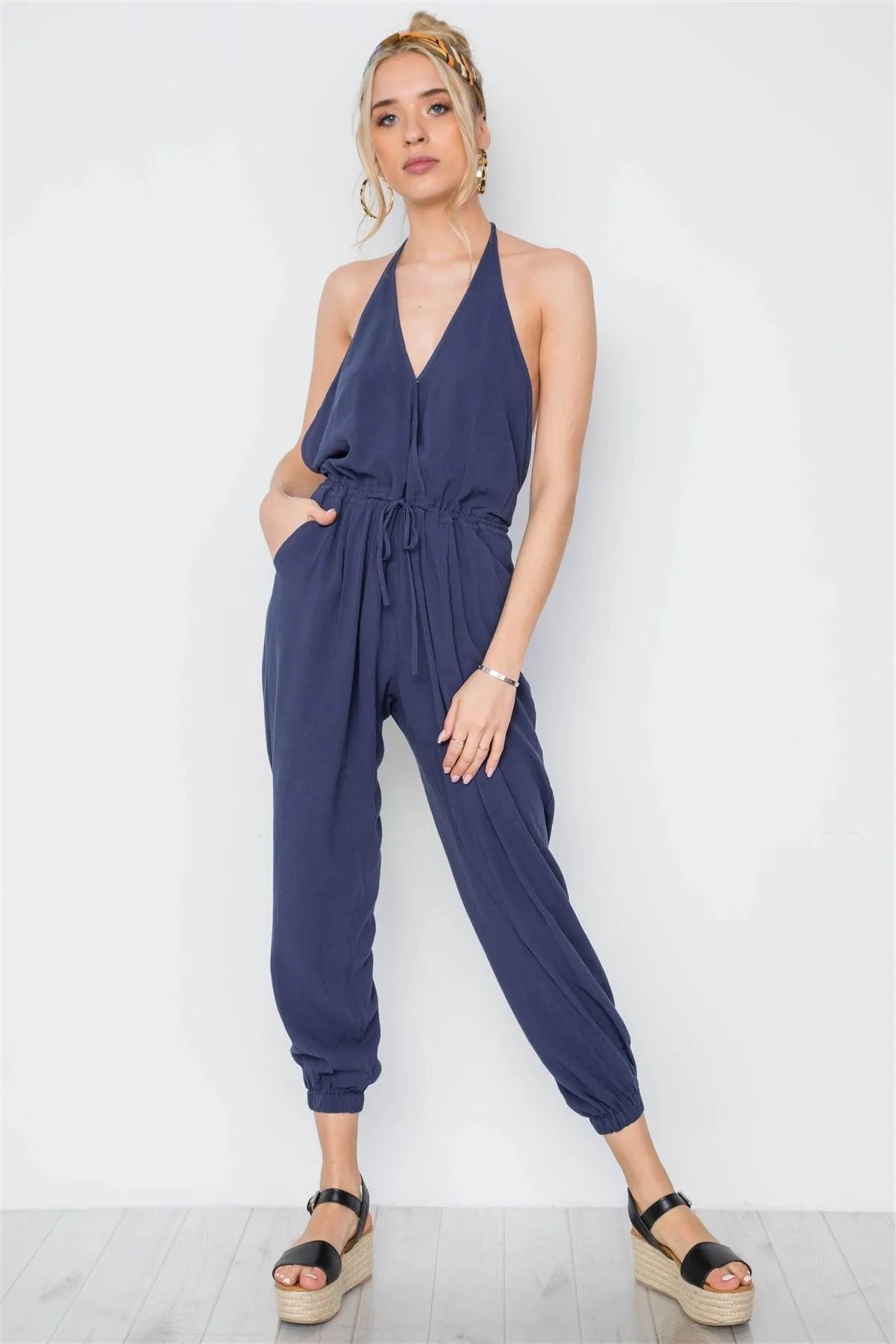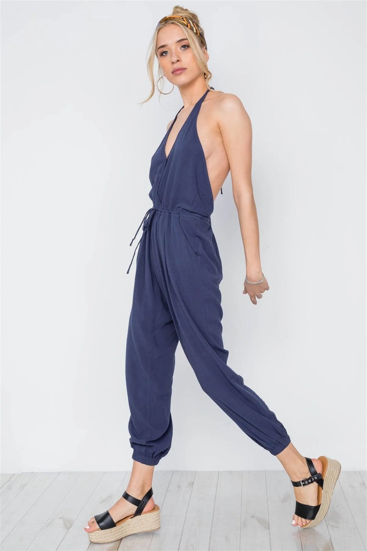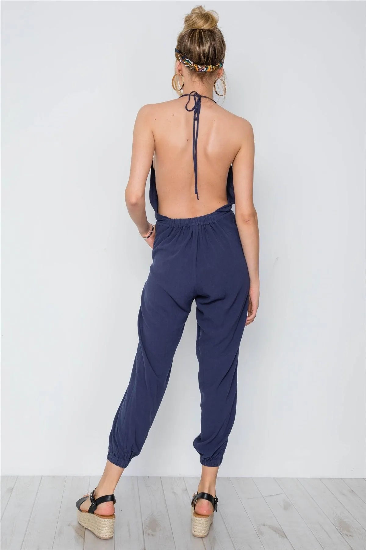 Navy Surplice Neck Open Back Casual Solid Jumpsuit /3-2-1