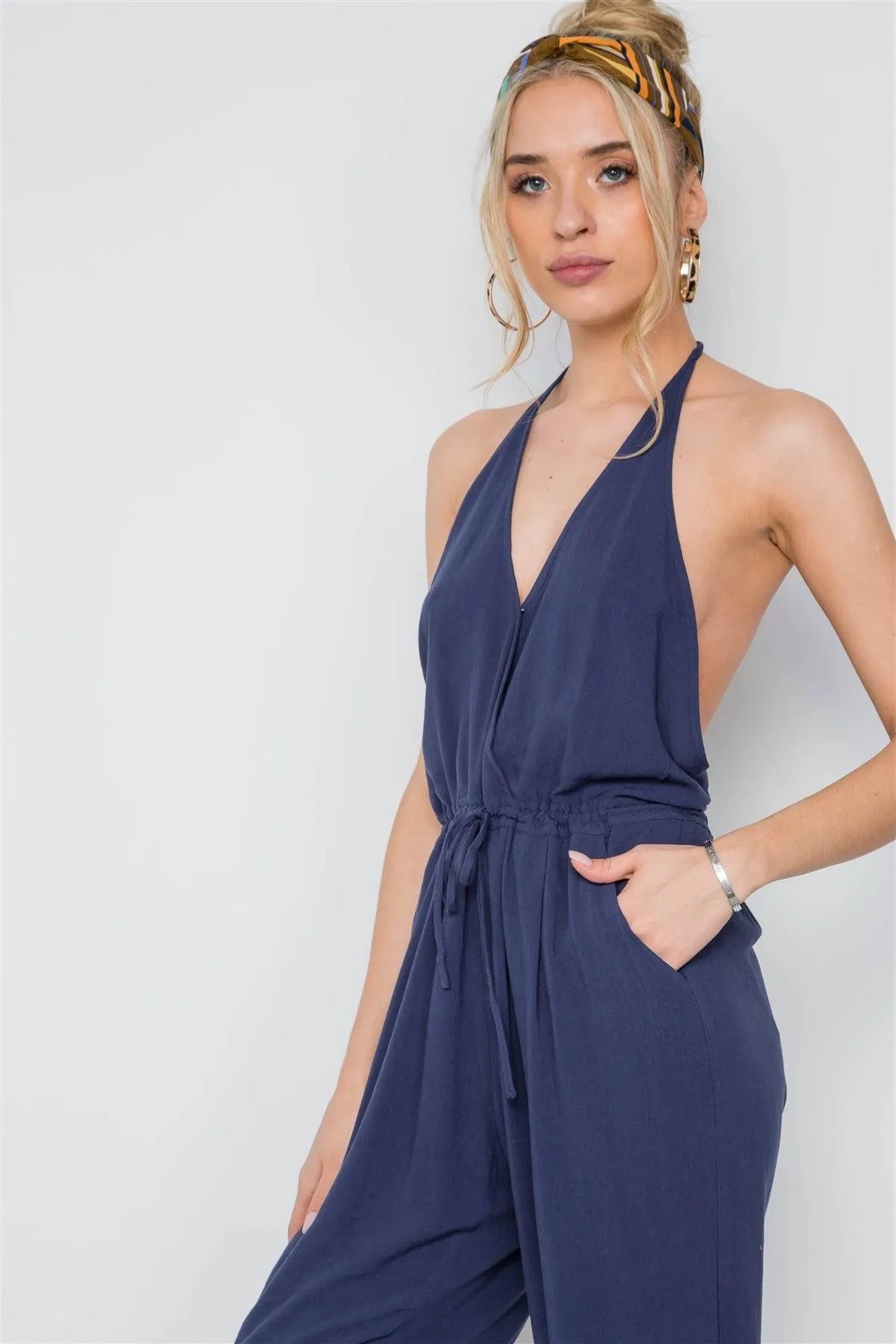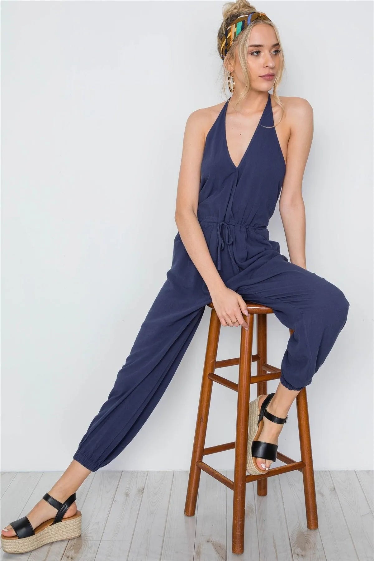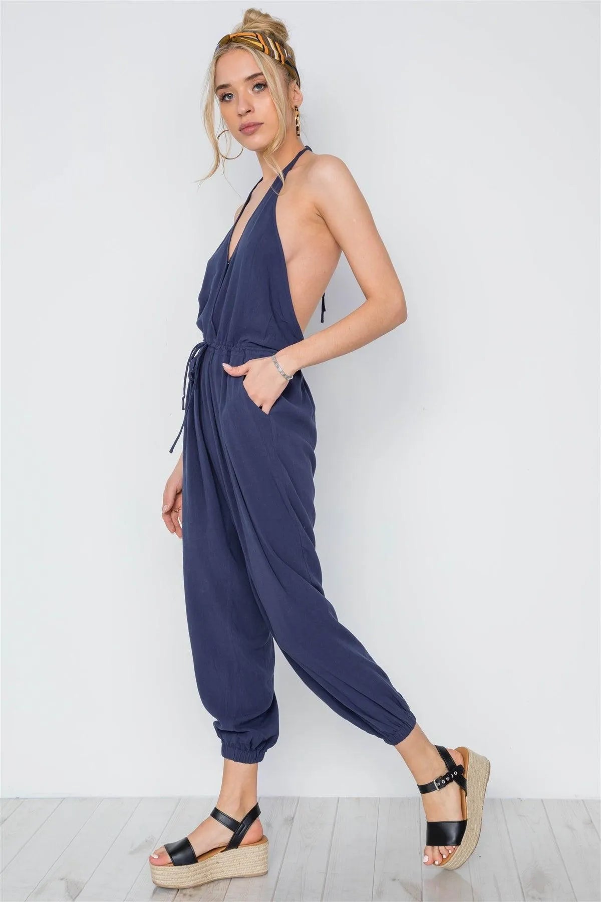 Navy Surplice Neck Open Back Casual Solid Jumpsuit /3-2-1