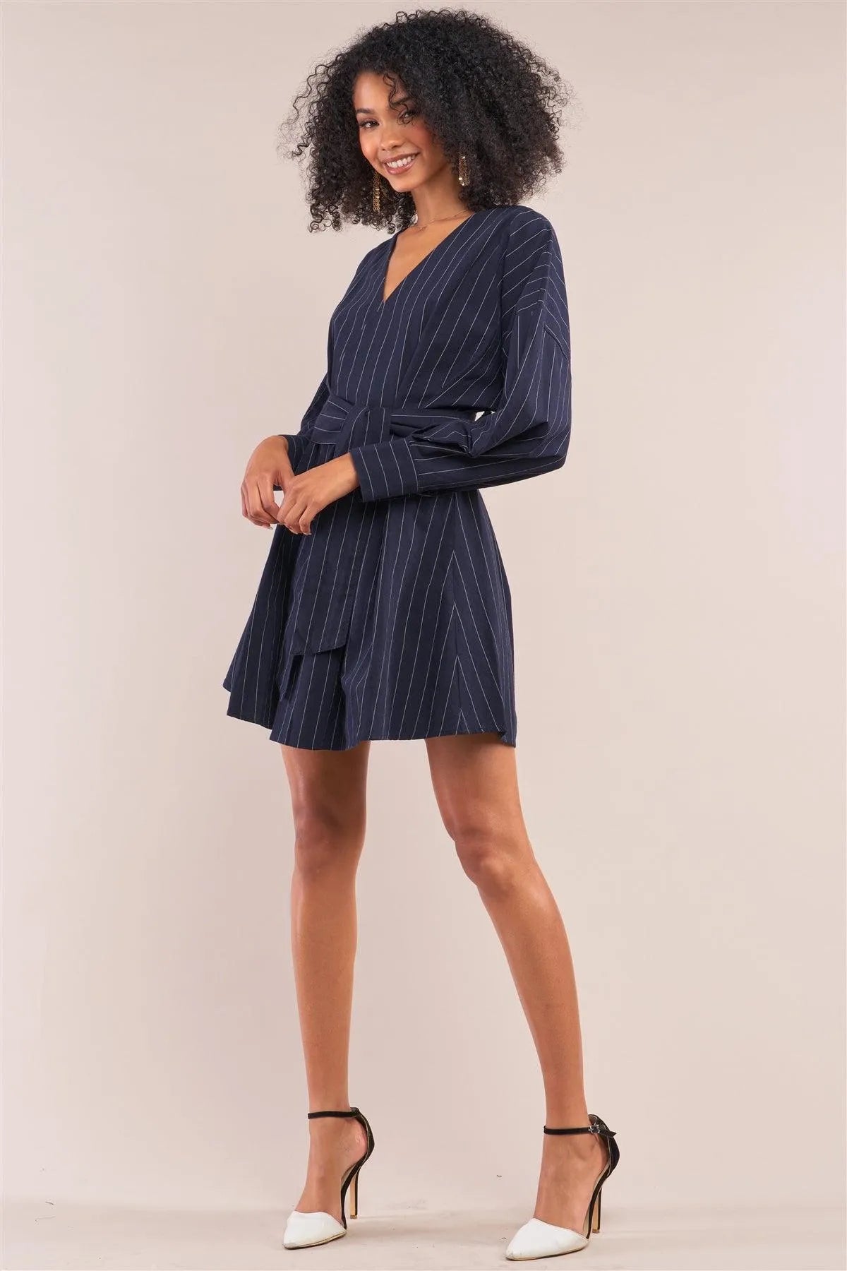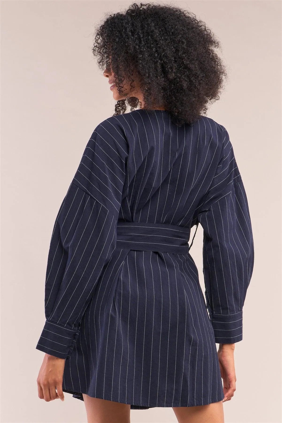Navy Pinstriped Long Balloon Puff Sleeve Surplice Neck Wrap Mini Shirt Dress /2-2-2