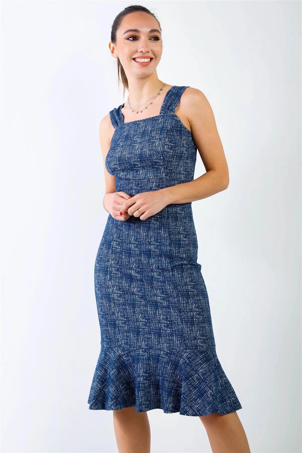 🖤 Item Features: Navy, textured print, cotton blend, square neckline, sleeveless, wide straps, flare hem, midi length, body con silhouette, back zipper closure, chic, stylish, elegant, cocktail party look