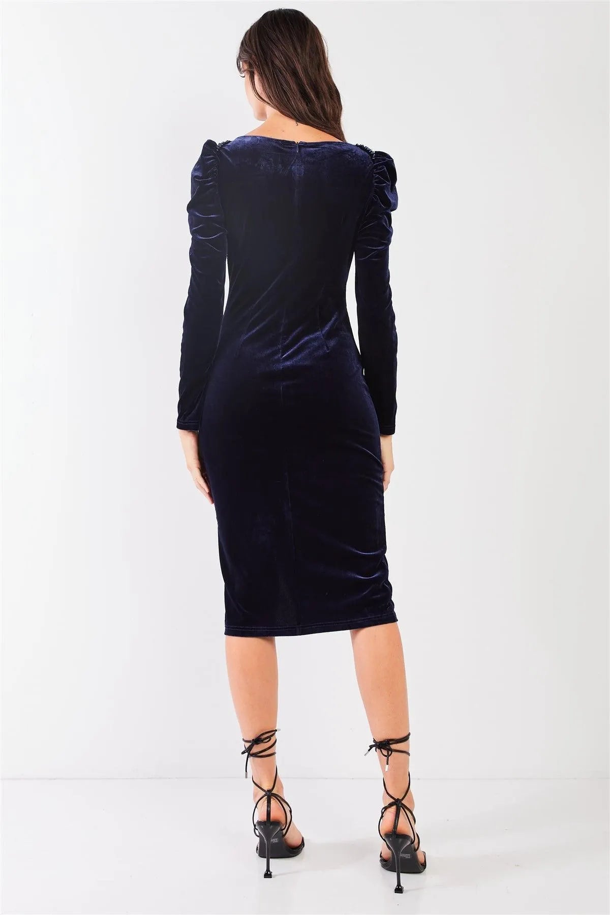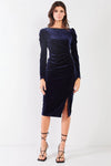 Navy Velvet Beaded Neckline Trim Juliet Long Sleeve Side Slit Midi Dress /2-2-2