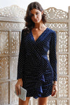 🖤 Item features: Navy, velvet material, glitter polka dot print, side gathered ruffle details, v-neckline, long sleeves, mini length, no closure, non-sheer, stretchy, slim fit, elegant, chic, stylish, night-out, eye-catching look, holiday vibe