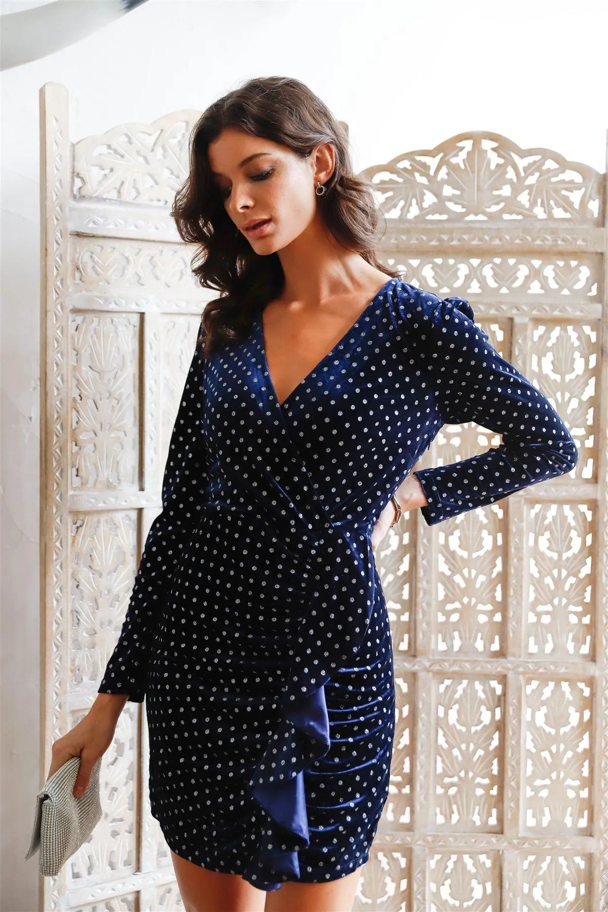 🖤 Item features: Navy, velvet material, glitter polka dot print, side gathered ruffle details, v-neckline, long sleeves, mini length, no closure, non-sheer, stretchy, slim fit, elegant, chic, stylish, night-out, eye-catching look, holiday vibe