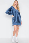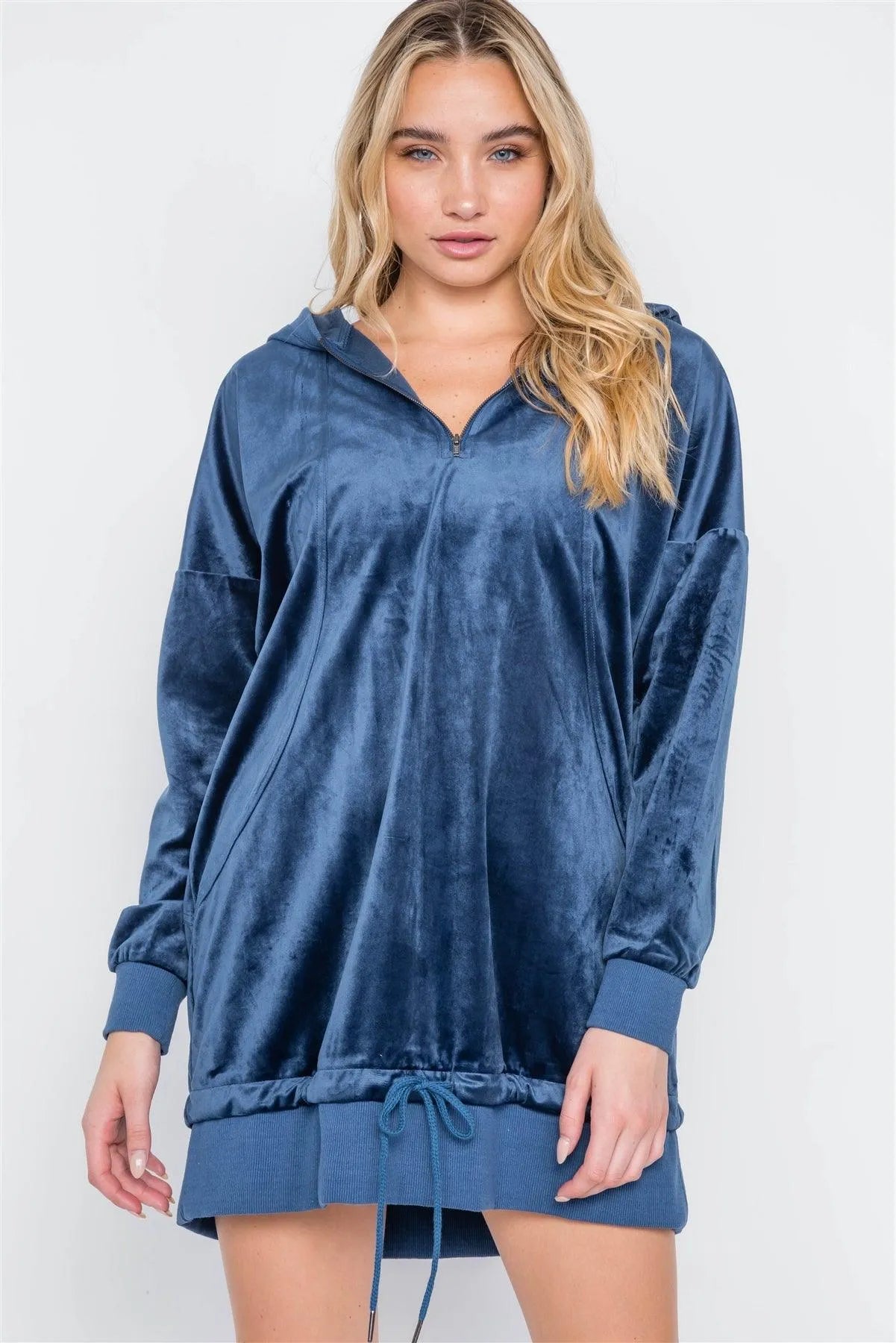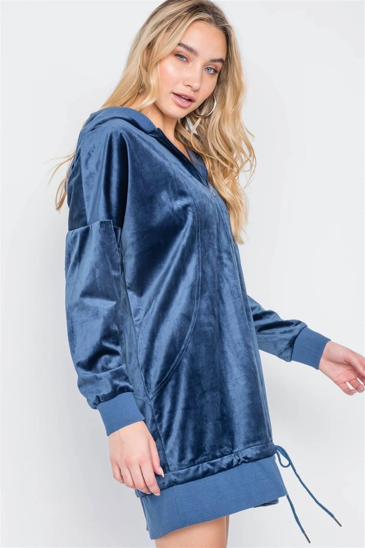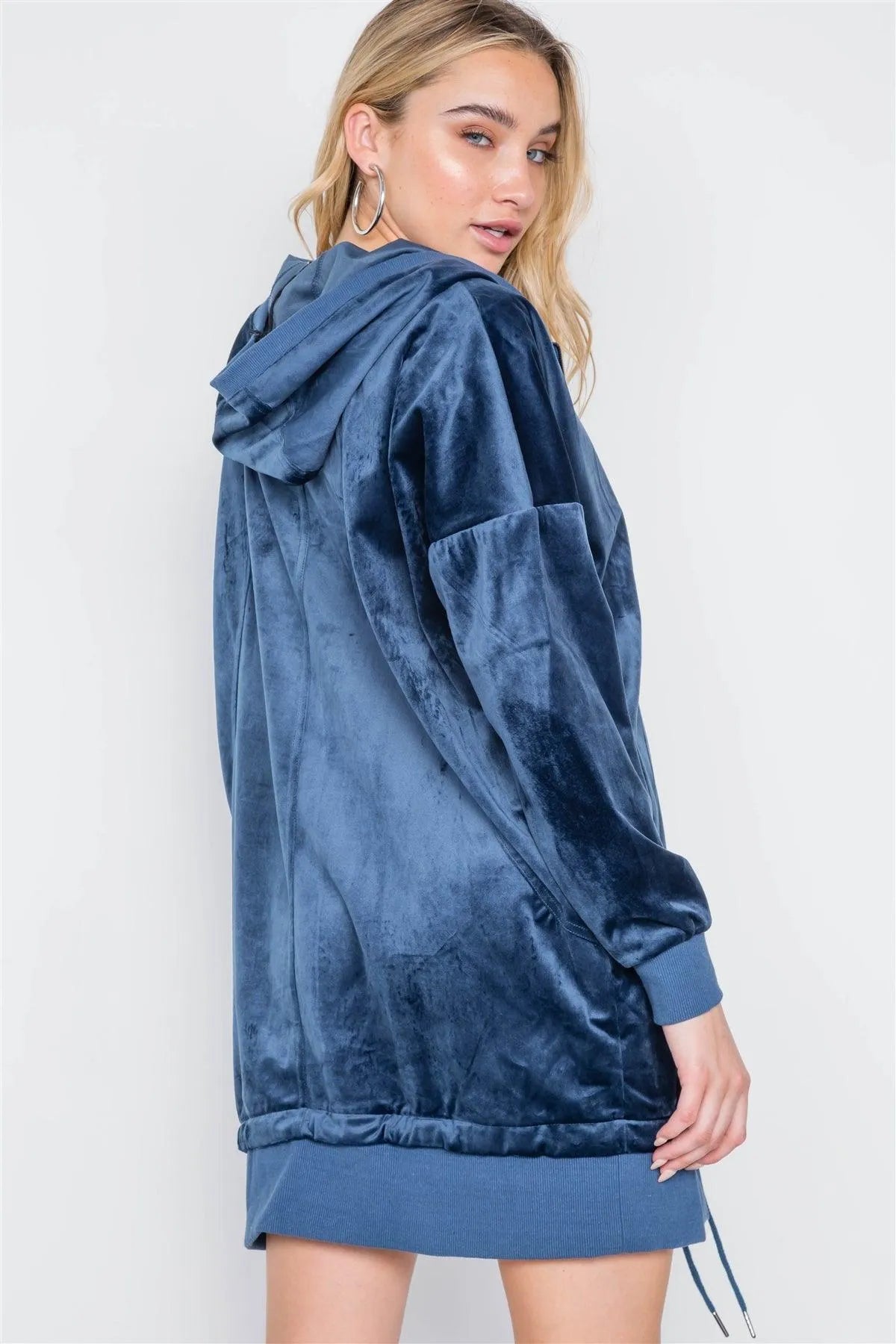 Navy Velvet Long Sleeve Hooded Mini Shirt Dress /2-2-3