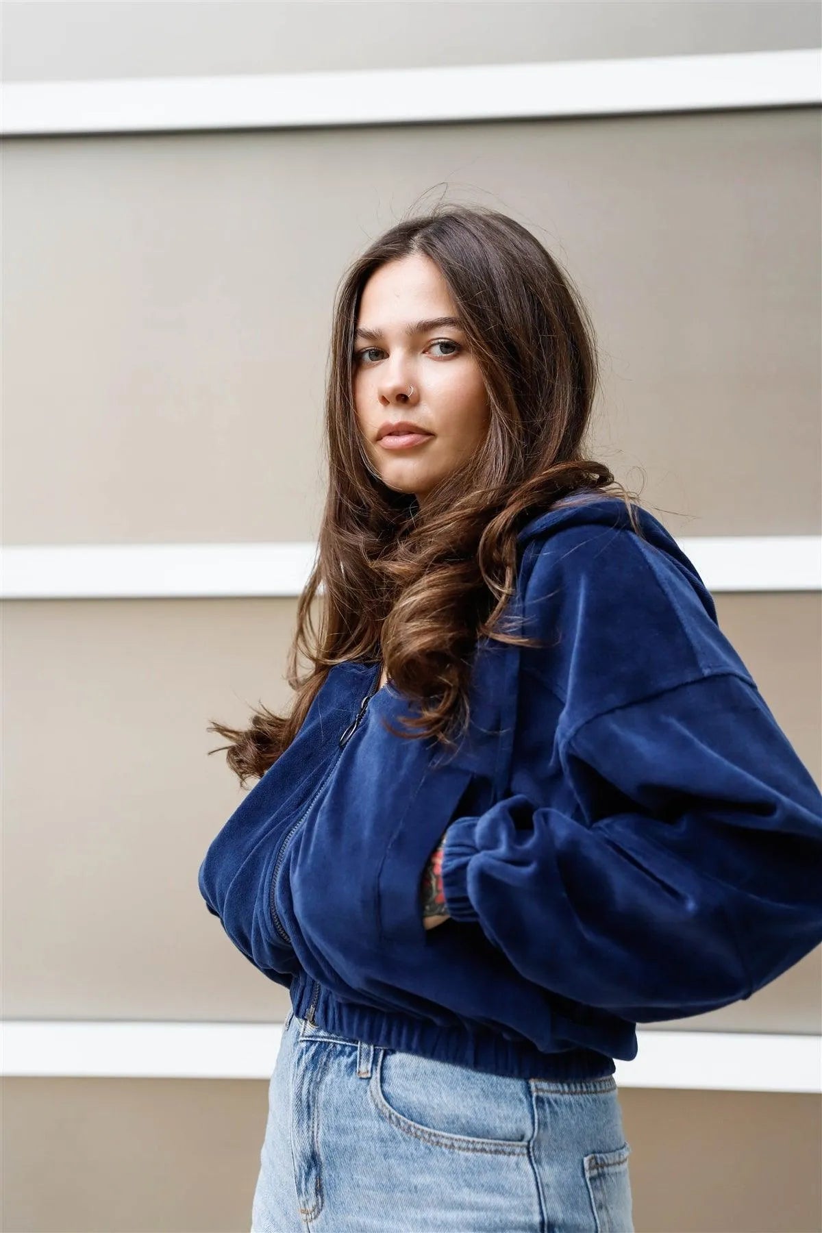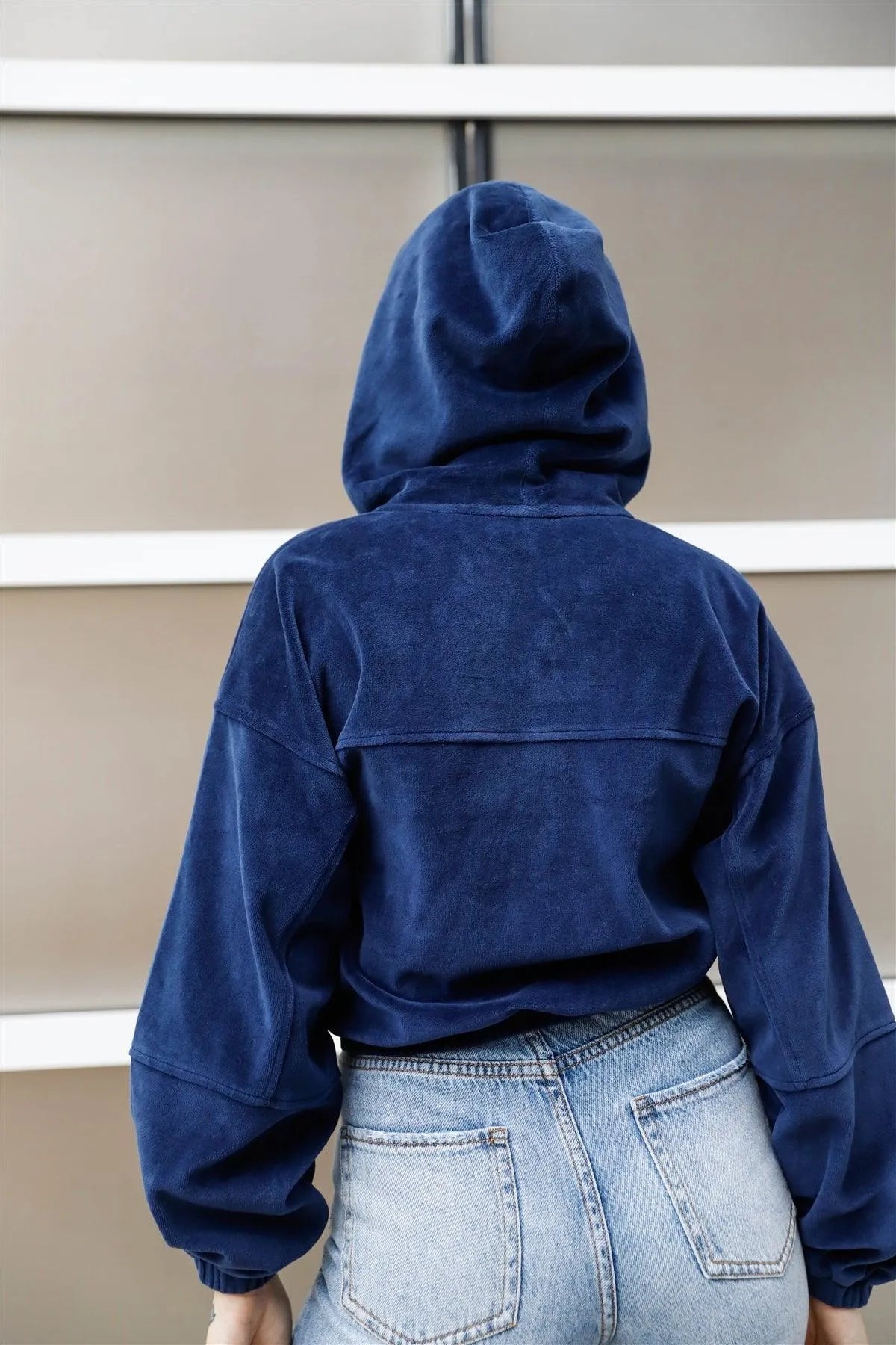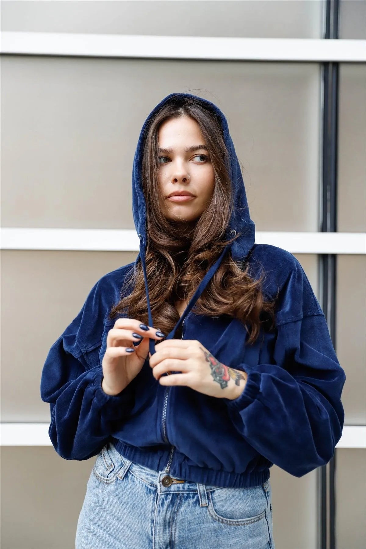 🖤Item Features: Navy, solid color, velvet material, stitch details all over, drawstring hood, O-ring zipper up closure, long balloon sleeves, dropped shoulders, side pockets, elasticized cuff & hem, oversize fit, cropped length, unlined, trendy, basic, street style, activewear, cotton, soft to touch
