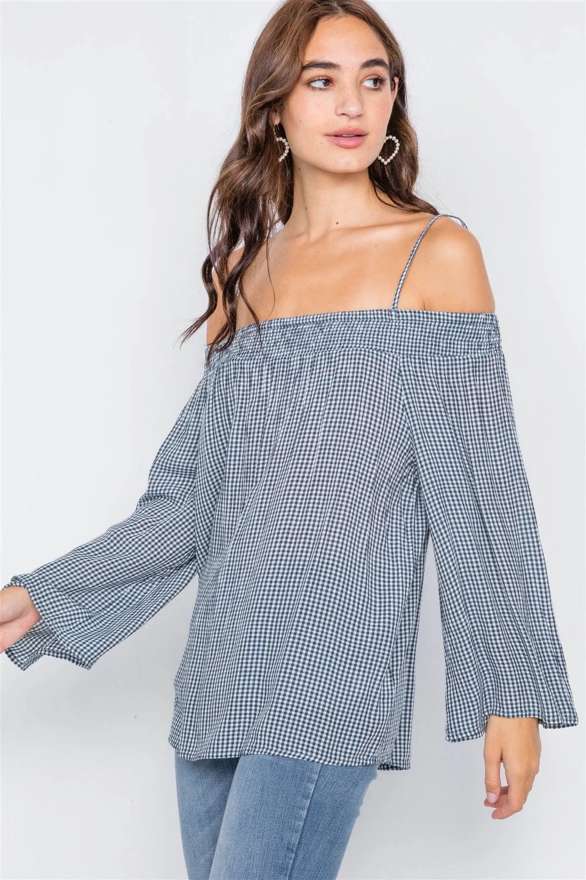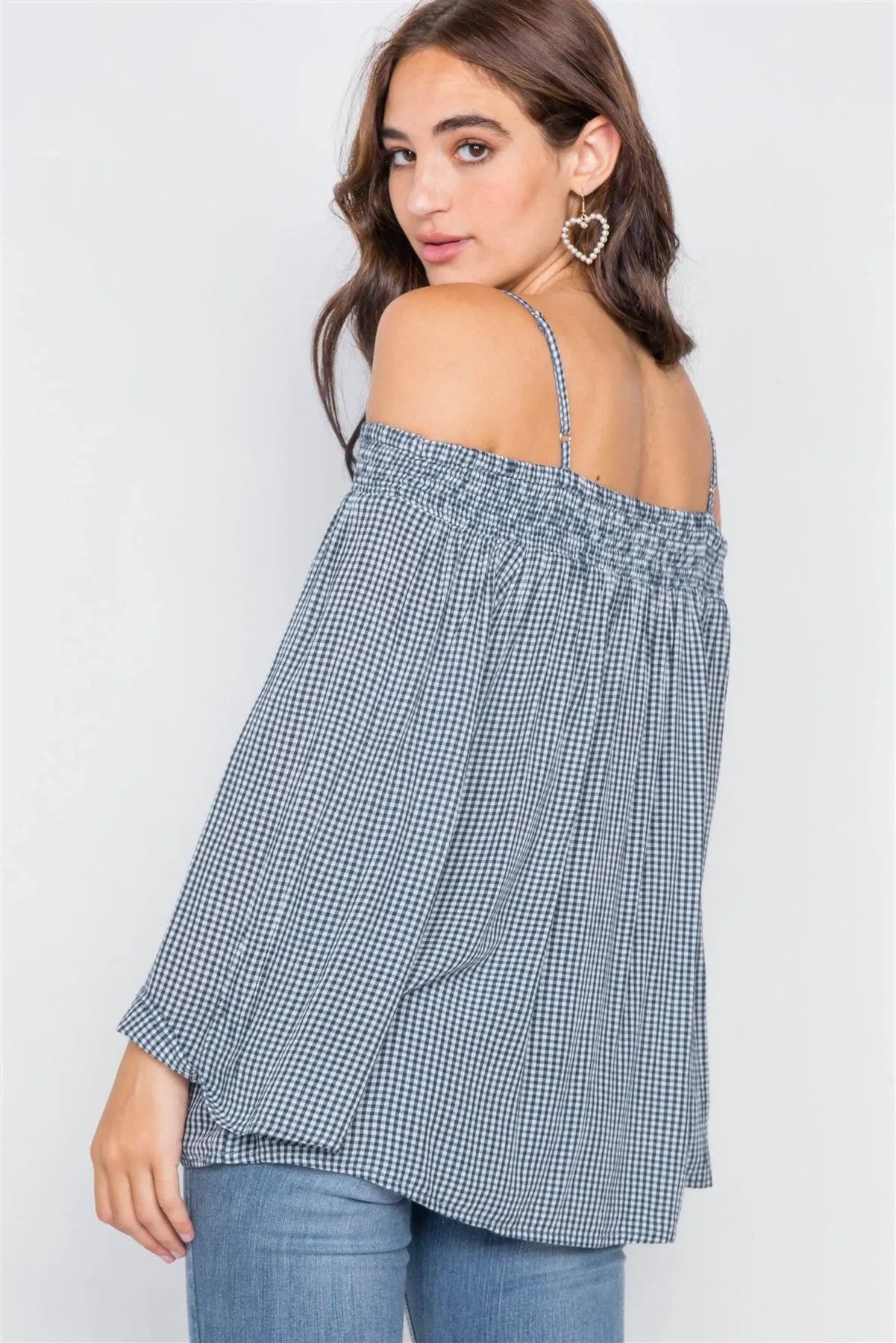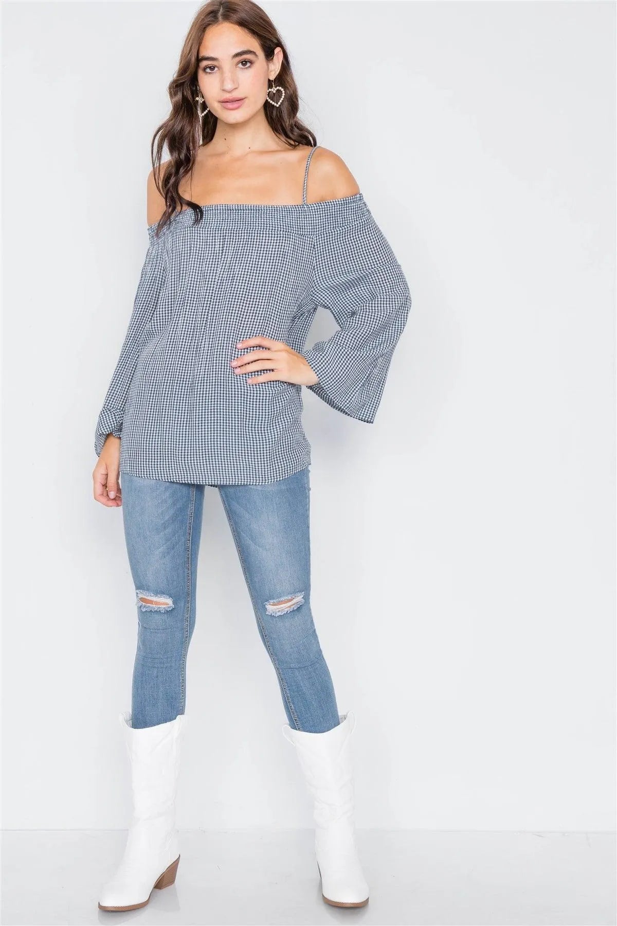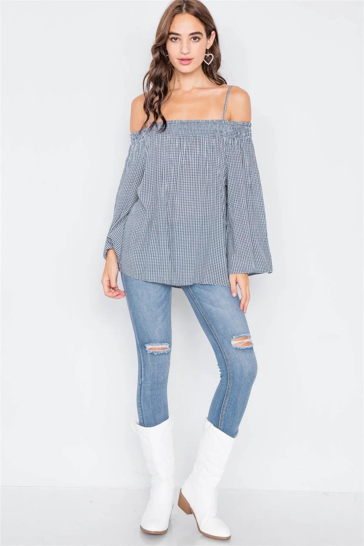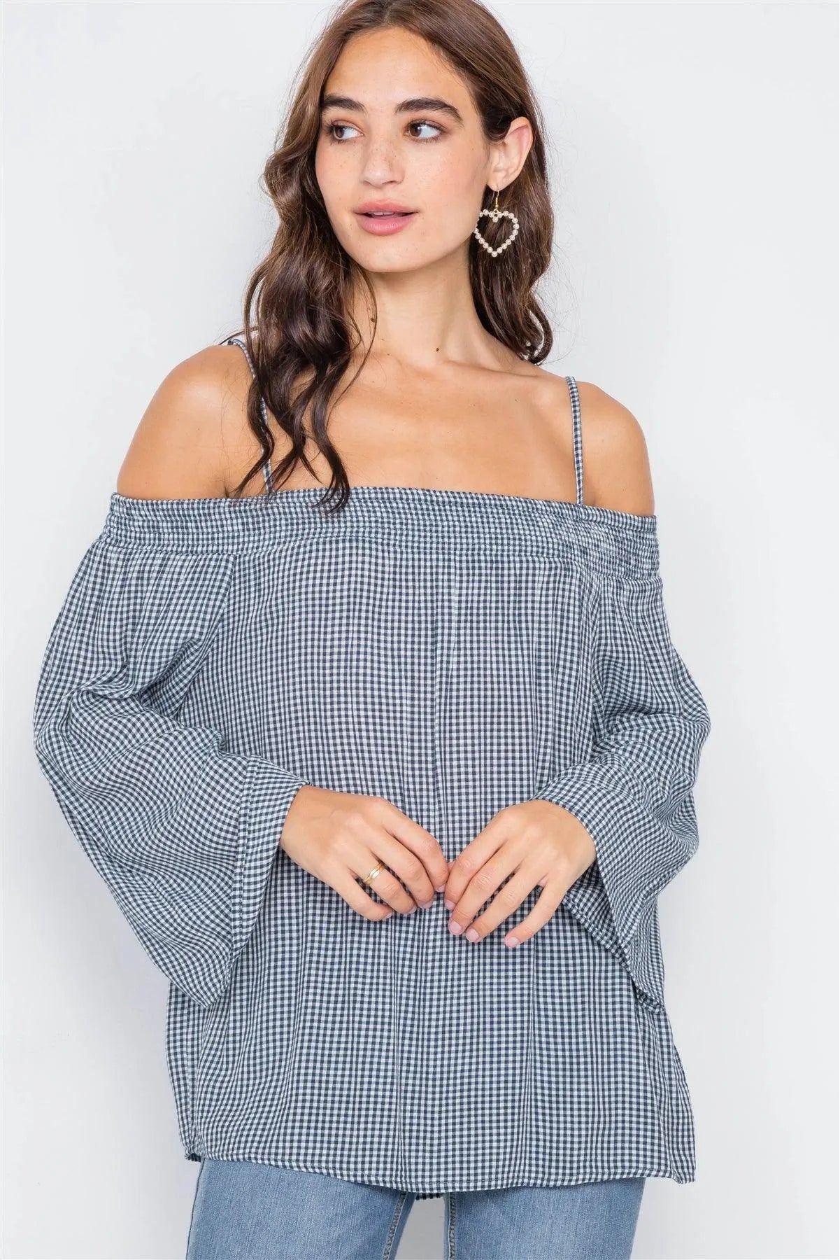 Navy & White Gingham Plaid Off-The-Shoulder Top /2-2-2