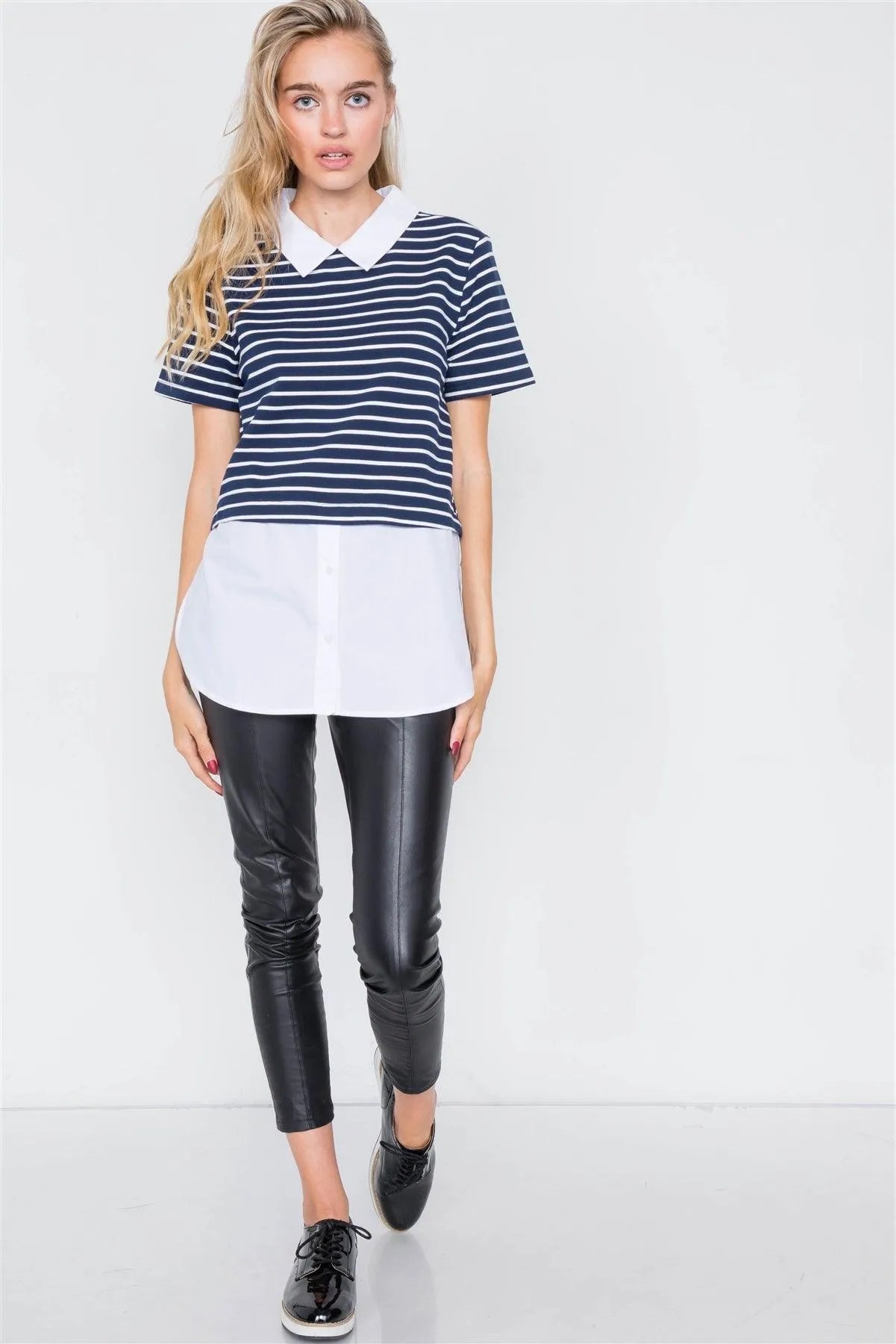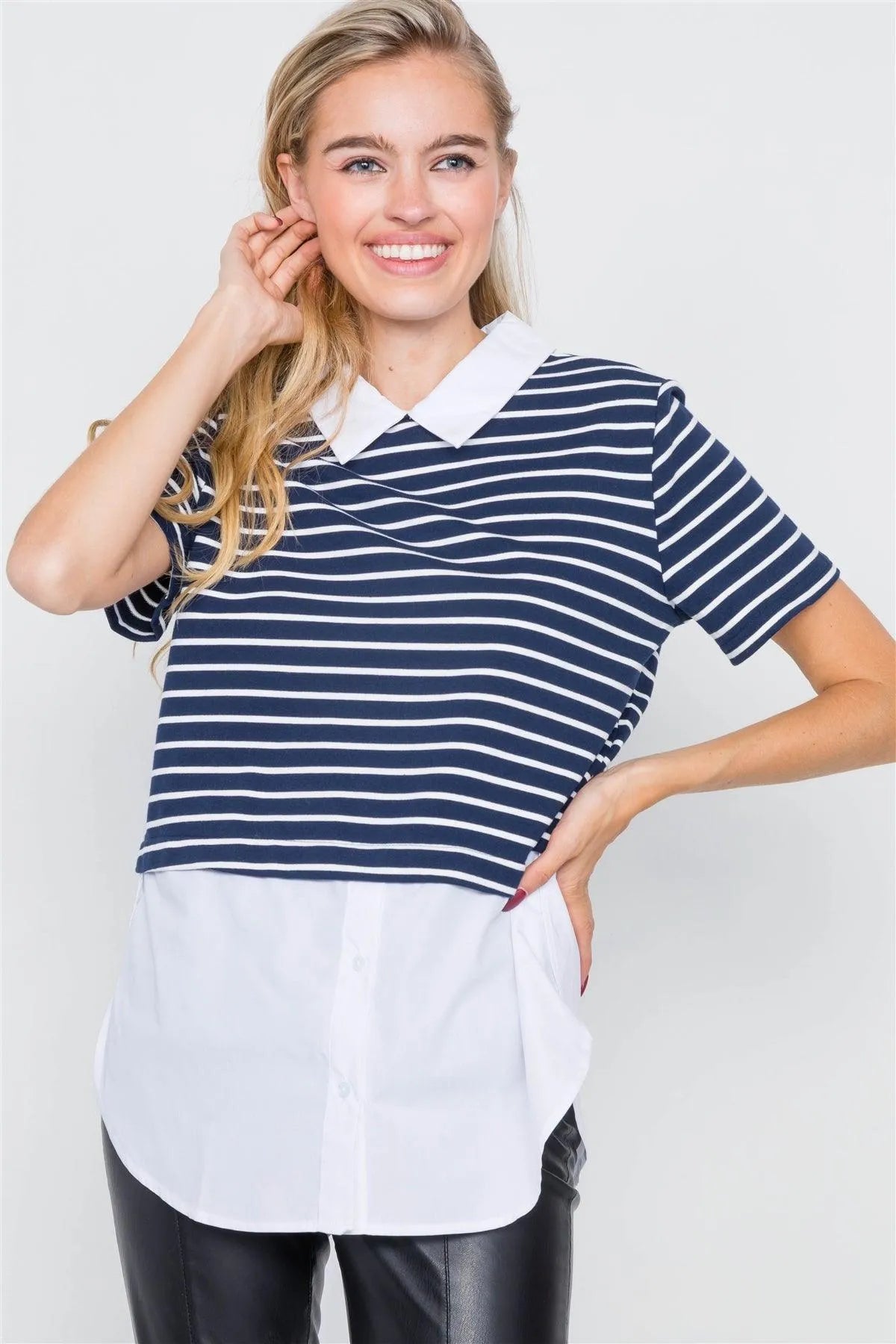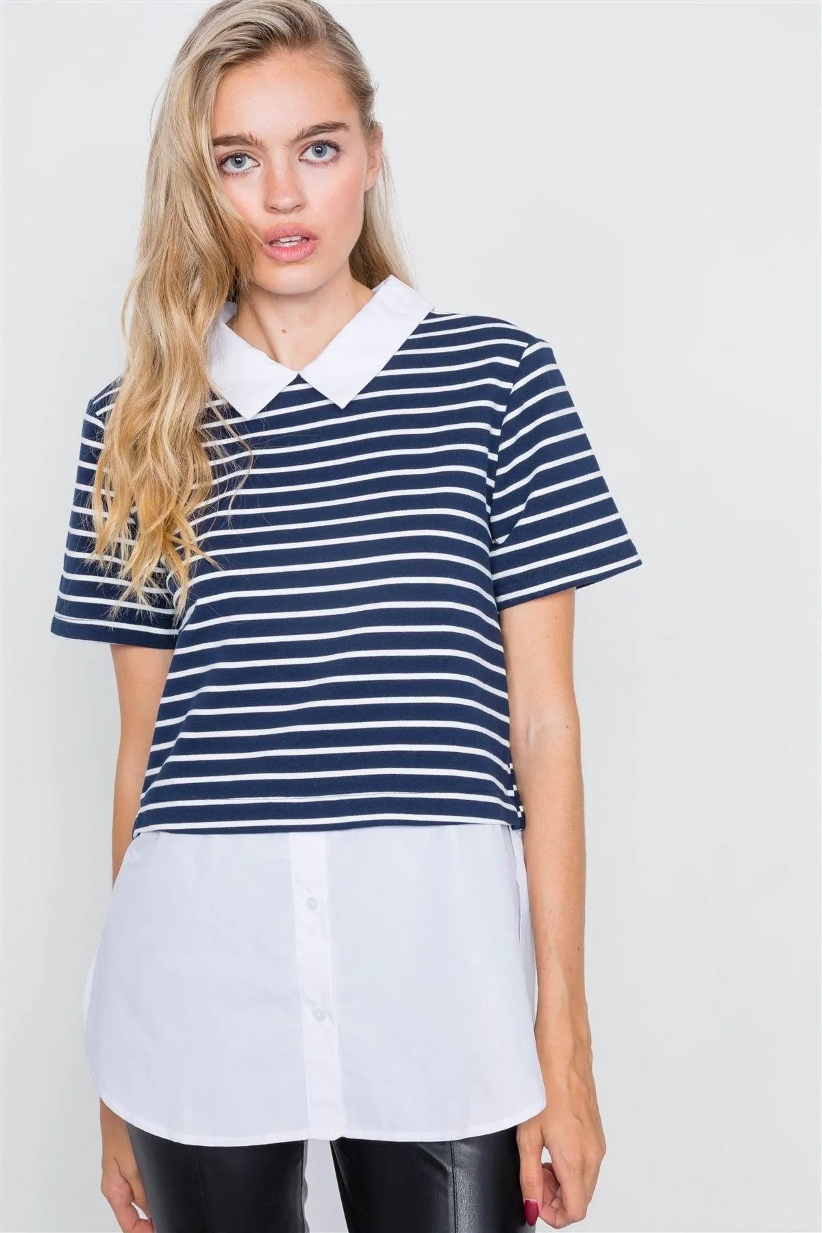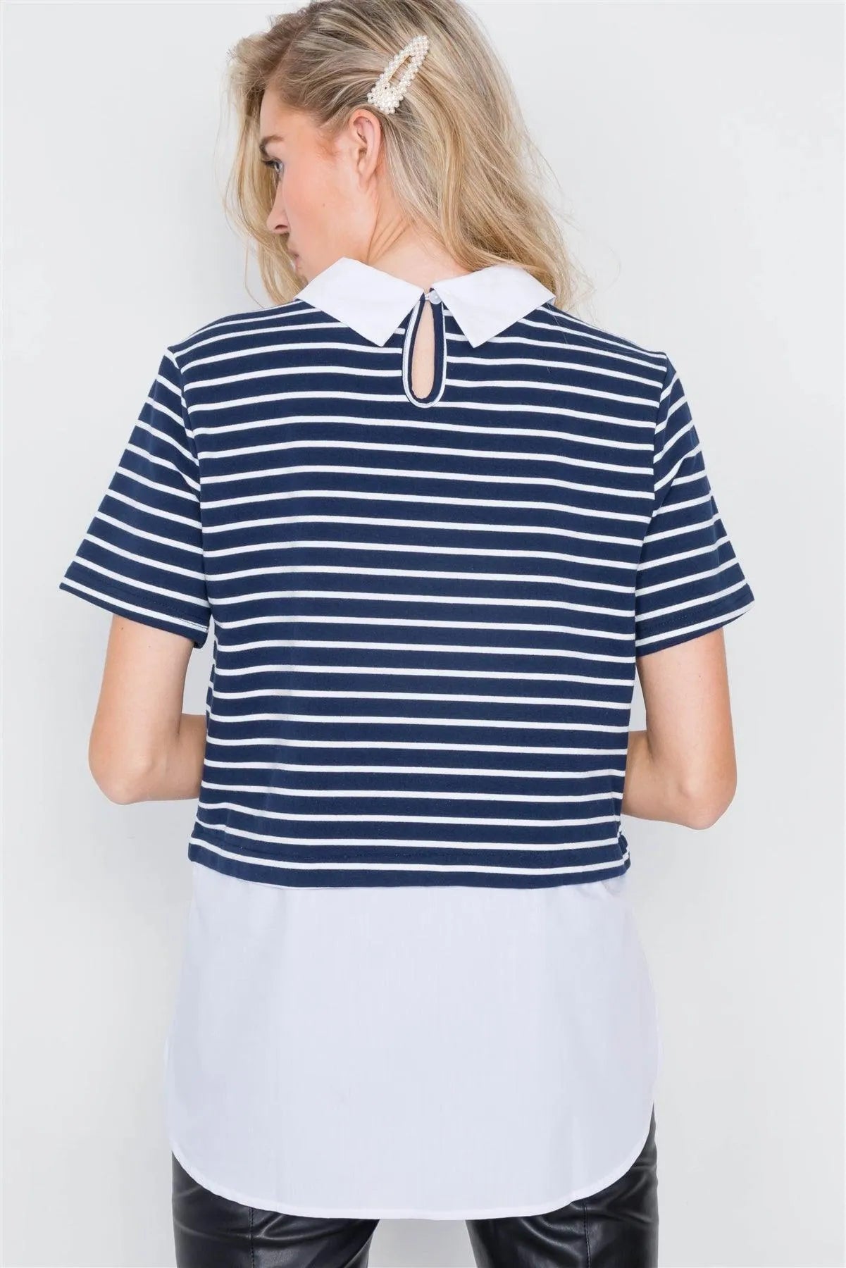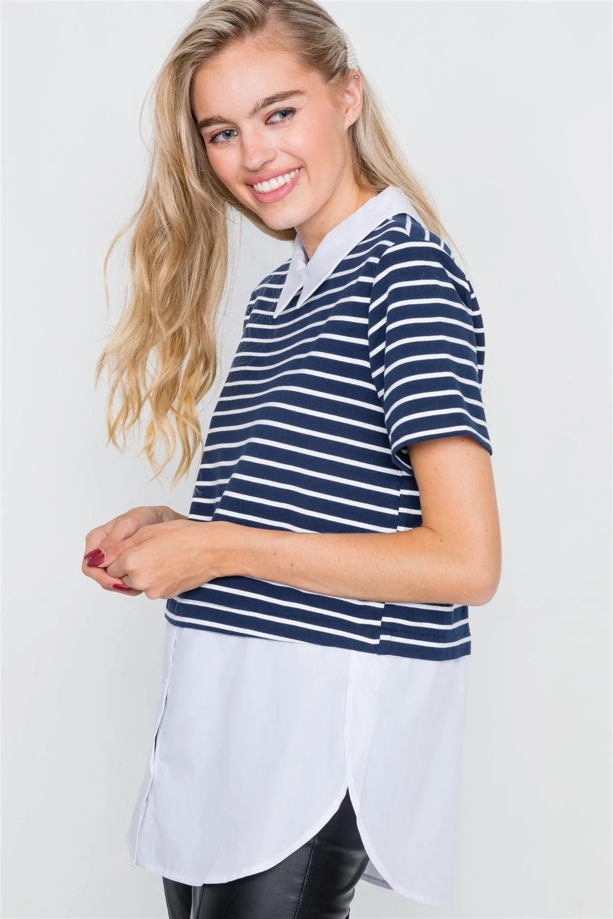 Navy & White Stripe Contrast Button Down Shirt Blouse /2-2-2