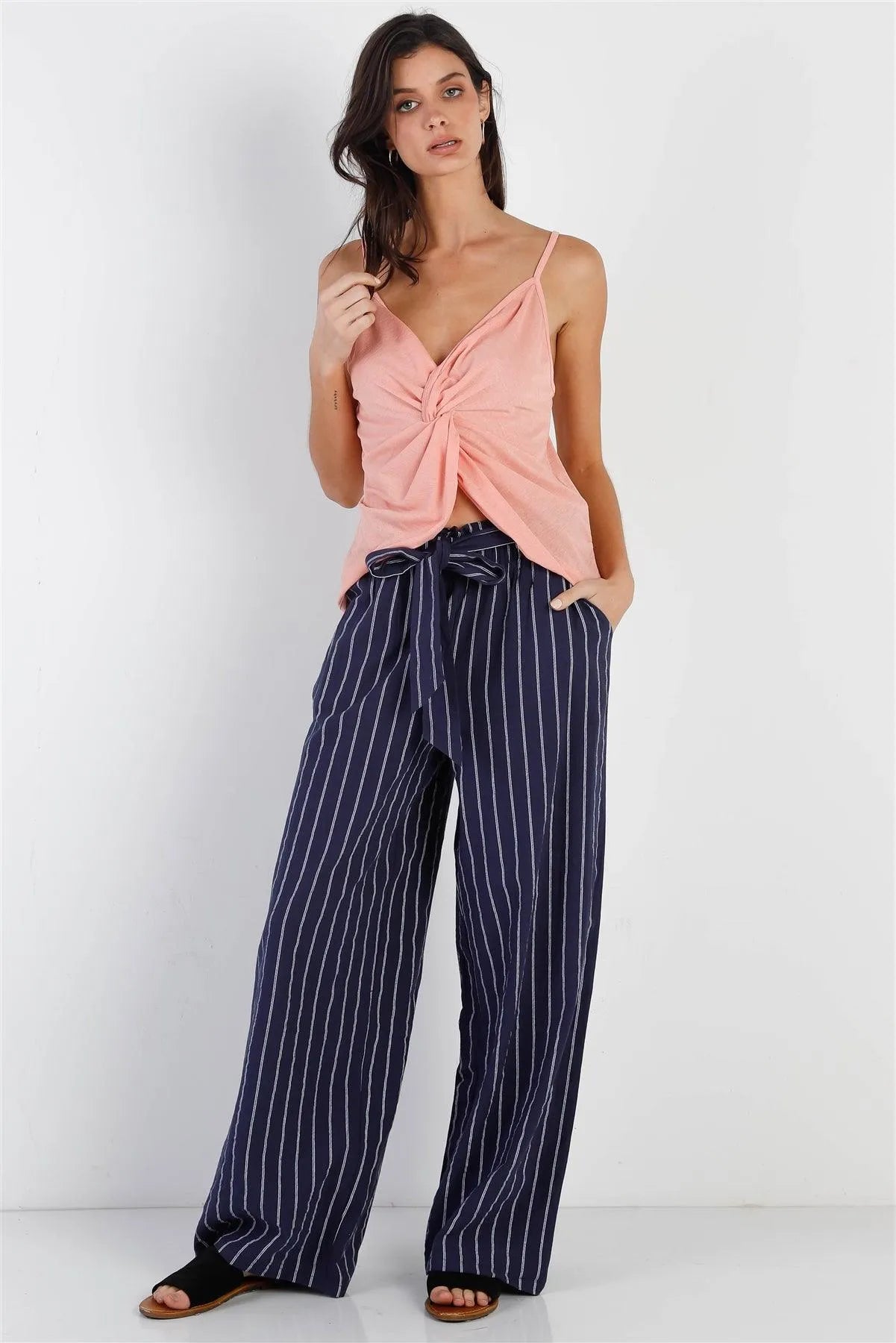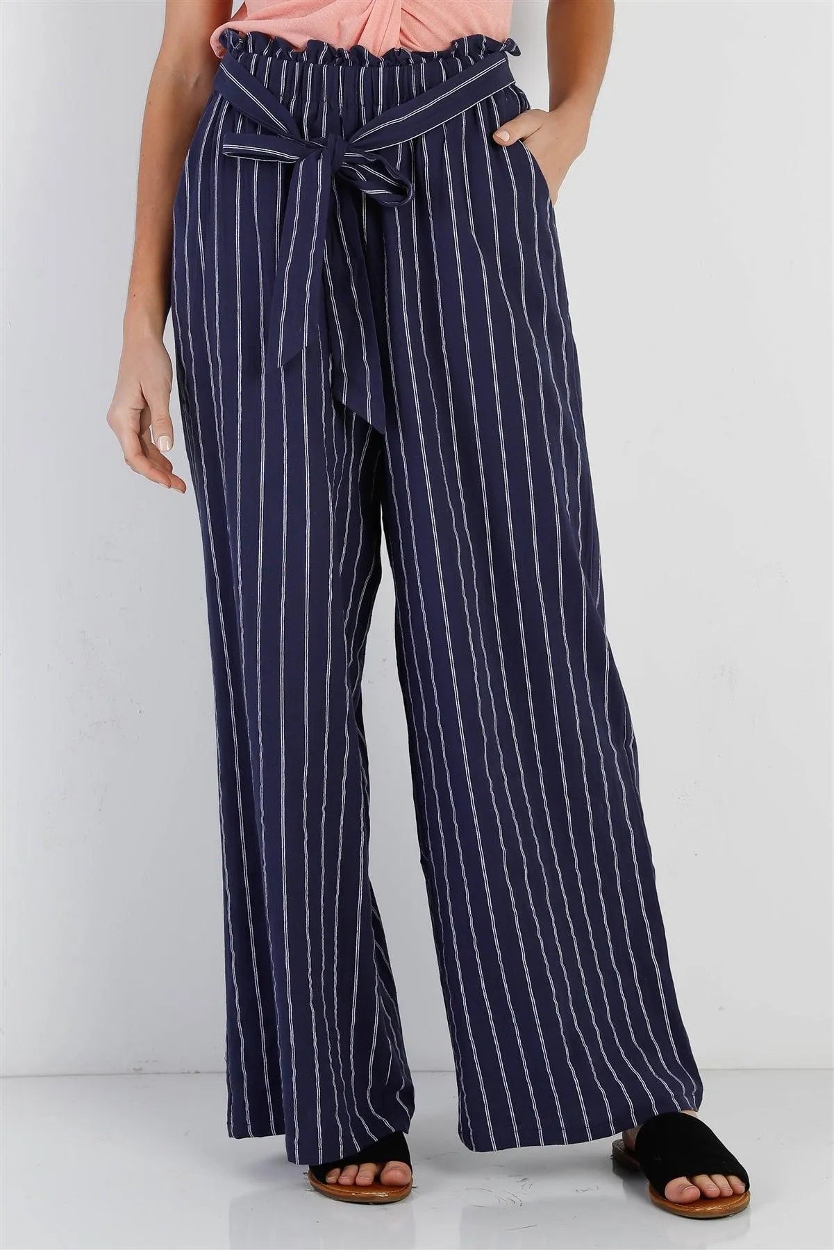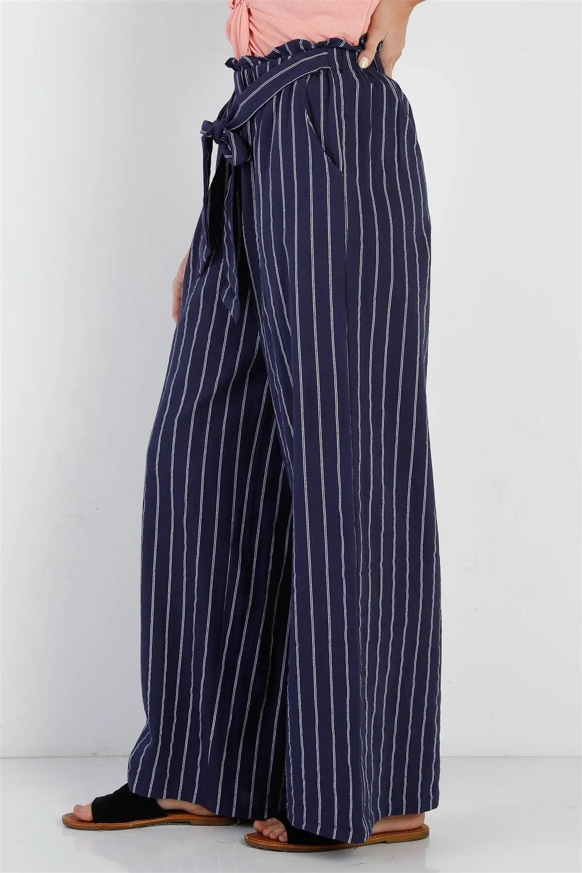 Navy & White Stripe Cotton Self-Tie Belted Wide Leg Pants /1-3-2-1