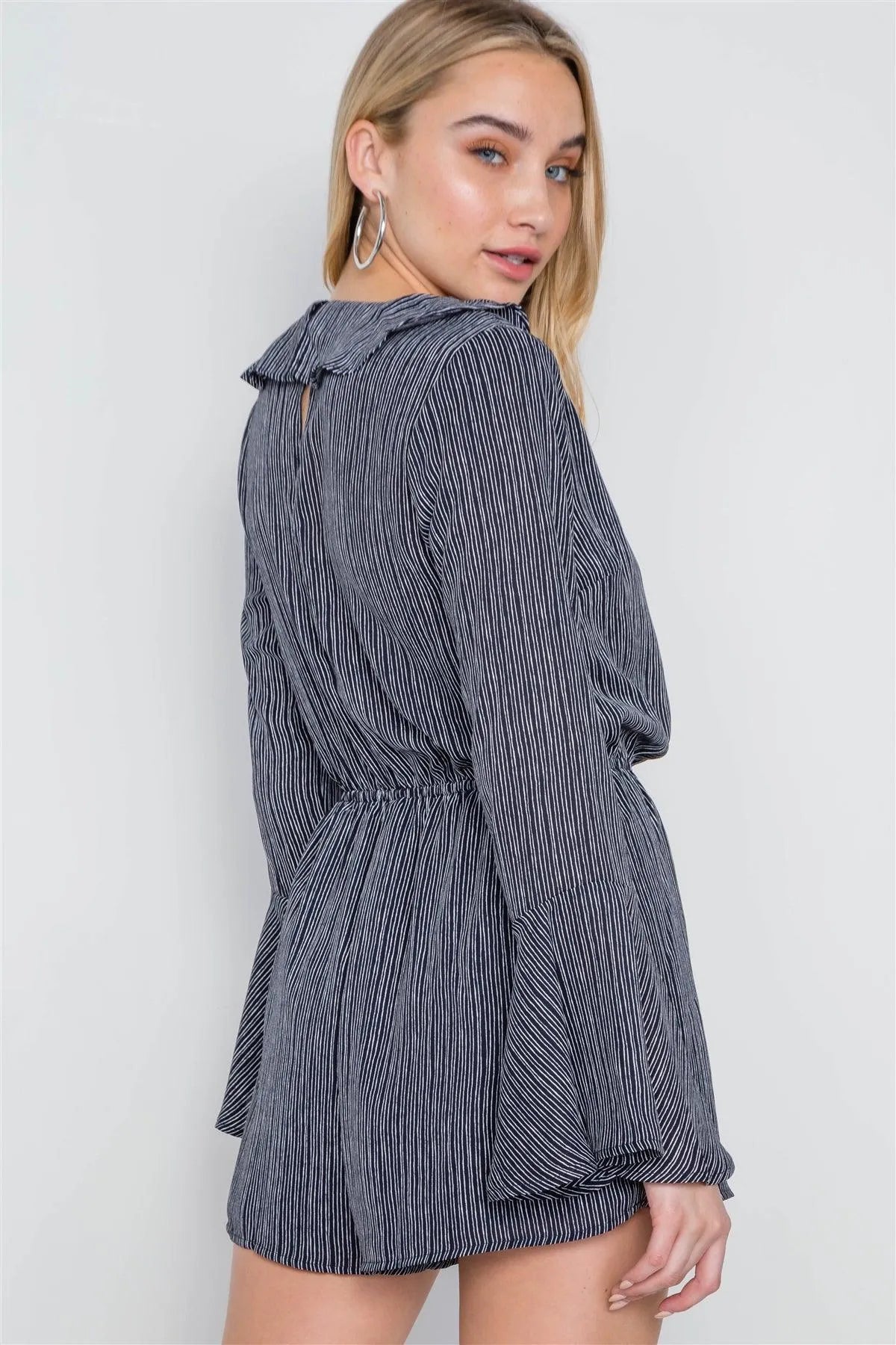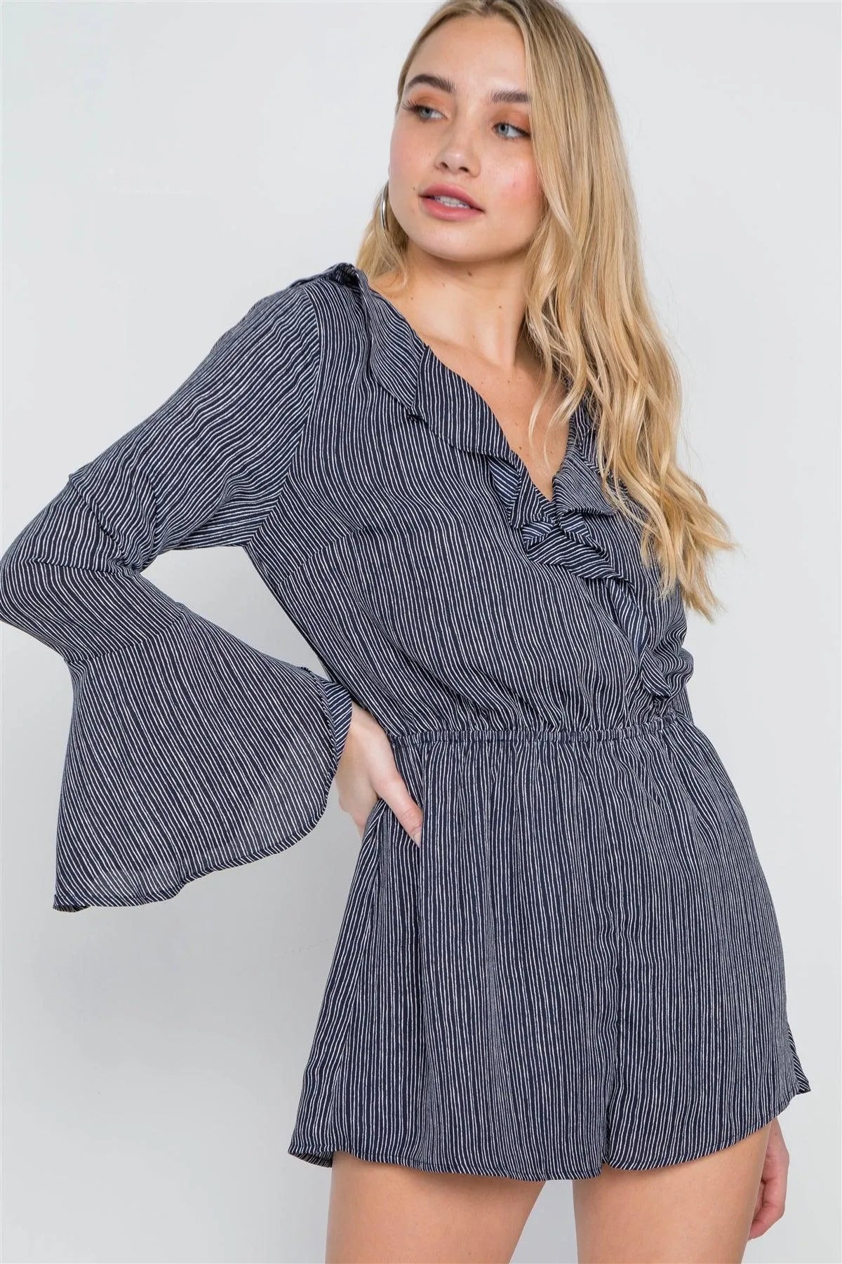 Romper features: surplice neck with snap button closure, long sleeve, stripe pattern allover, elasticized waist, flounce layer along neckline, back key-hole with button closure, linedModel is 5'8 wearing a size Small ( Waist: 24", Bust: 32B, Hips: 34")Item measurements: Length: 30", Bust: 34 ", Sleeves: 25"True to size