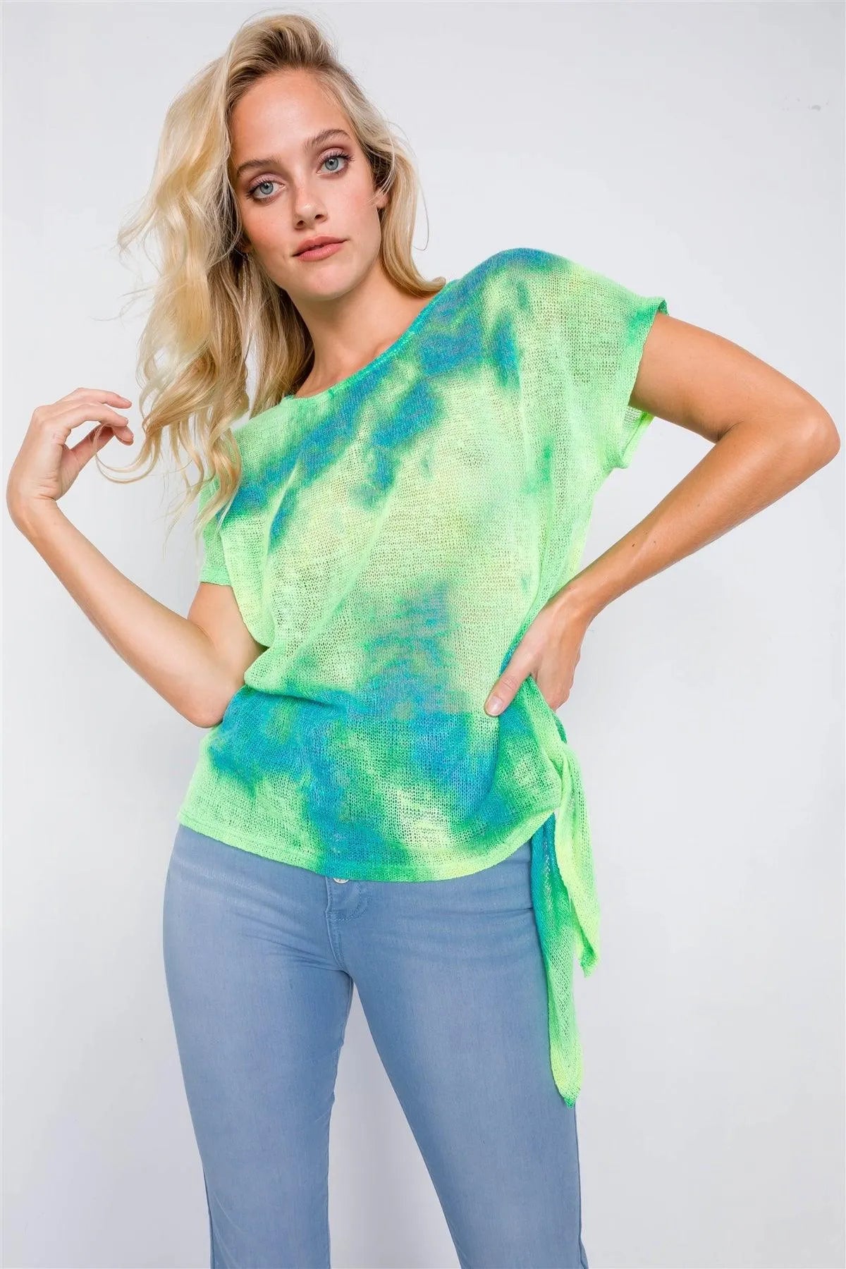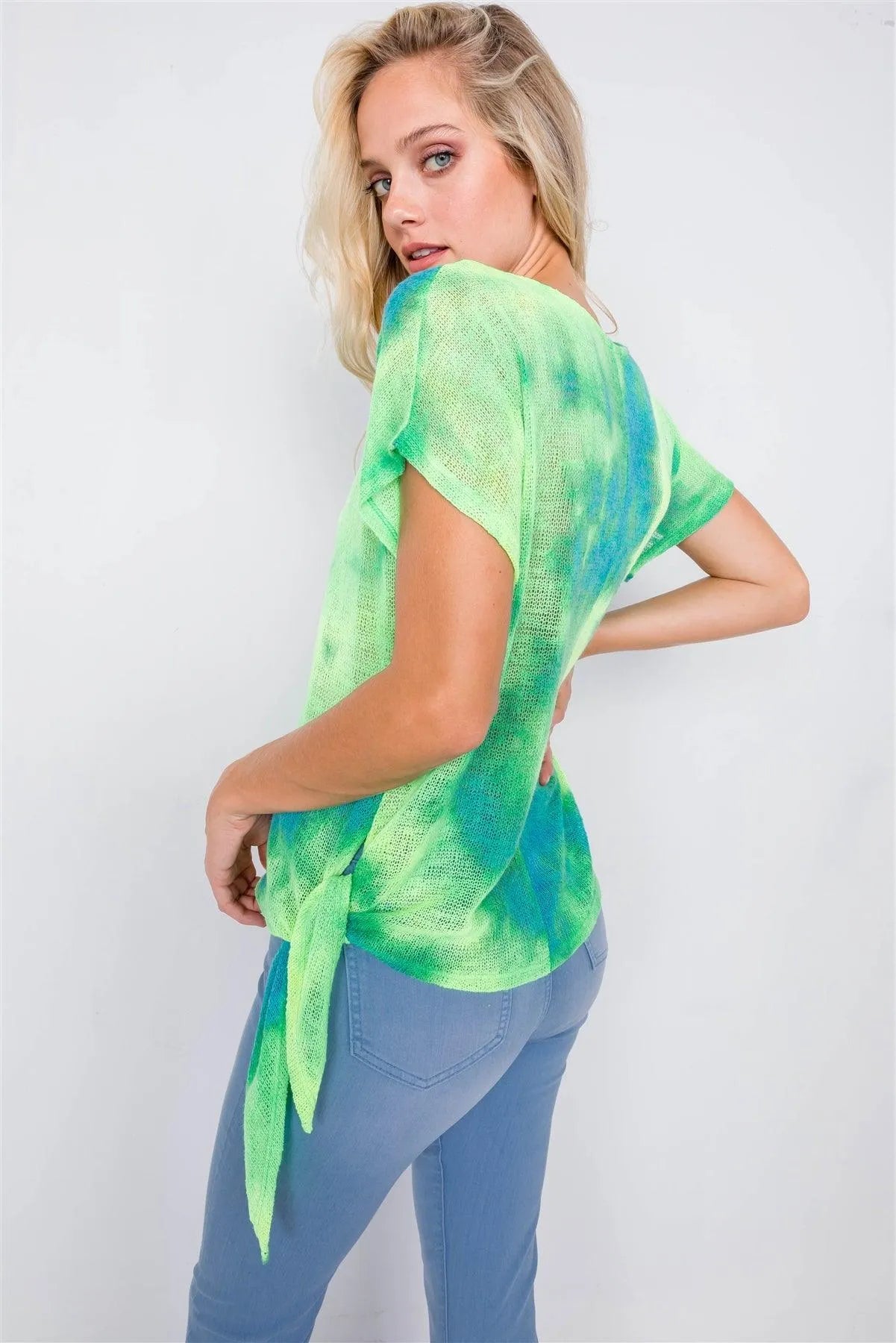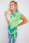 Neon Green & Blue Tie Dye Sheer Knit Side Knot Sporty Top /2-2-2