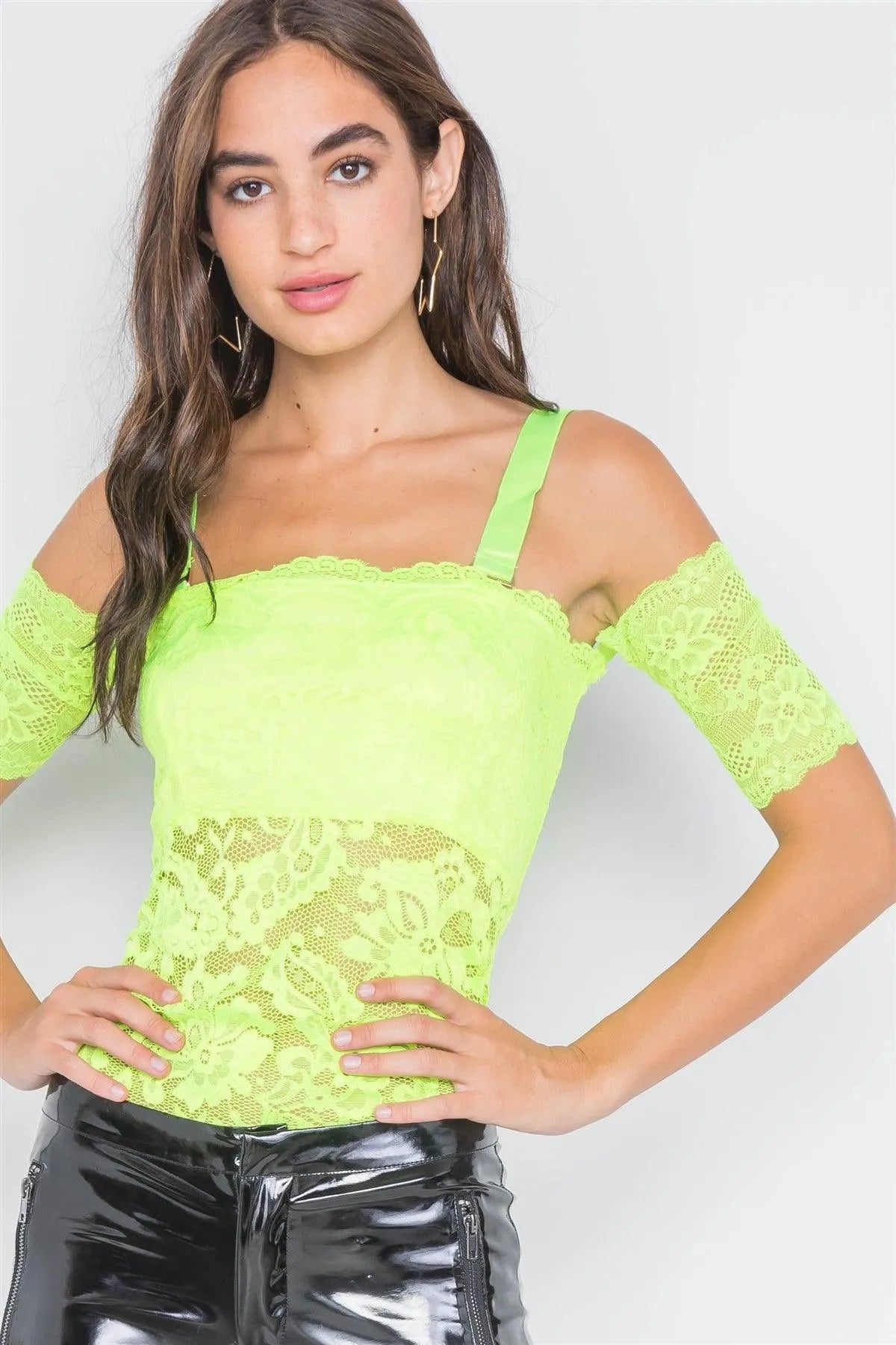 Neon Green Cami Off-The-Shoulder Floral Lace Bodysuit