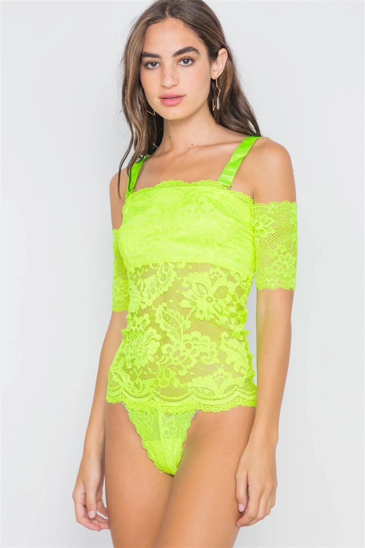 Neon Green Cami Off-The-Shoulder Floral Lace Bodysuit /2-2-2