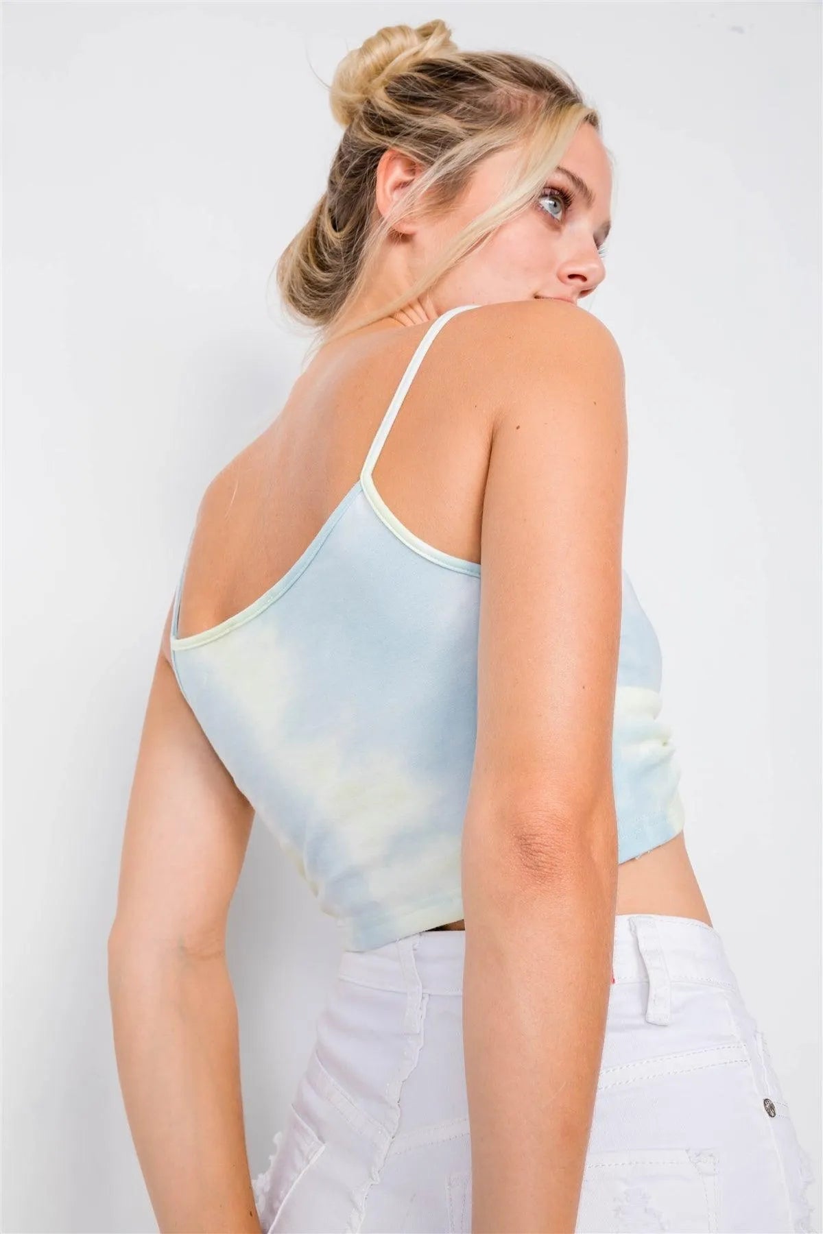 Top features: crop length, twist front knot, cami straps, v-neck, sporty, athletic, chis, vintage, yellow blue and white tie dye print, very stretchy, unlined.Item measurements: Length: 13" Bust 30"Model is 5'8 and wearing a Small ( Bust: 32B", Waist: 25", Hips: 35.5")True to sizeAlso available in Pink