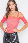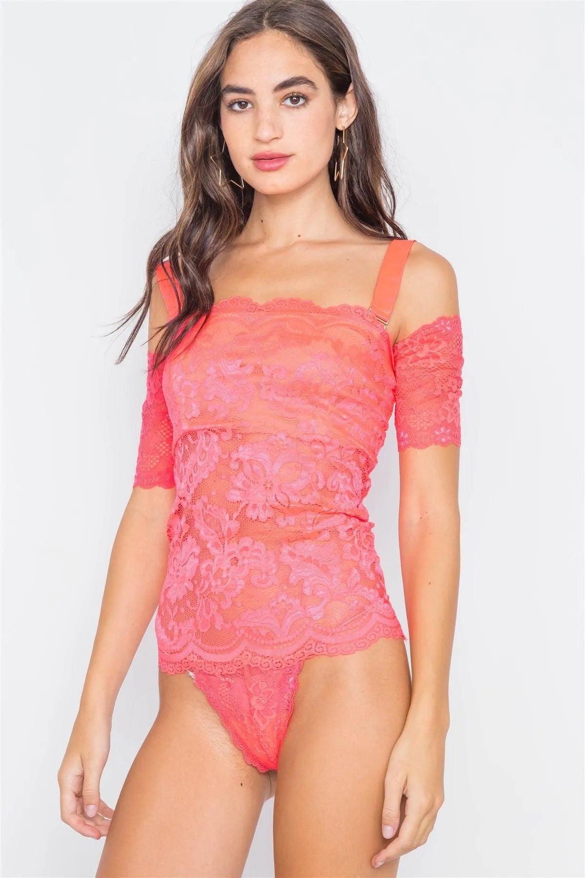 Neon Pink Cami Off-The-Shoulder Floral Lace Bodysuit