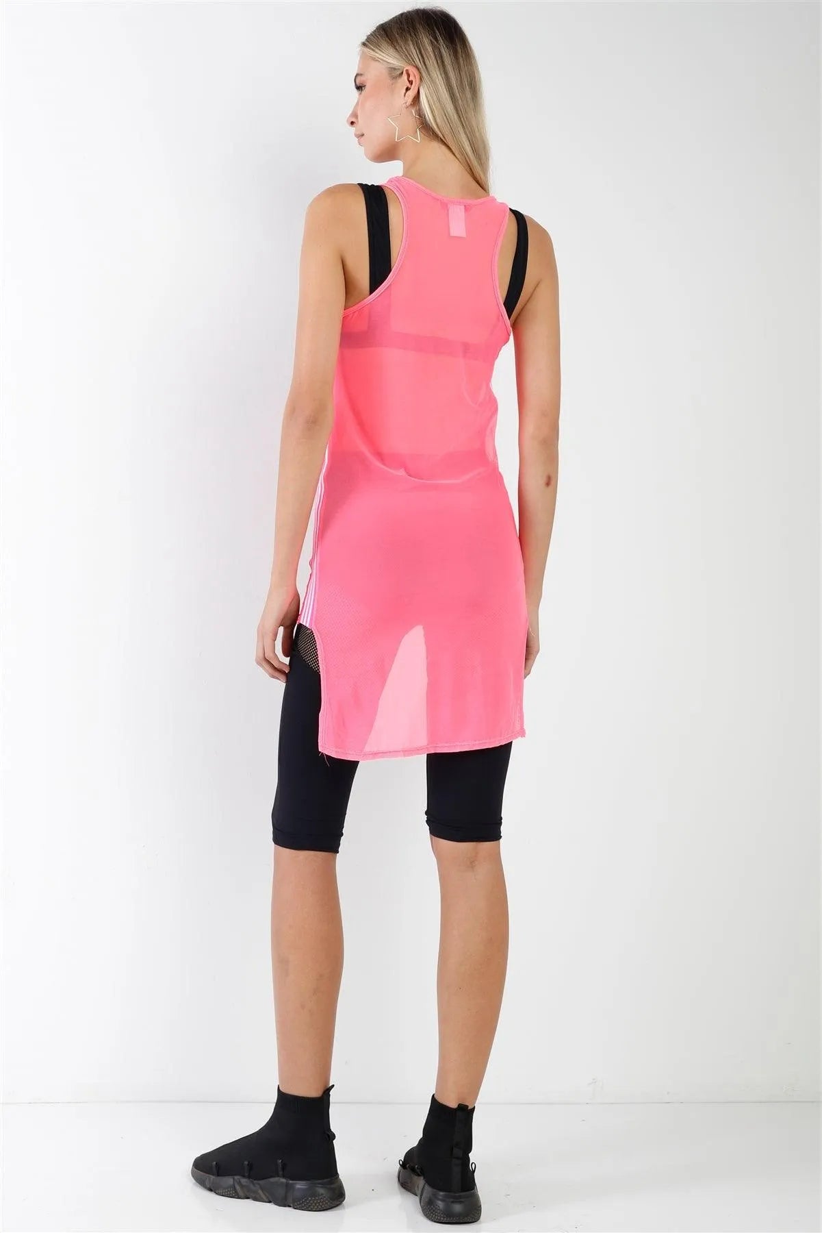 🖤 Item Features: Neon pink, large front print detail, sleeveless, scoop neckline, uneven length, light stretch multicolor striped side strap detail, semi-sheer, light stretch, unlined, tunic length, casual, sporty, sportswear, lightweight, breathable, comfy, spring/summer collection