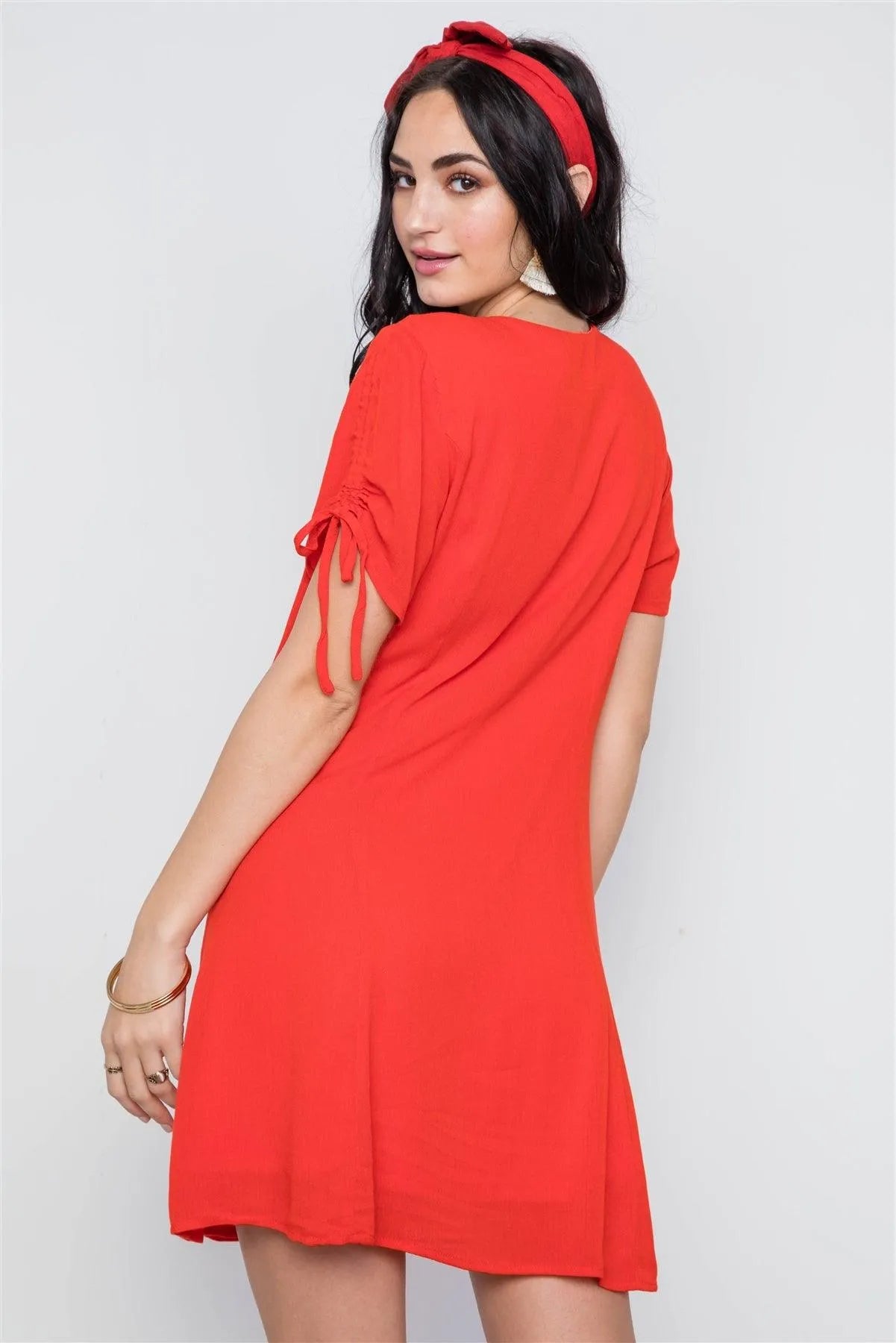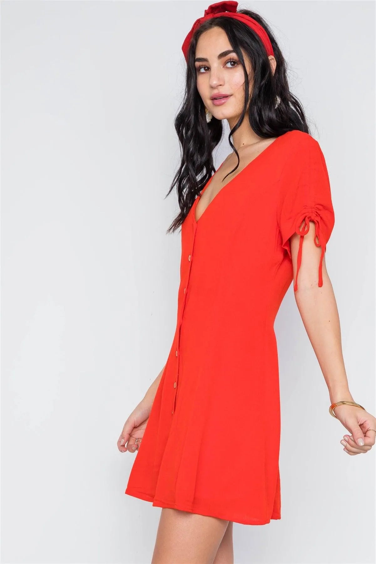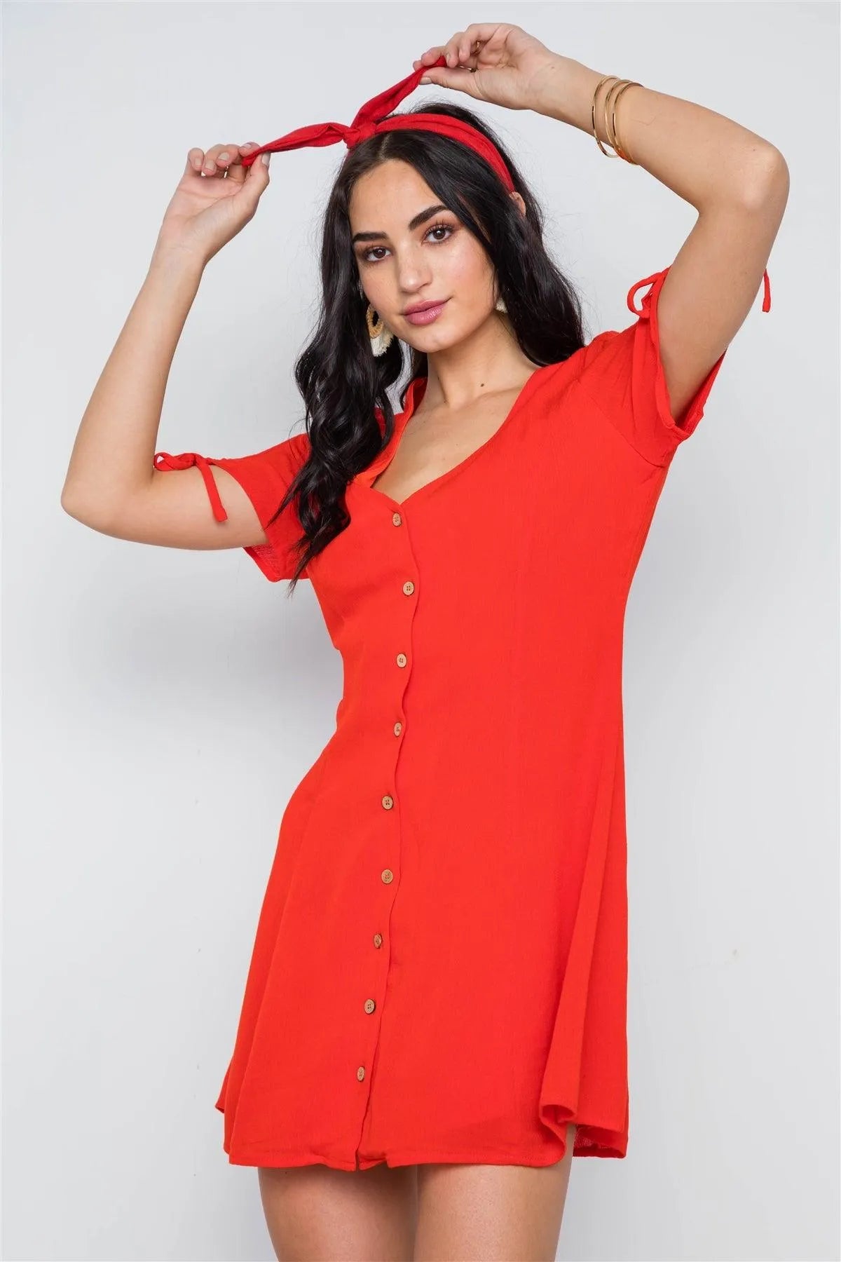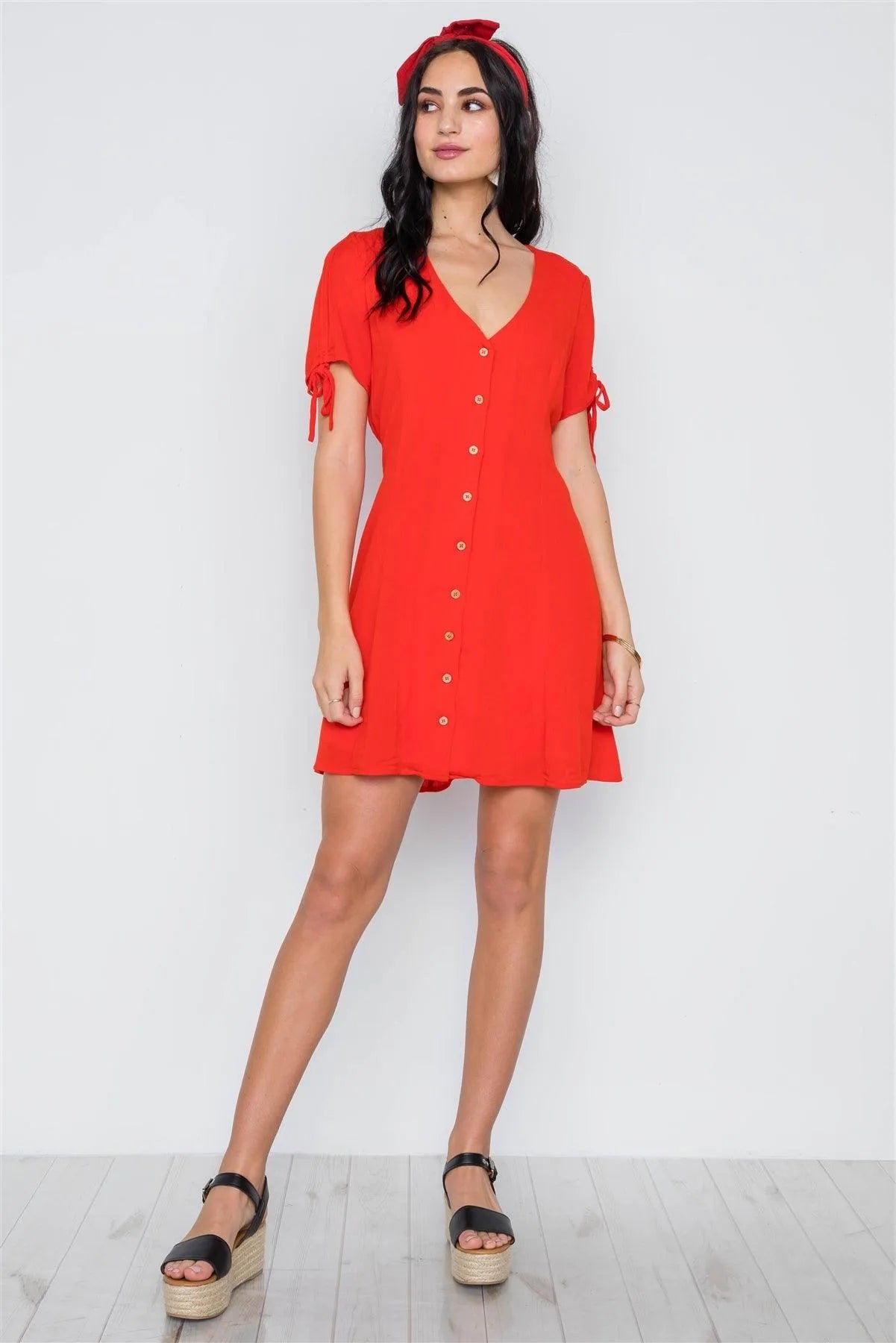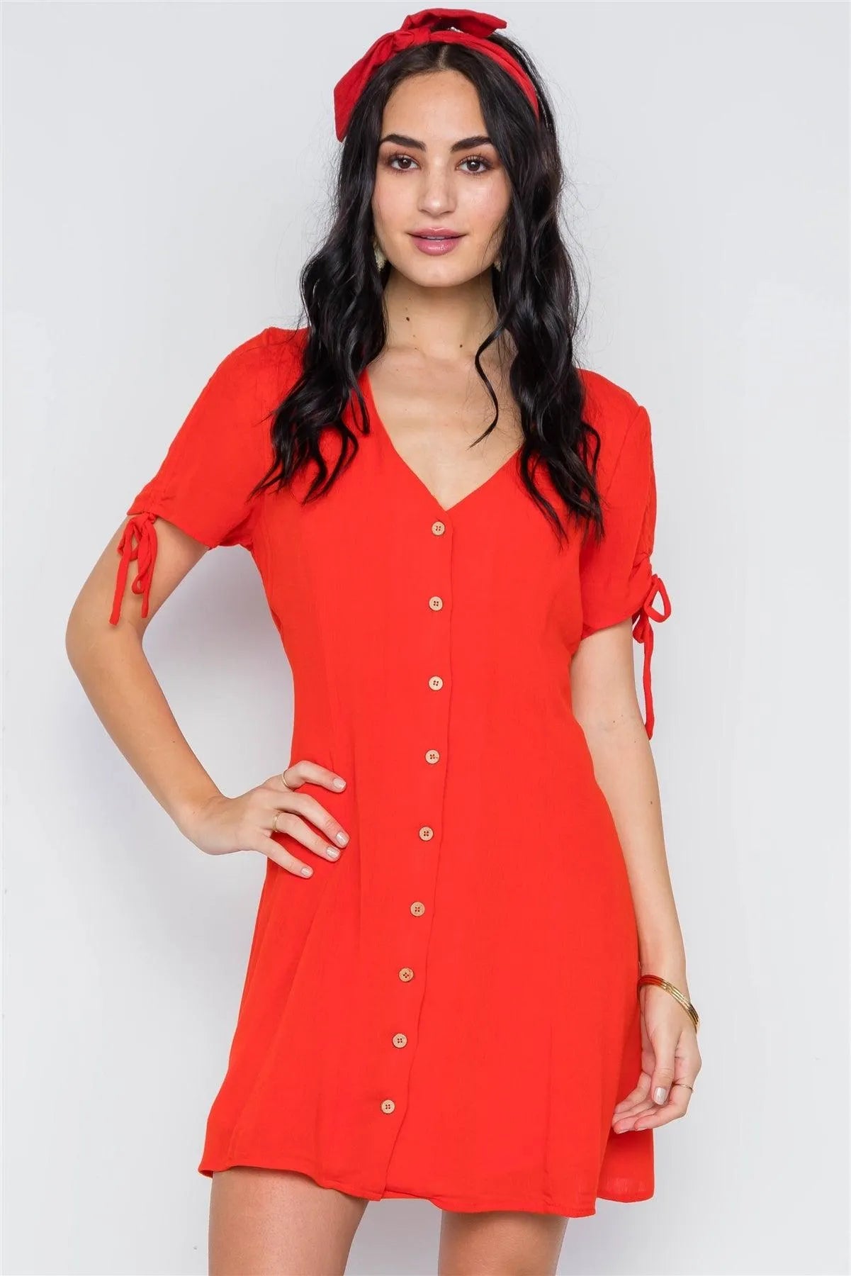 Neon Red Button Down Short Sleeve Mini Dress /3-2-1