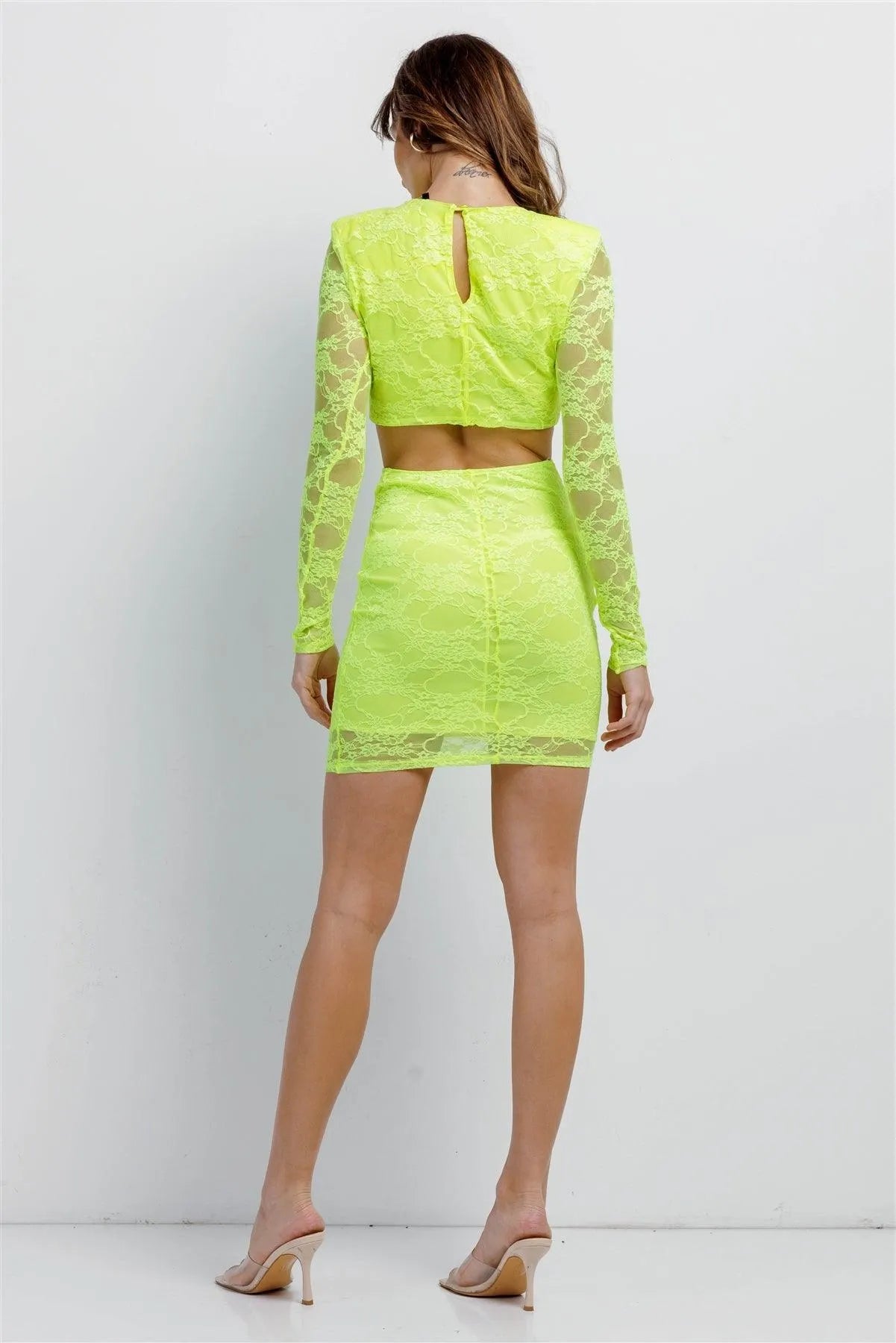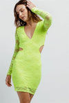 Neon Yellow Floral Lace V-Neck Long Sleeve Side Cut Out Open Back Dress Mini Dress /3-2-1