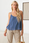 🖤 Get ready to turn heads in our Blue Strappy Pleated Cami Top! This top not only features a flattering pleated design, but also adjustable straps for a perfect fit. Perfect for any occasion, it's the ultimate combination of style and comfort.