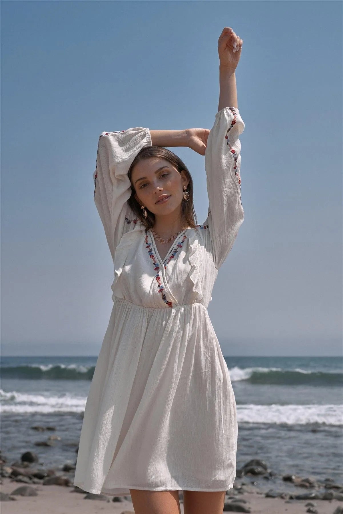 Nude Boho Floral Embroidery Wrap V-Neck Ruffle Trim Detail Long Balloon Sleeve Mini Dress /1-2-2-1