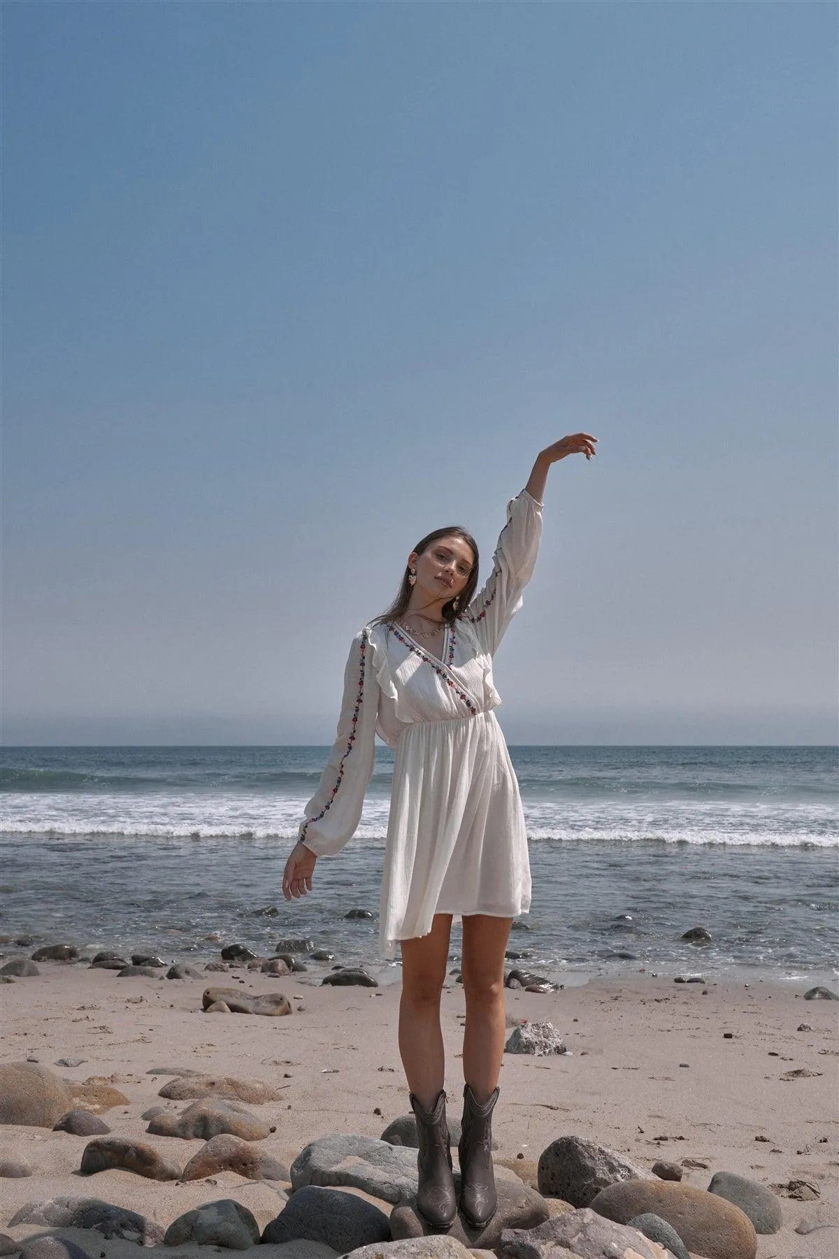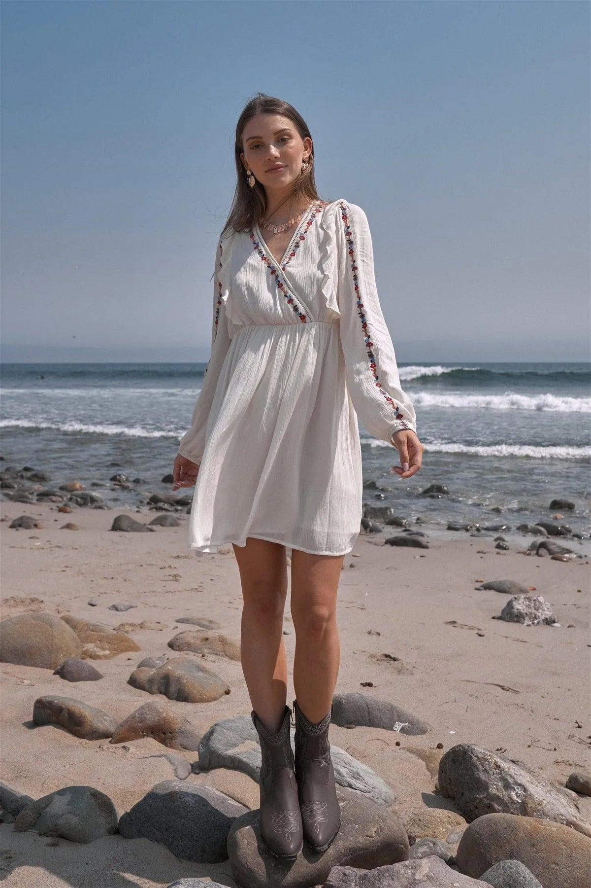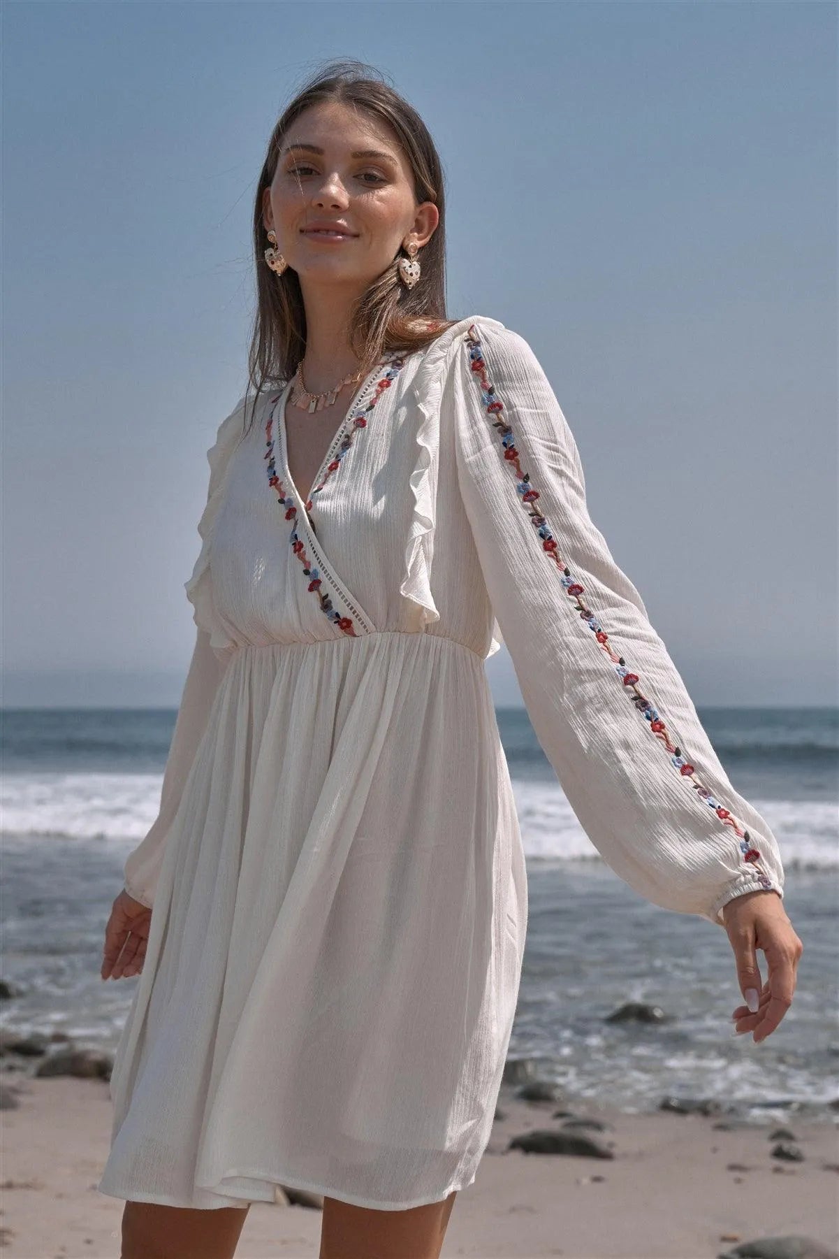 🖤 Item Features: Nude, 100% cotton, front clasp button wrap deep plunge V-neckline, floral embroidery, front ruffle trim detail, elasticized waistband, long sleeve with elastic cuff, lightly pleated, lined, non-stretch, regular fit, mini length, lightweight, casual, boho, festival wear, stylish, dreamy, breathable, eco, fall/winter collection