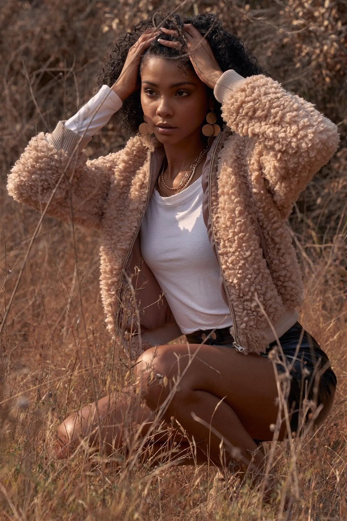 Nude Long Sleeve Zip Front Faux Fur Bomber Jacket /2-2-2