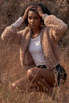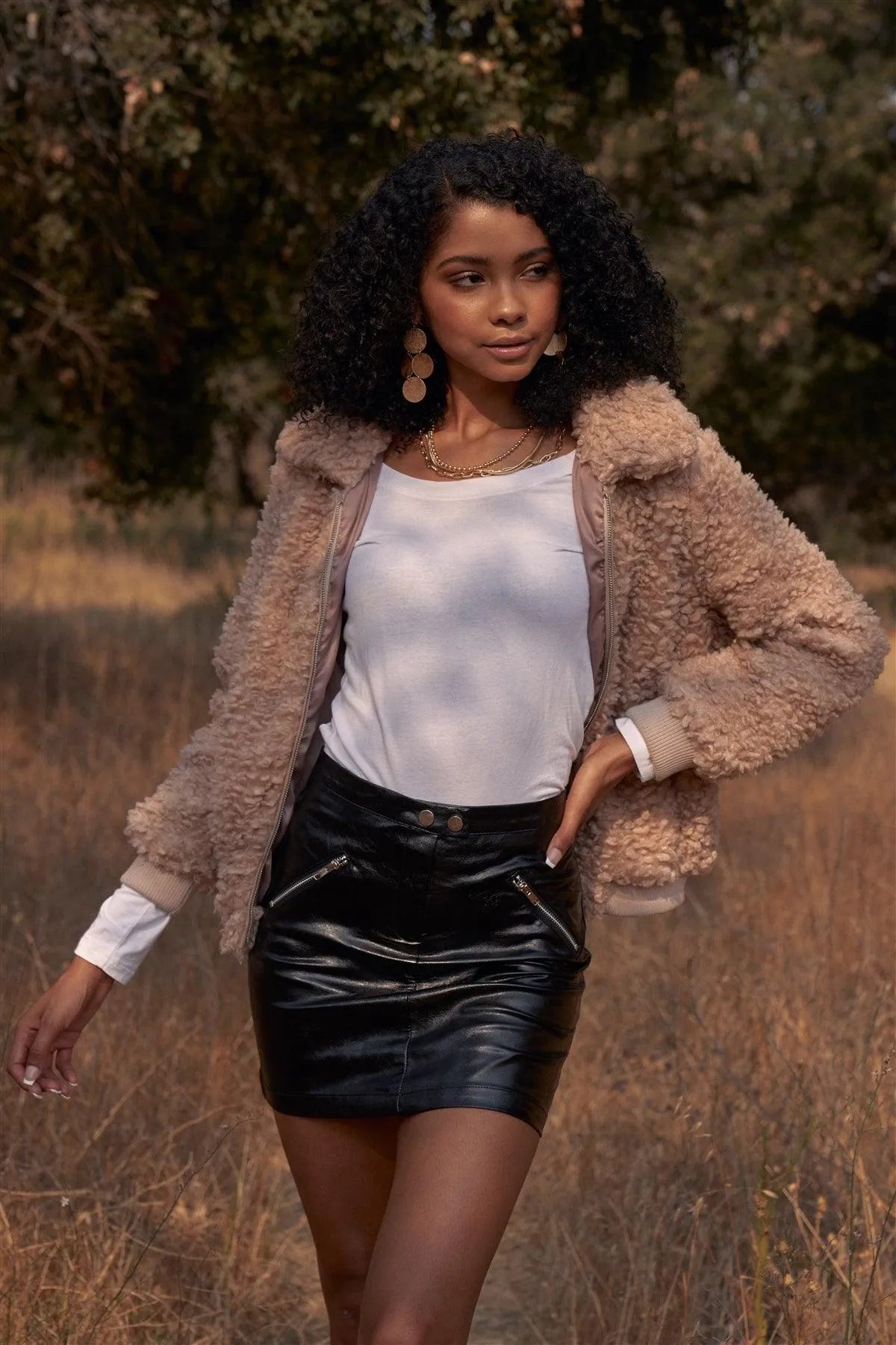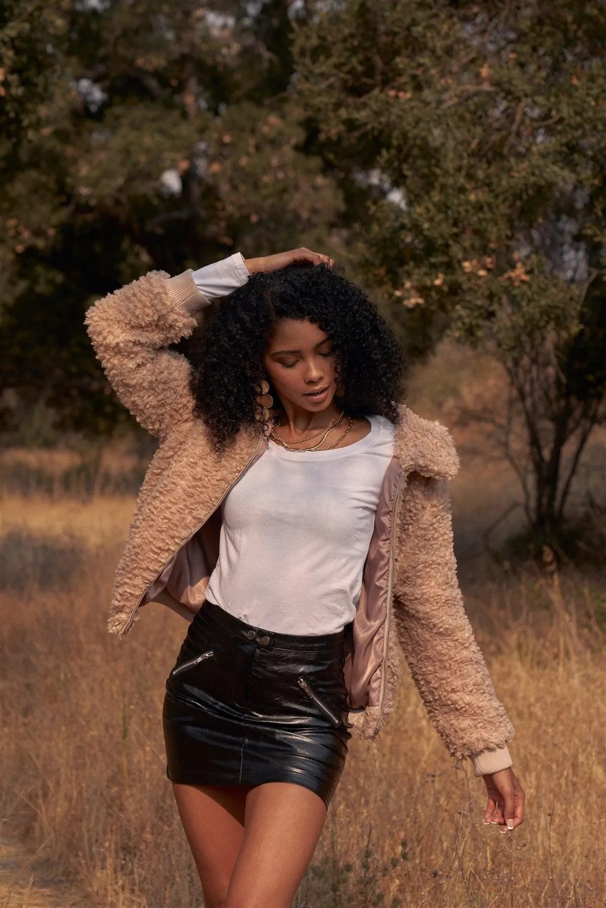 Nude Long Sleeve Zip Front Faux Fur Bomber Jacket /2-3-2