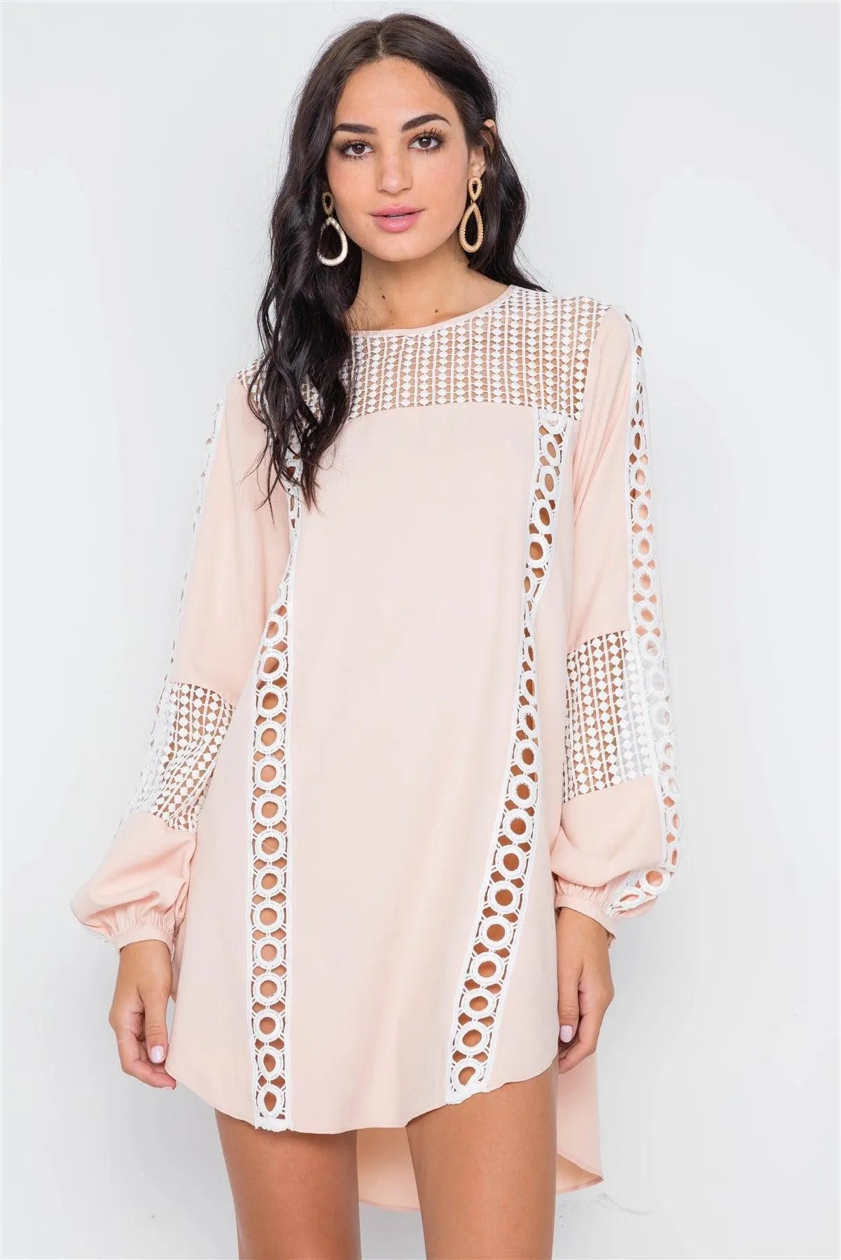 Nude Pink Crochet Trim Long Sleeve Tunic Dress