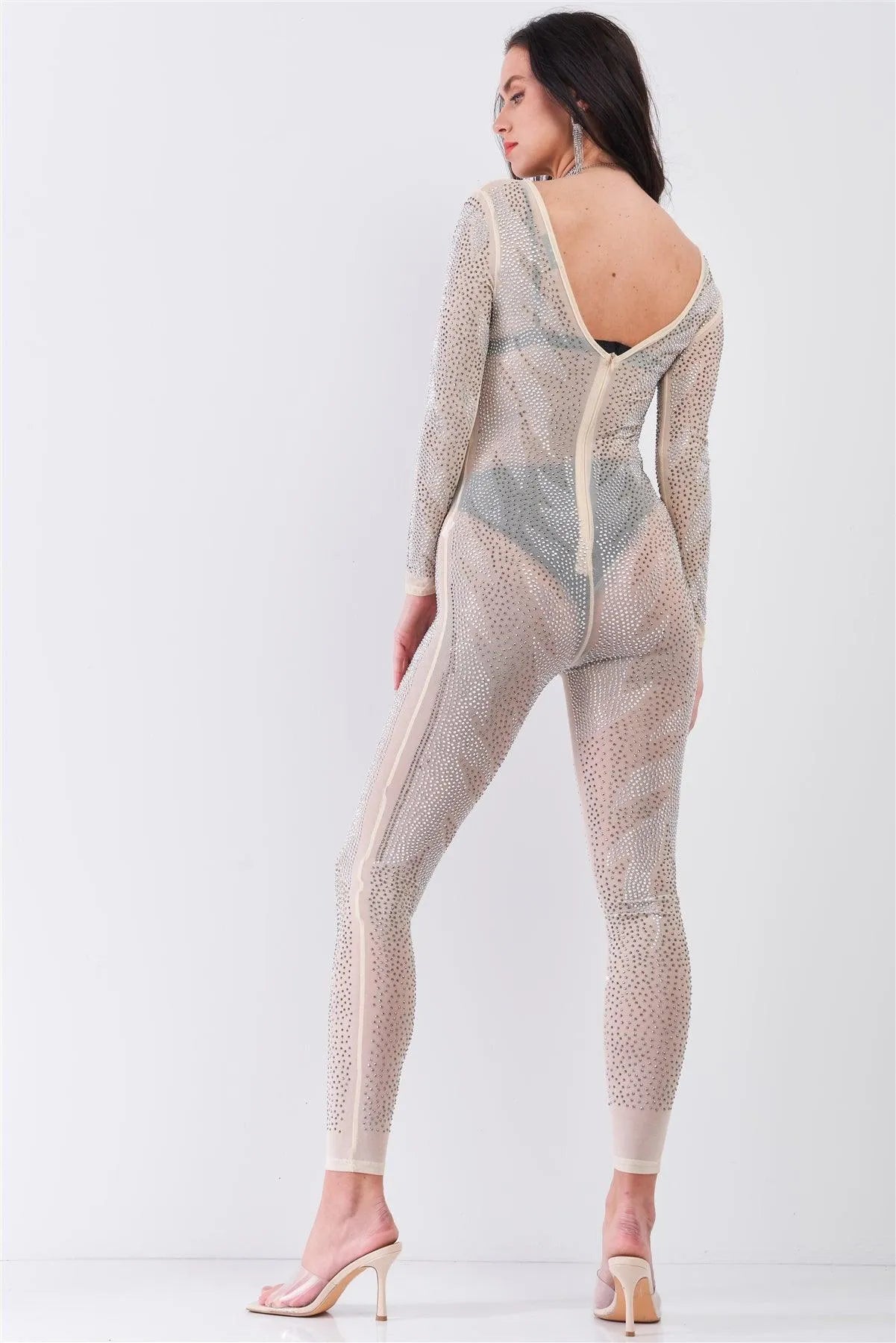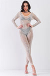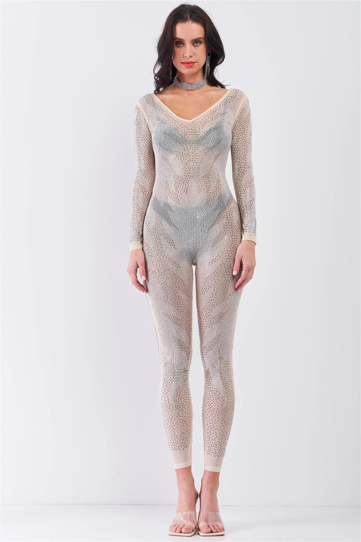 Nude Rhinestone Sheer Long Sleeve Bodycon Jumpsuit